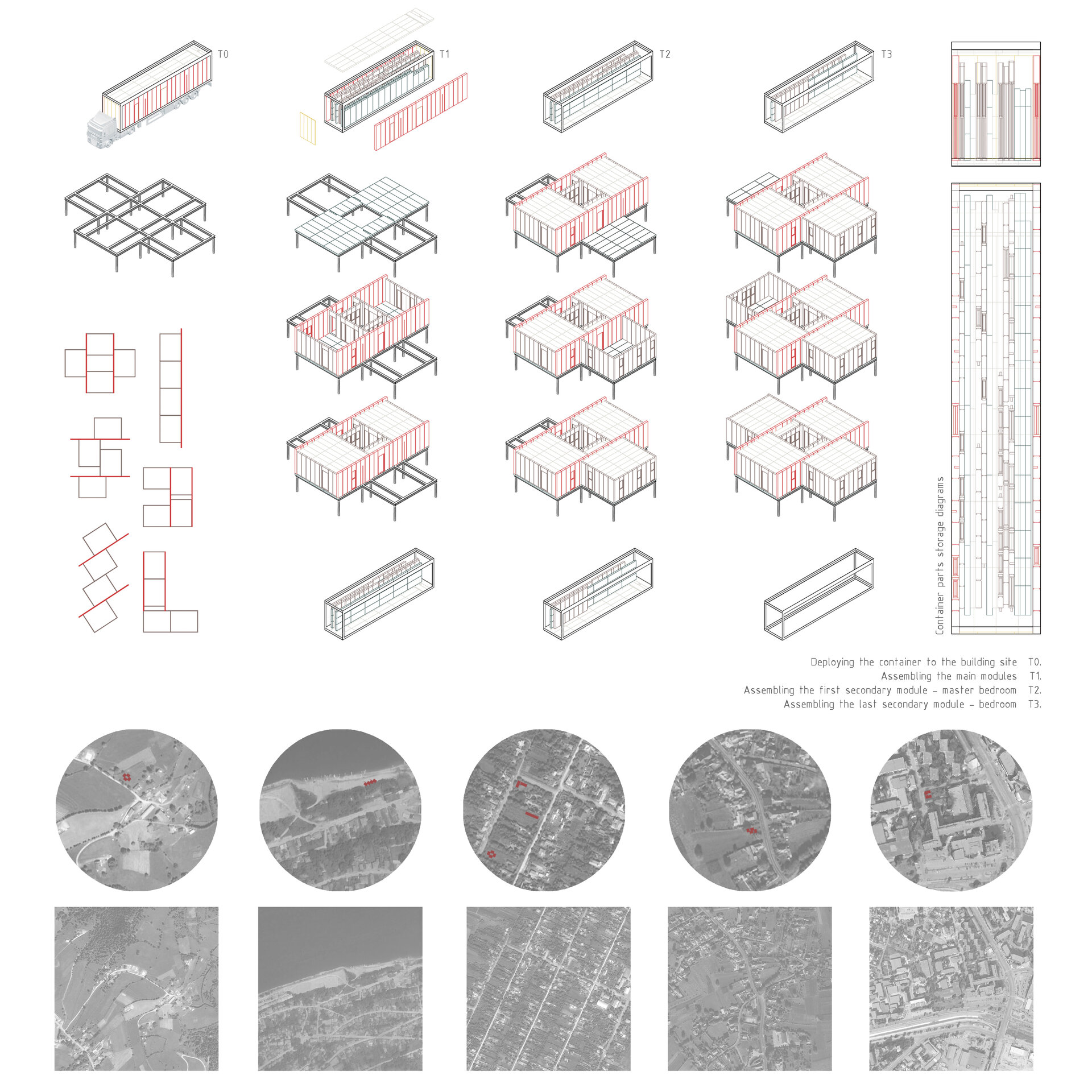 Locul fiecărui panou prefabricat în structura containerului și în interiorul acestuia este stabilit cu mare exactitate în așa fel încât - odată începută desfacerea - panourile să fie așezate direct in situ, fără să fie necesară depozitarea lor temporară. Pereții și acoperișul containerului servesc ridicării modulului principal, următoarele panouri necesare finalizării acestuia cât și etapelor care îl succed fiind descărcate în ordinea dispunerii lor în container. Procesul este reversibil, cu respectarea diagramei de dispunere a panourilor în coaja și în interiorul containerului (diagramă asigurată de furnizor).