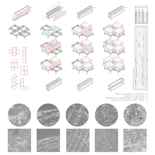 În viziunea unei maximizări a mobilității, proiectul propus se desfășoară în jurul conceptului „Pop-Up”. Ambalajul – un container specific de 12,20 m x 2,40 m x 3,15 m – poate fi demontat și incorporat alături de piesele conținute necesare ridicării casei. Astfel, amabalajul nu este aruncat, ci devine parte a construcției, fiind constiuit din micile piese care se asamblează in situ ca module intermediare (cu structură proprie) – ușor de manevrat la scară umană. Prin utilizarea aceastei game de piese, pot fi realizate partiuri de la cele mai compacte până la cele mai dispersate – versatile și adaptabile în funcție de caracteristicile amplasamentului.