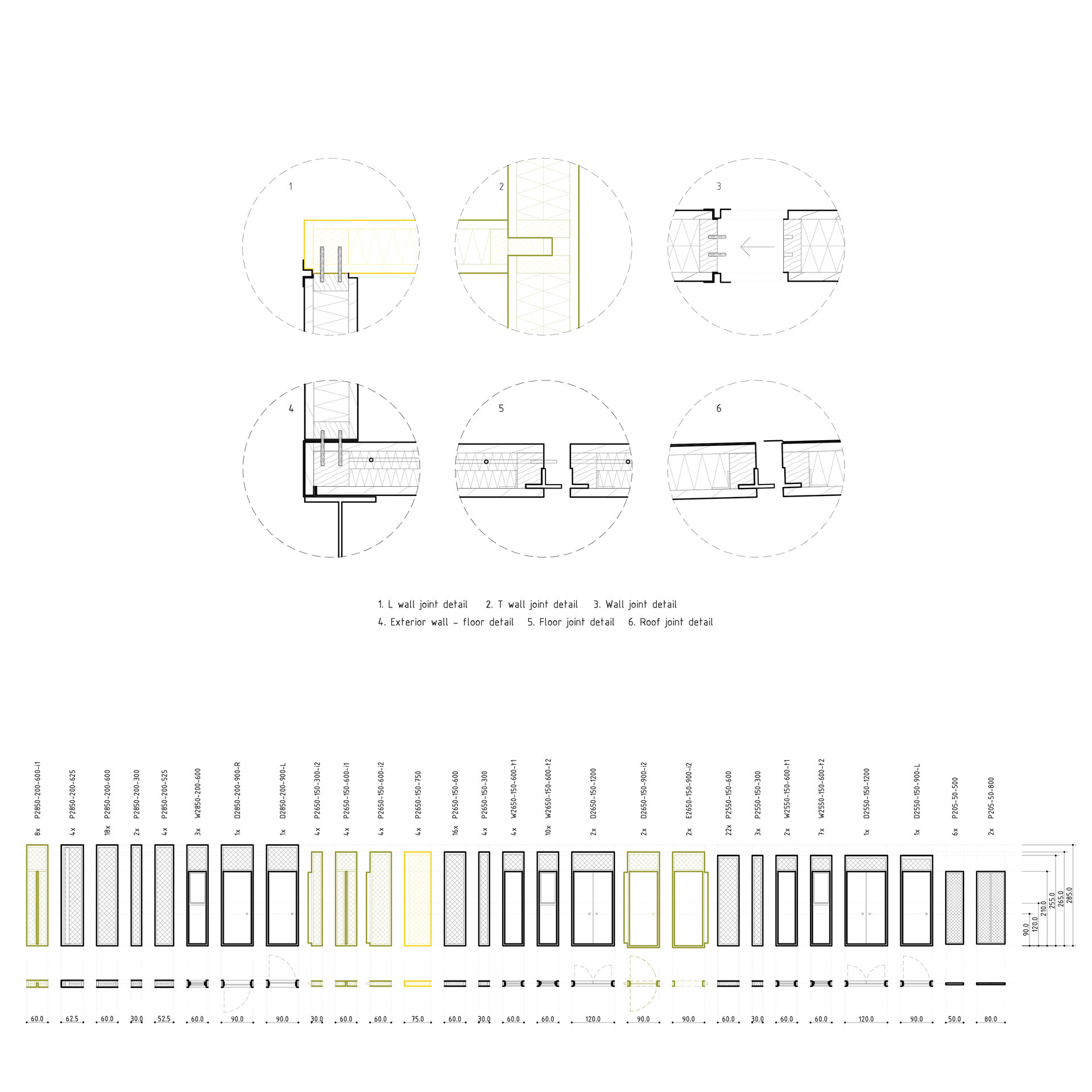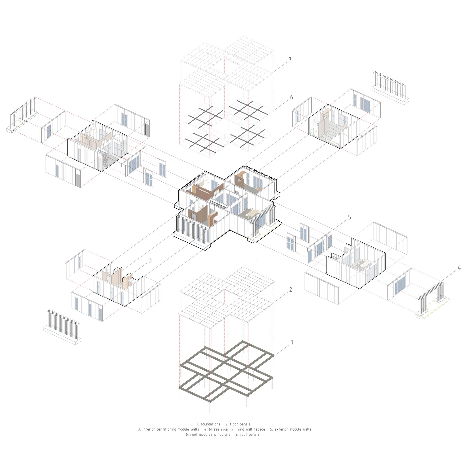 Există 35 de tipuri de piese prefabricate ce se regăsesc atât în conținutul ambalajului (containerului), cât și în interiorul acestuia. Am conceput 27 de tipuri de piese alcătuind pereții (delimitând modulele principale și modulele secundare, piese de îmbinare ori conținând uși sau ferestre) și 8 tipuri de piese care intră în componența acoperișurilor și pardoselilor.