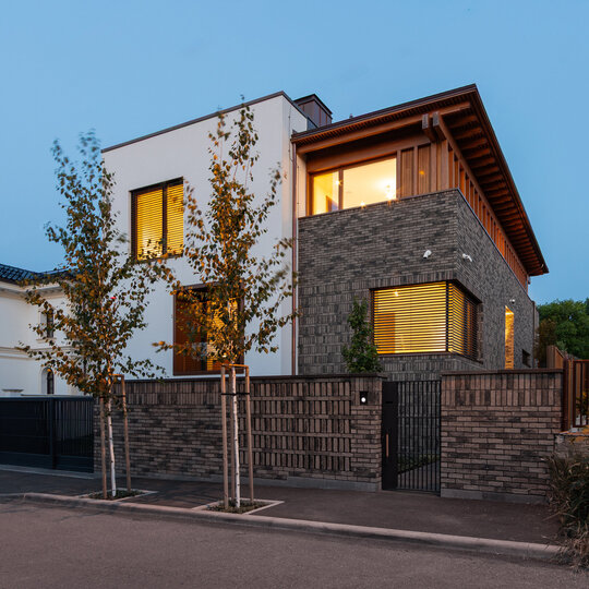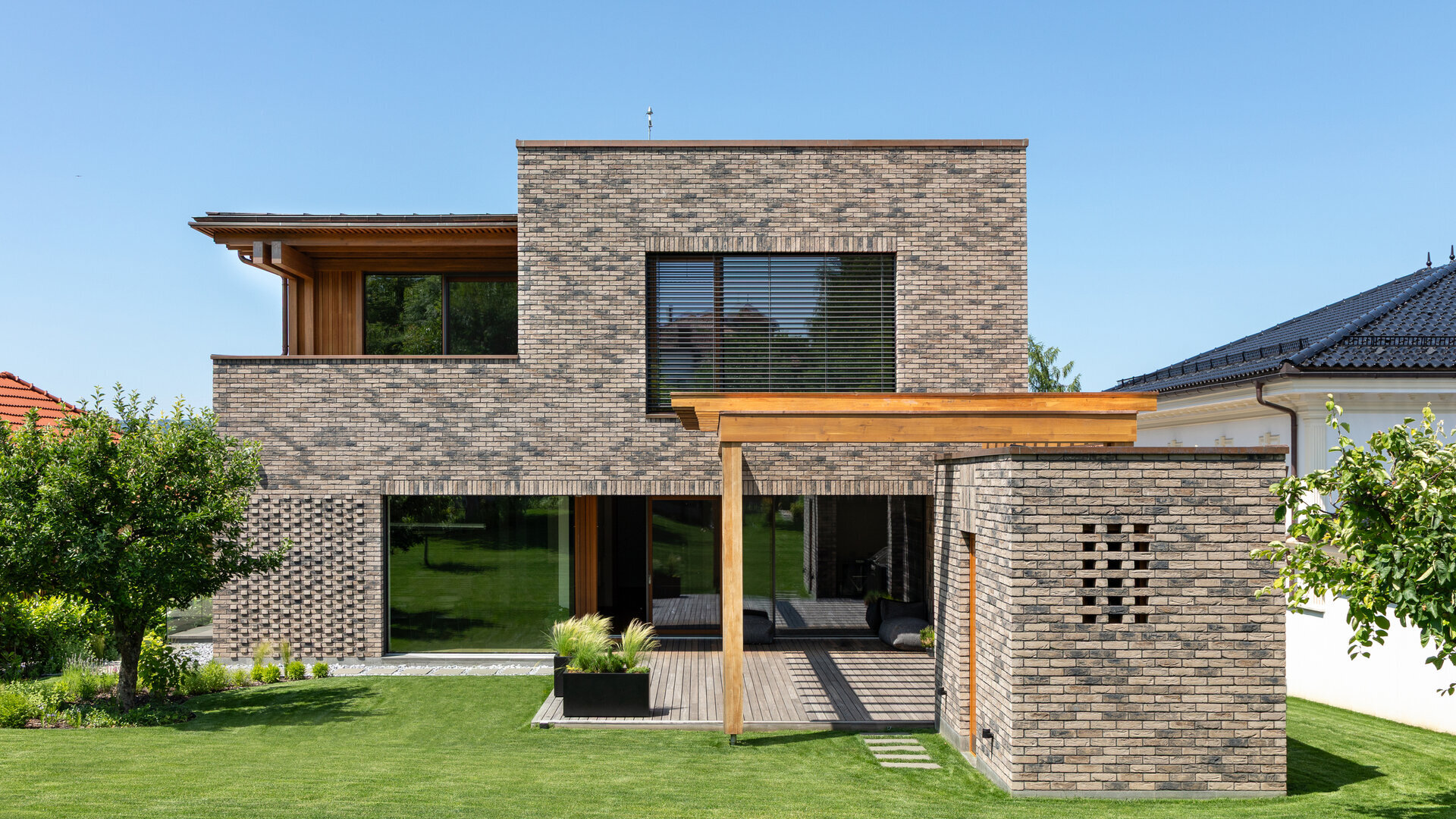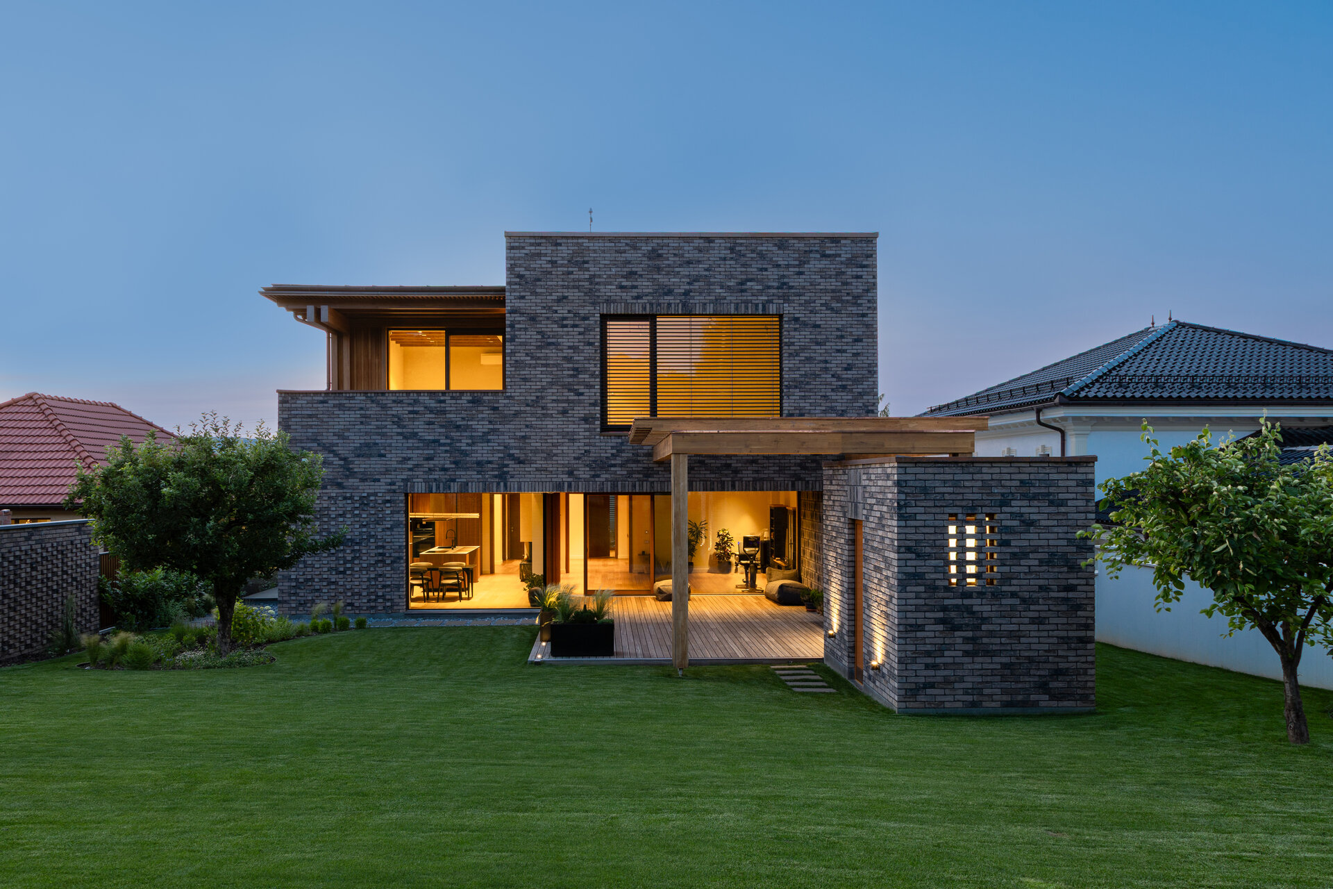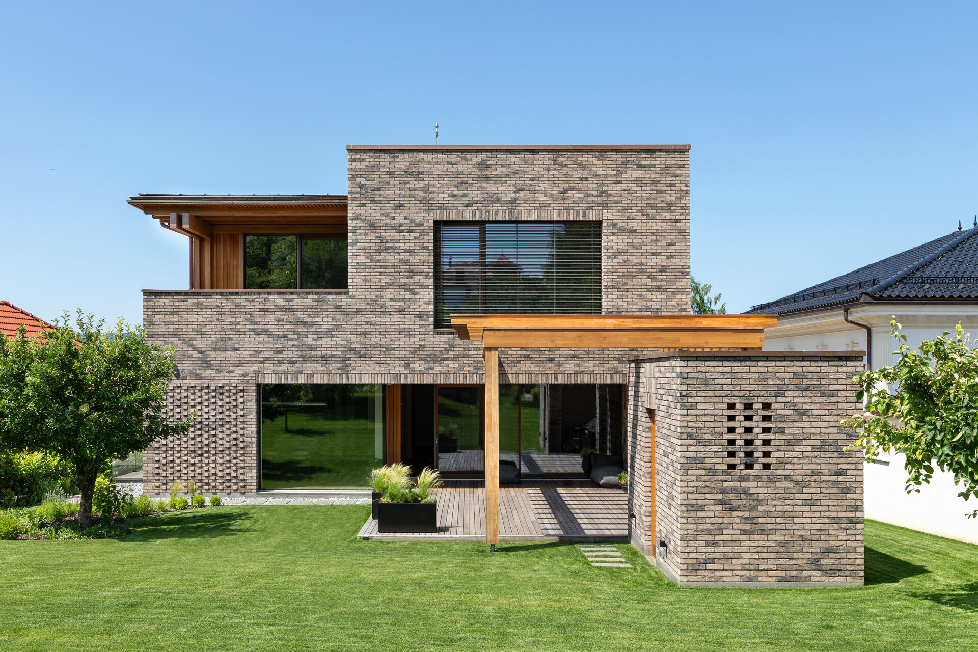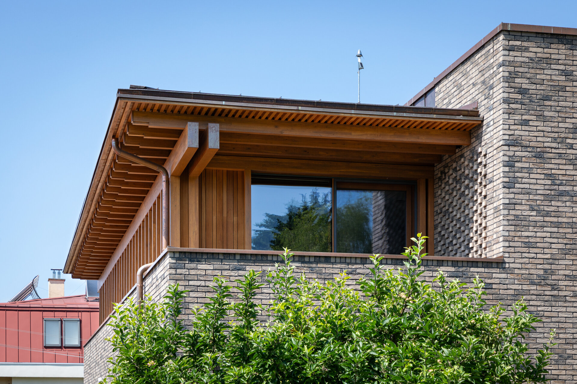 Astfel, combinația dintre tencuiala albă, cărămidă și lemn conferă fațadei o expresie echilibrată și rafinată, în care simplitatea volumului este echilibrată de texturi și materiale care însuflețesc întreaga compoziție.