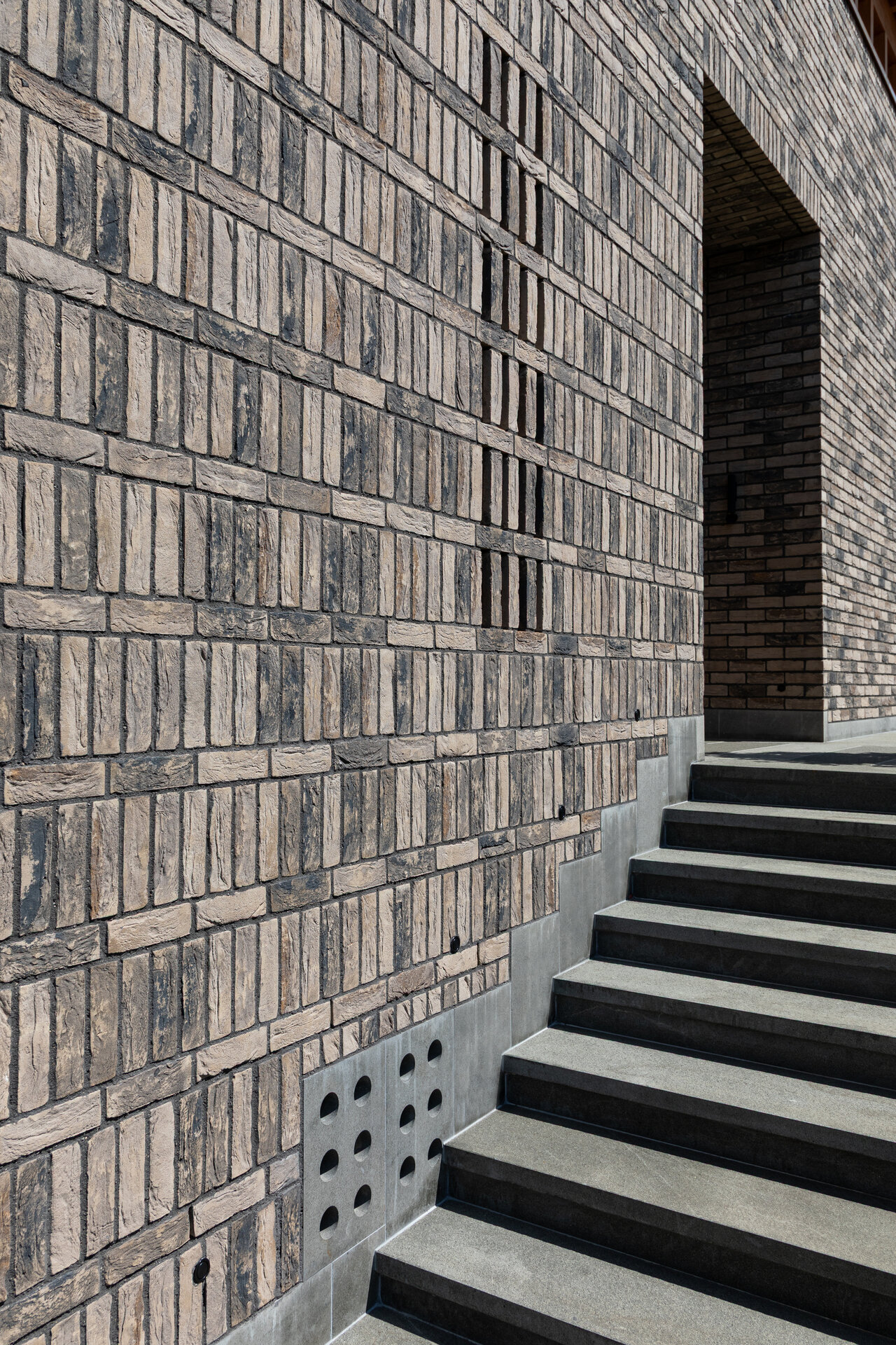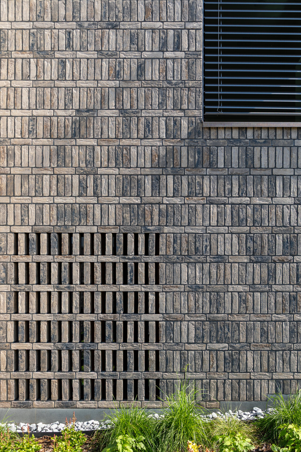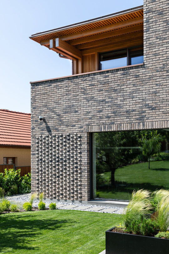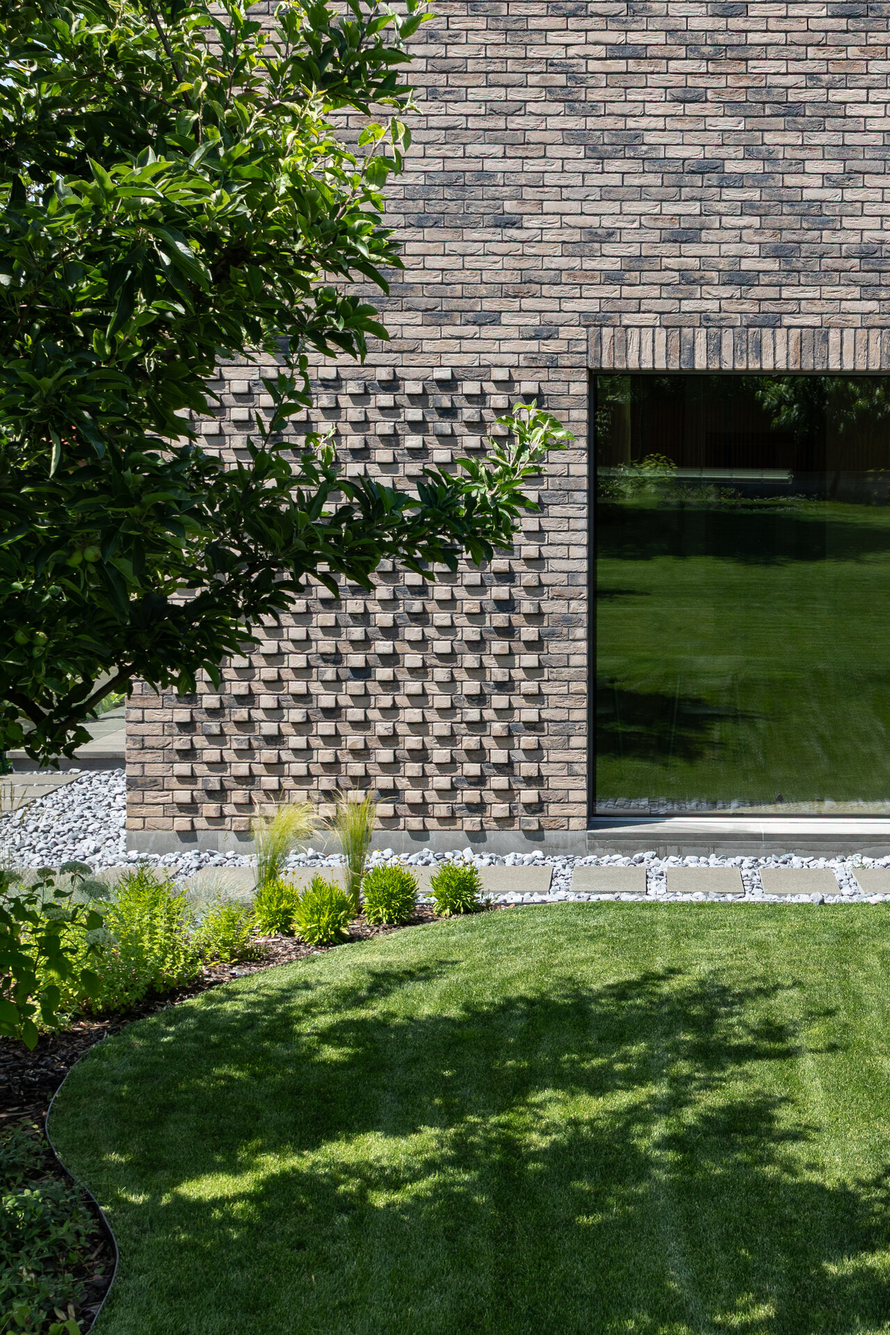 În contrast, volumul placat cu cărămidă prezintă o textură vie și dinamică, rezultată din alternarea modului de dispunere a cărămizii. Această variație subtilă în așezare creează un joc de lumină și umbră care dinamizează fațada, evitând monotonia suprafeței. Compoziția este completată de accente calde de lemn, folosite strategic pentru a rupe masivitatea zidăriei și pentru a adăuga o notă primitoare langă volumul alb, serios.
