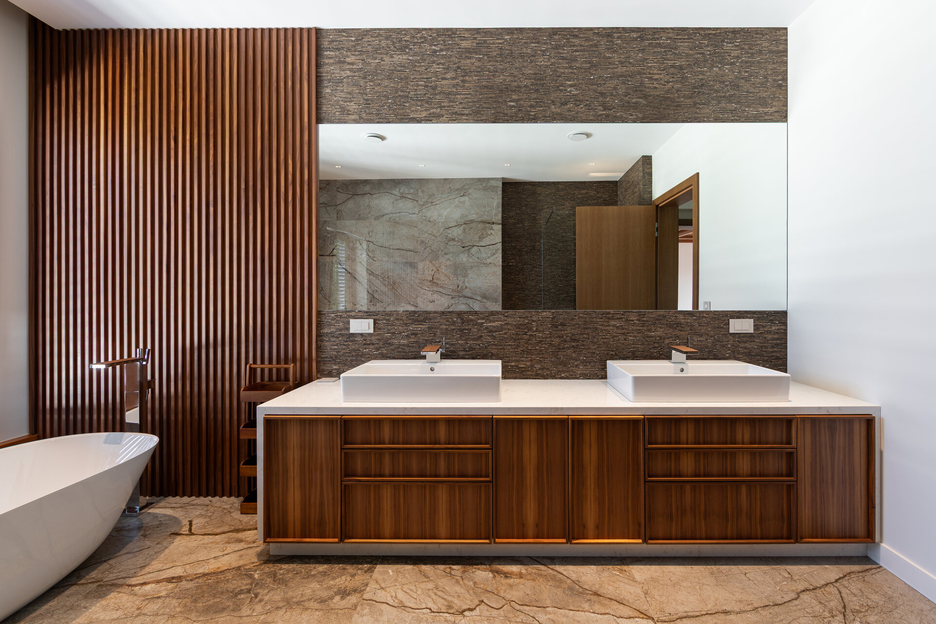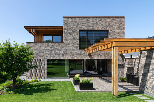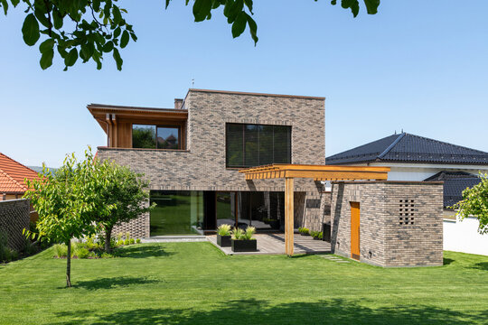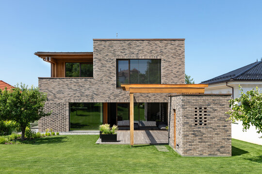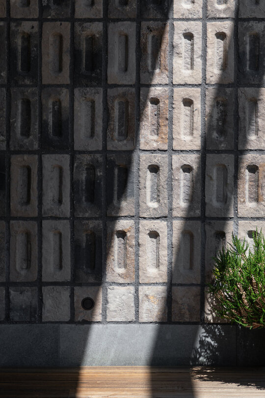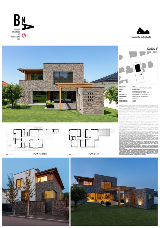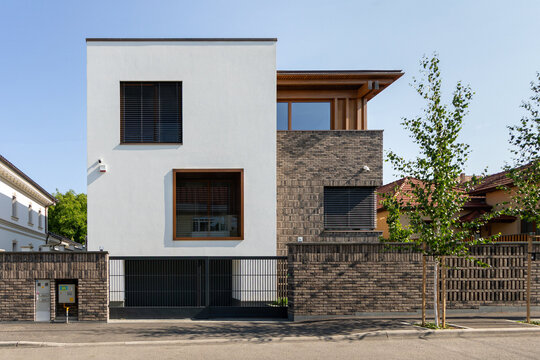 În contrast, volumul placat cu cărămidă prezintă o textură vie și dinamică, rezultată din alternarea modului de dispunere a cărămizii. Această variație subtilă în așezare creează un joc de lumină și umbră care dinamizează fațada, evitând monotonia suprafeței. Compoziția este completată de accente calde de lemn, folosite strategic pentru a rupe masivitatea zidăriei și pentru a adăuga o notă primitoare langă volumul alb, serios.