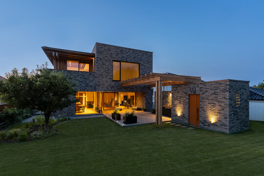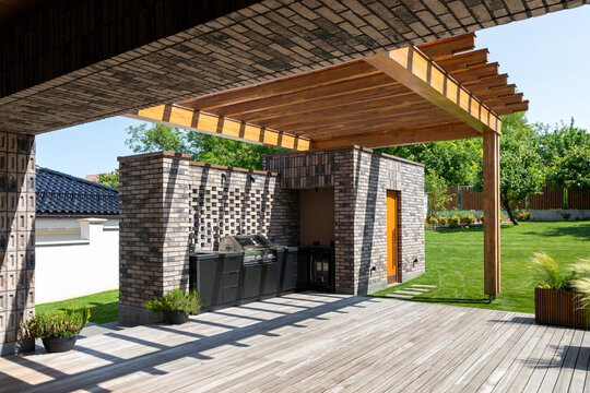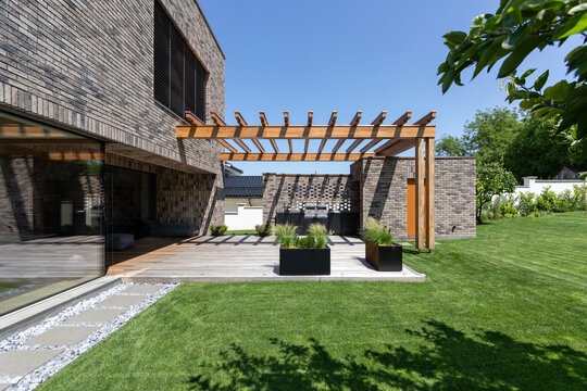 Datorită curții generoase, a fost nevoie de un spațiu dedicat pentru depozitarea utilajelor de grădină, iar pentru a păstra o coerență arhitecturală, acesta este integrat într-un ansamblu care se continuă cu un loc de barbecue și mărginește terasa exterioară. Terasa este articulată în două componente spațiale distincte: un segment acoperit, integrat în volumul construit al casei și o extensie exterioară, deschisă, definită de o pergolă din grinzi de lemn aparente. Aceasta din urmă nu doar protejează parțial spațiul, ci generează un joc de umbre, contribuind la definirea limitelor percepute ale terasei fără a le închide complet.