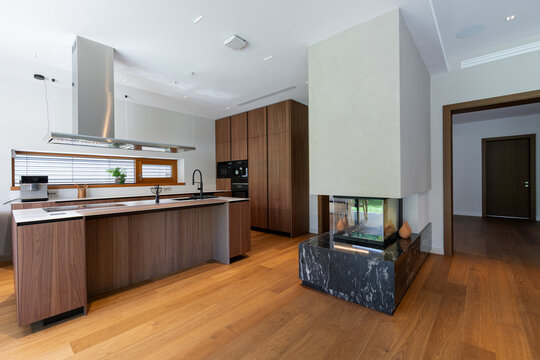 La parter, spațiile principale sunt gândite în jurul unei zone de zi ample și deschise, care integrează livingul și bucătăria într-un flux continuu, fără bariere vizuale sau fizice, accentuând senzația de spațiu deschis și fluiditate. Singurul element ce marchează și structurează acest spațiu este șemineul cu orientare dublă, care funcționează atât ca punct focar vizual, cât și ca separator subtil între zona de living și cea de gătit, dar fără a fragmenta spațiul.