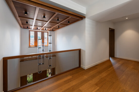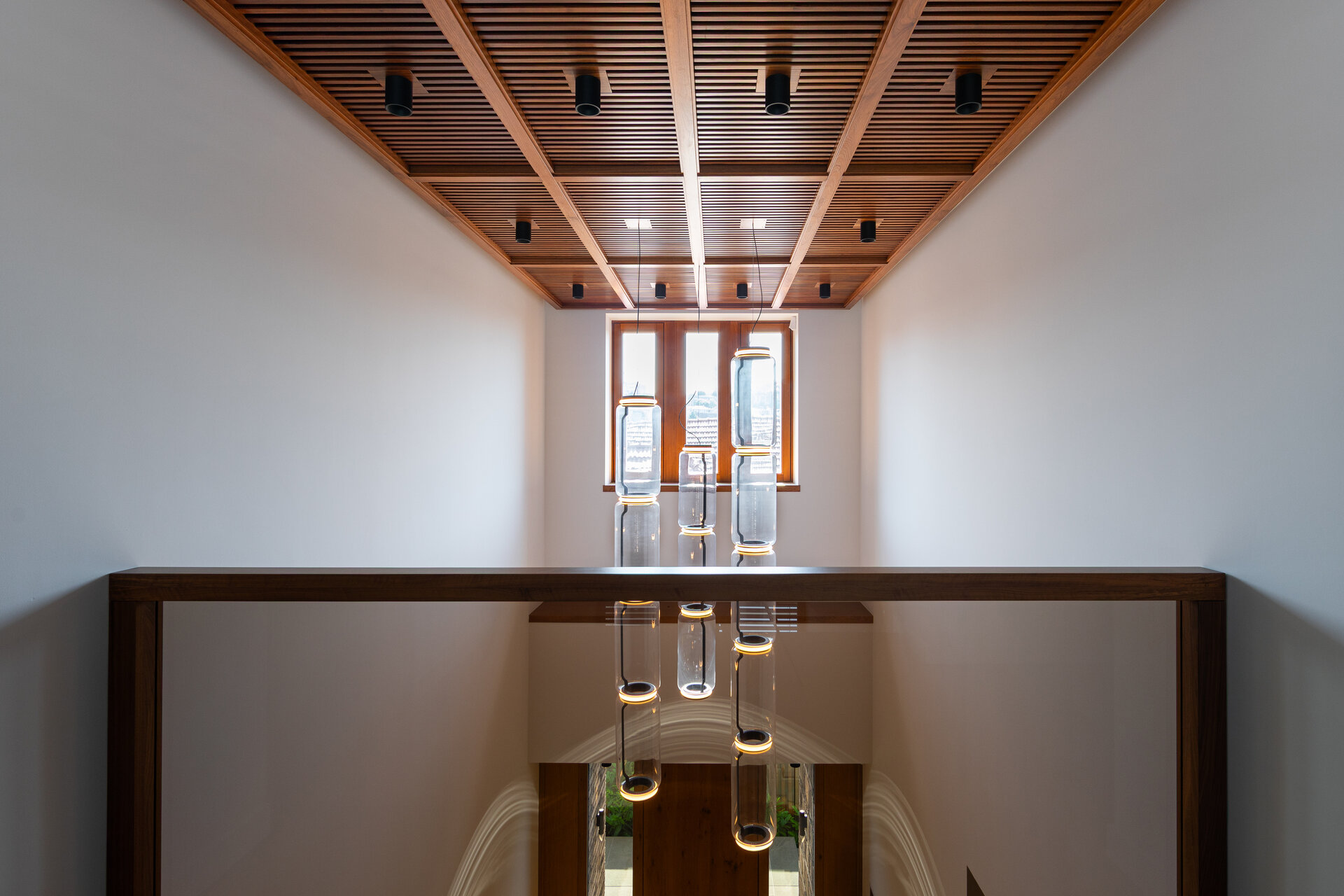 Circulația verticală este un element arhitectural deosebit în această locuință. Holul de la accesul principal comunică cu etajul printr-un spațiu dublu în înălțime, iar scara care face legătura între niveluri devine un obiect de design în sine. Aceasta nu mai este doar un element funcțional, ci o componentă arhitecturală ce definește spațiul, datorită golului generos și proporțiilor atent studiate.