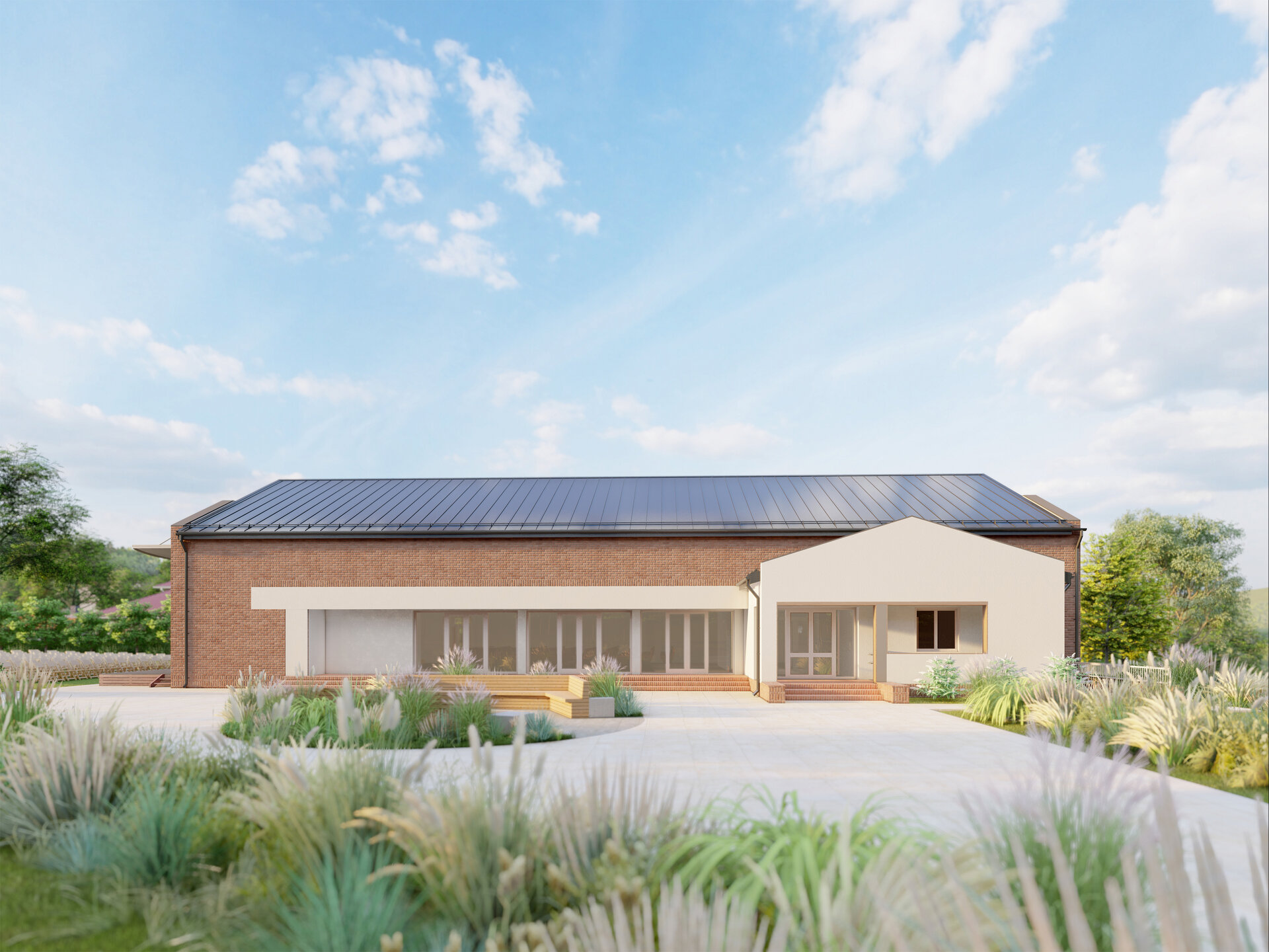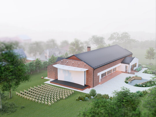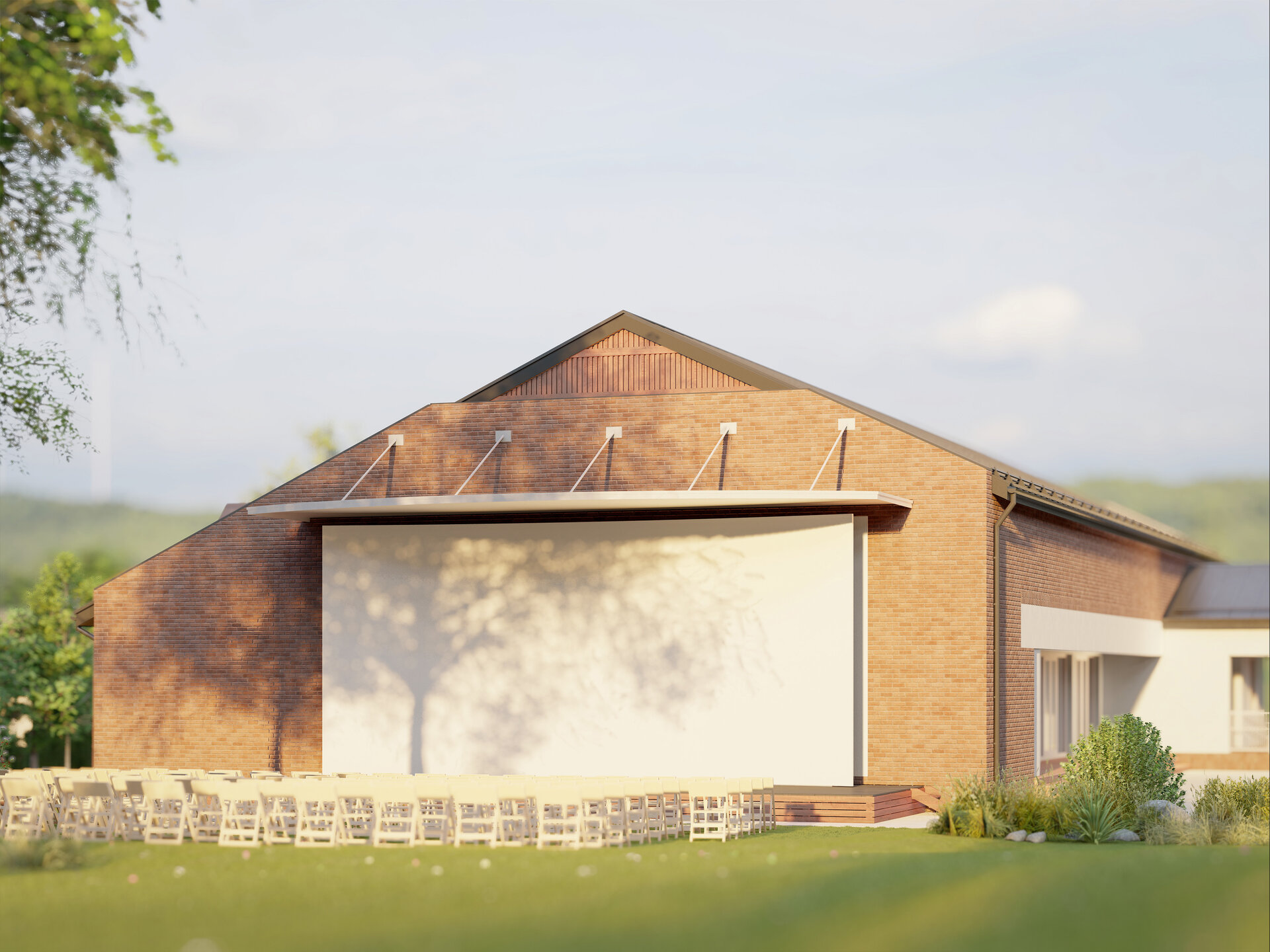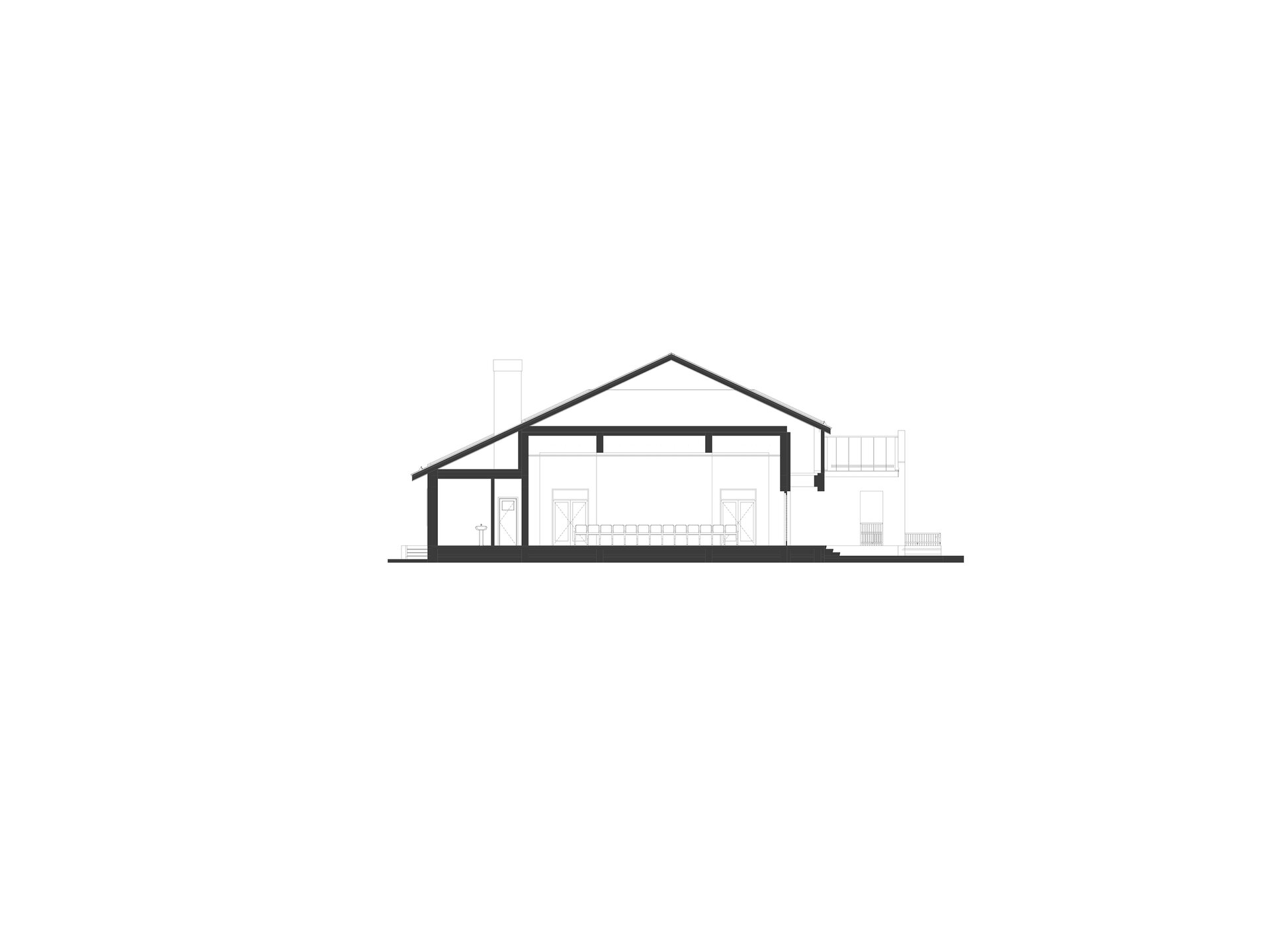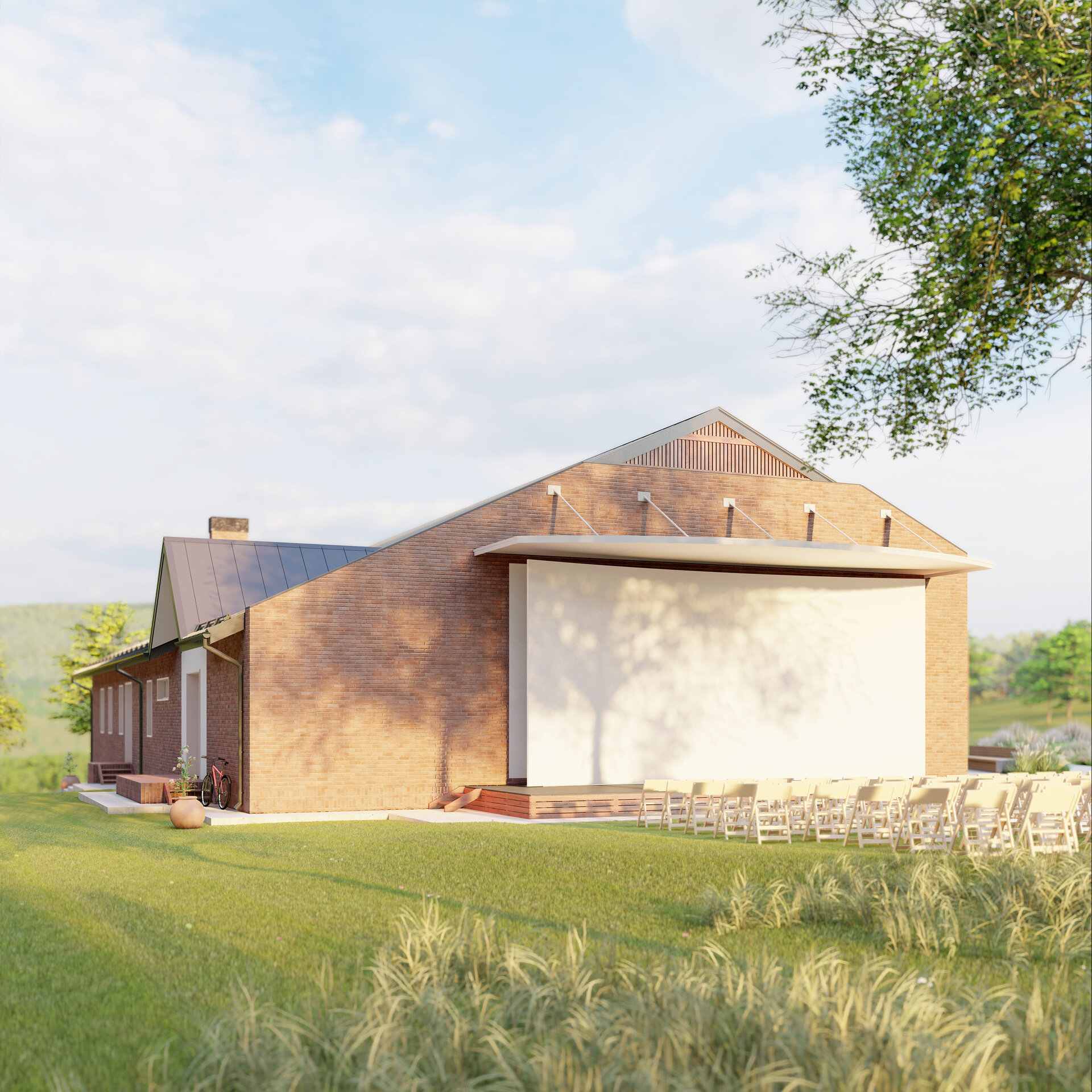 Legătura sălii principale cu exteriorul, marcată printr-o serie de 3 uși duble care se deschid către un pridvor introduce o trimitere subtilă la arhetipurile arhitecturii tradiționale, interpretate în cheie contemporană.