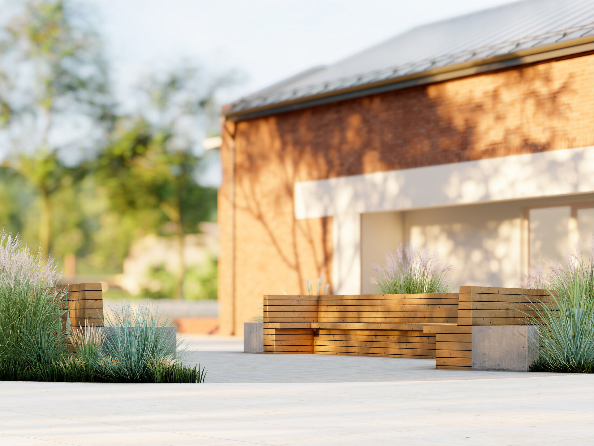 Un element definitoriu al compoziției este reprezentat de scena exterioară, amplasată în laterala clădirii, care permite găzduirea și altor tipuri de evenimente culturale. Aceasta activează terenul din jur și stabilește un dialog cu mediul exterior - ideea de a transforma scena exterioară într-o manifestare extrovertită a spațiilor interioare încurajează folosirea și explorarea celorlalte funcțiuni pe care arhitectura clădirii le are de oferit. Această intenție vine ca reacție critică la absența viziunilor coerente asupra amenajărilor exterioare, frecvent observată în proiectele finanțate din fonduri publice.