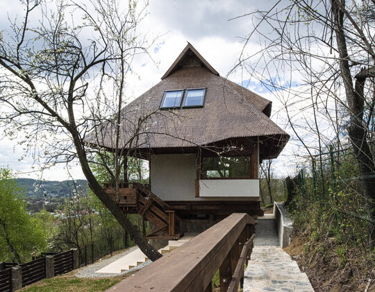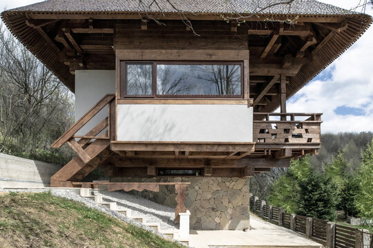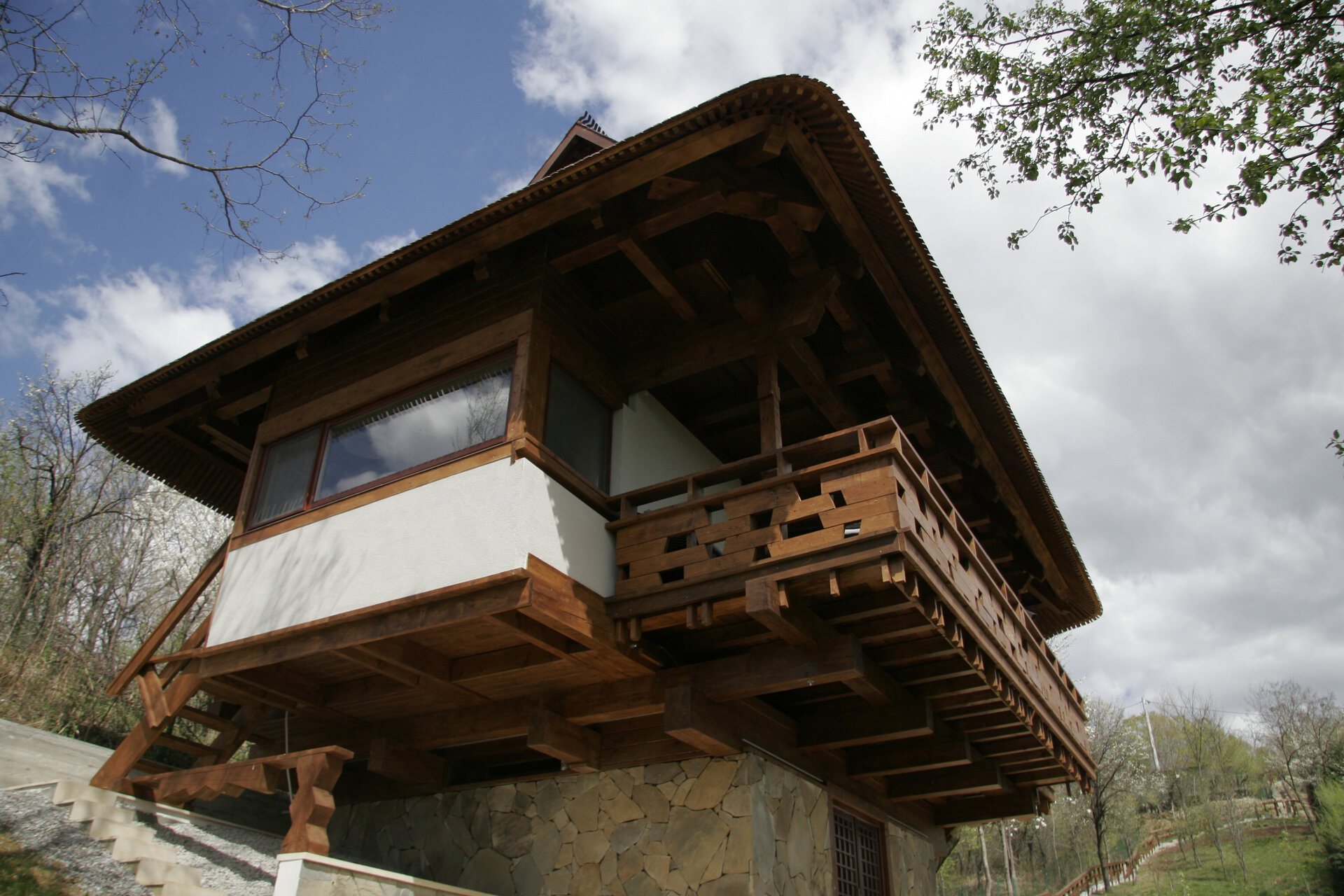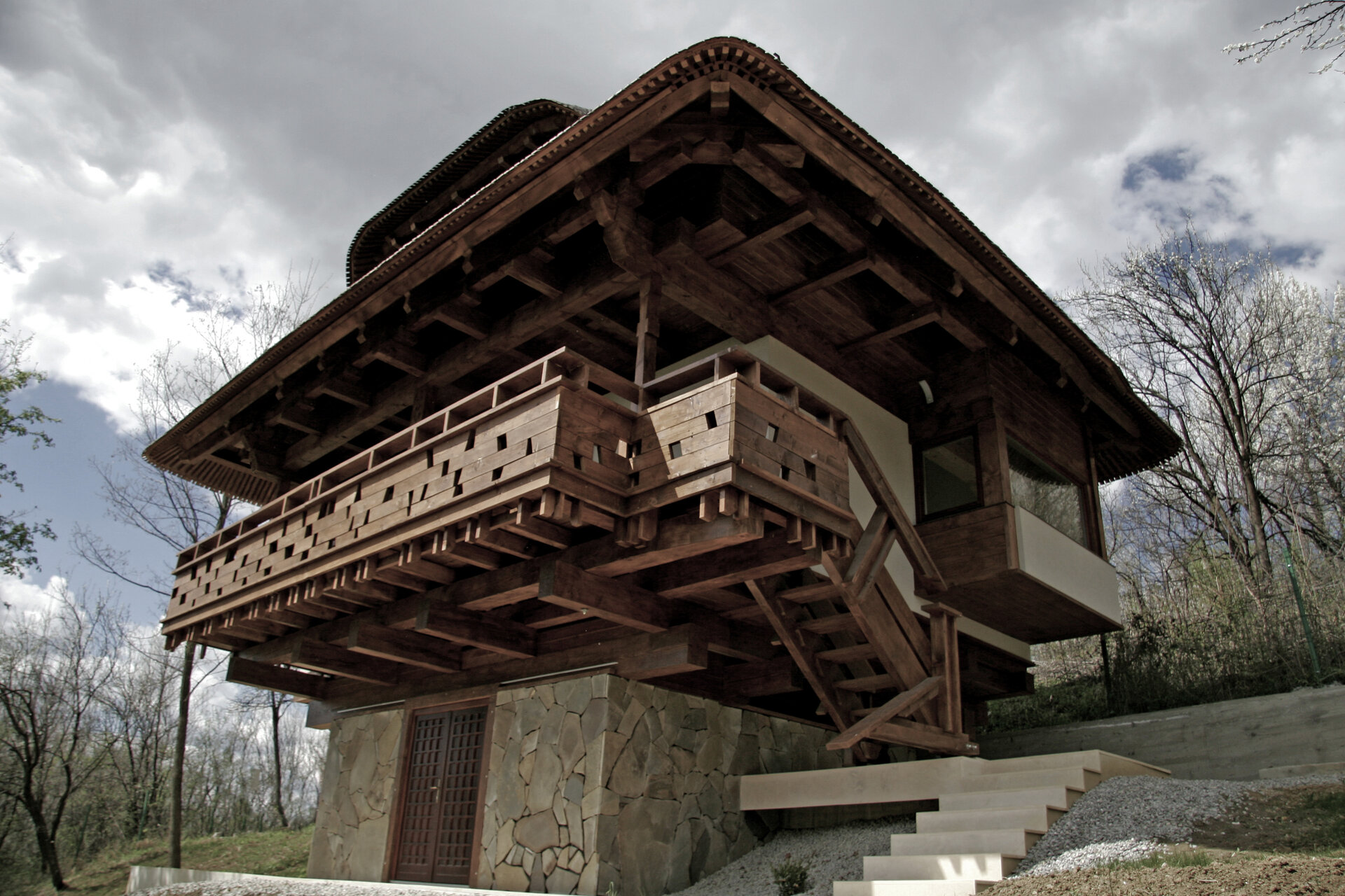 Motivul conceptual al proiectului a fost incercarea de a oferii o alta imagine a arhitecturii traditionale romanesti intr-o mica fuziune dintre modul oltenesc si arhitectura dou-gong specifica Japoniei,Chinei si Coreei. La tarile enumerate din estul indepartat exista maestrii dou-gong prin care s-a transmis din vechime tehnica de a realiza structuri de lemn cu multiple niveluri fara a fi licentiatii unei universitati de profil.Aceste structuri au integrate in concept si modul de a raspunde sarcinilor dinamice induse de seisme cu magnitudine mare. Exista o asemanarea intre acesti maestrii dou-gong si brandul de “mesteri maramureseni” si aceasta ar fi, prin extrapolare, cam ca aceea intre judo si tranta populara. (ne referim aici numai la tehnica si nu la simboluri, cultura, etc.)