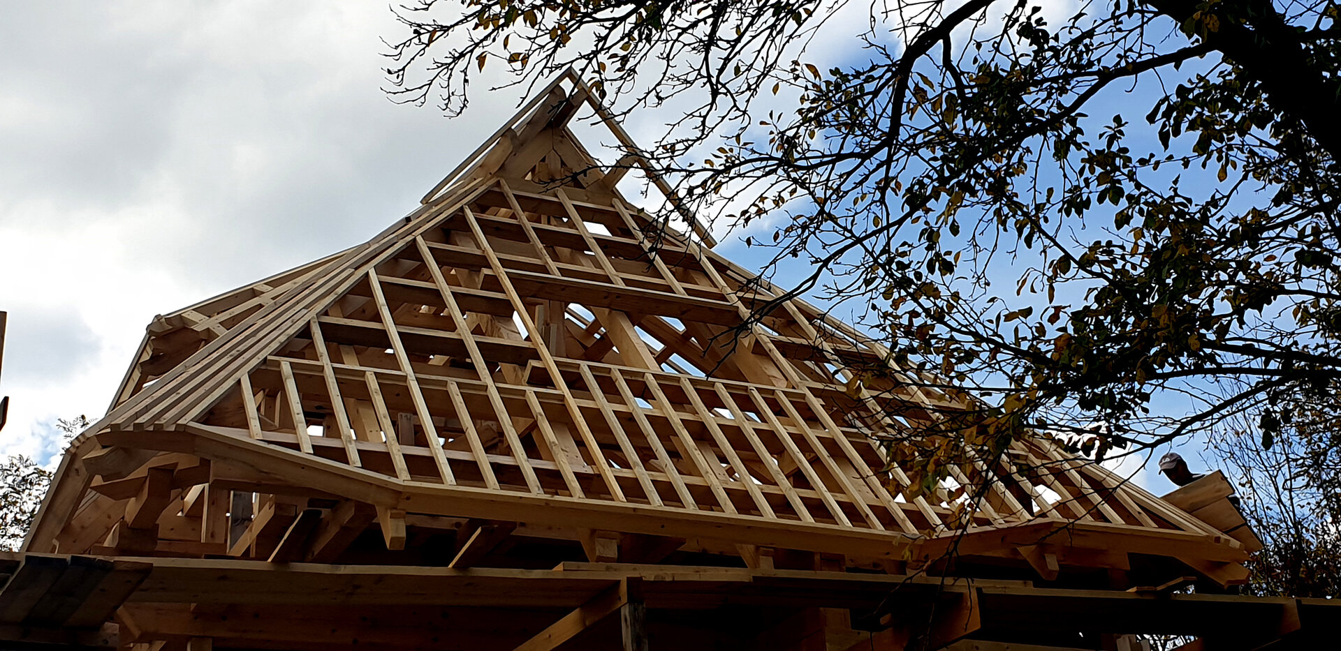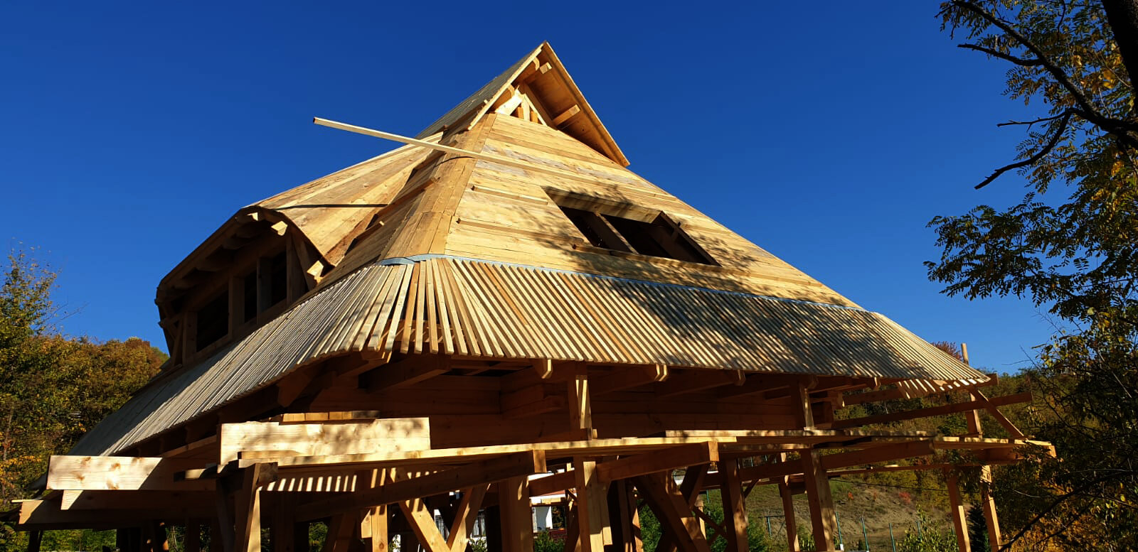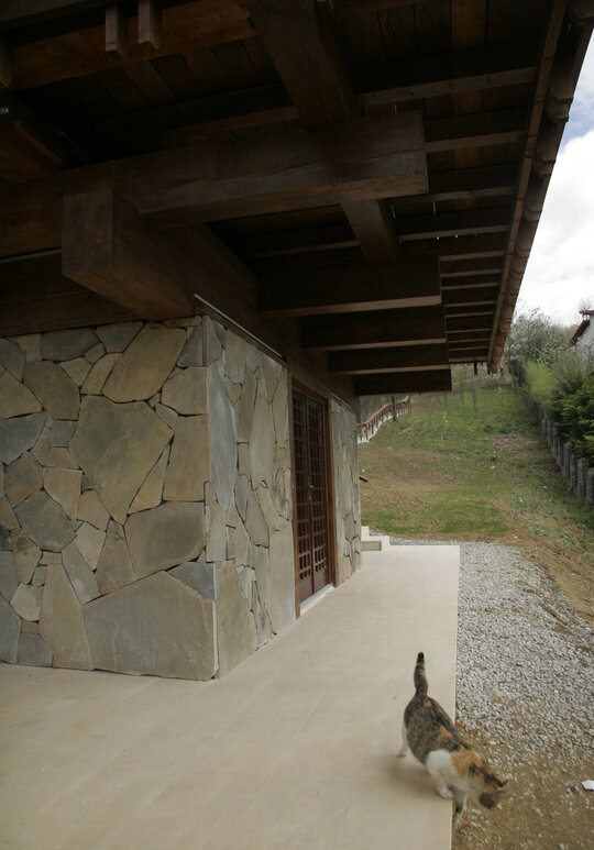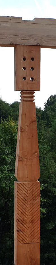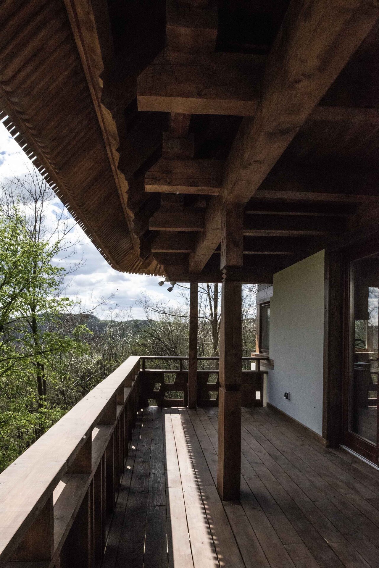 Sa revenim la arhitectura arhaica “taraneasca” cu intelepciunea si autenticitatea ei si sa punem in evidenta un concept oltenesc in care grinda logitudinala a prispei este sustinuta mai mult de grinzile masive de lemn ce vin din peretii transversali ai casei si mai putin de stalpii prispei. E cazul celor doi stalpi de larice marginali si exclude cazul stalpului central ce sustine direct grinda pentru a nu fragmenta spatiul interior. Peste acesta grinda transversala vin niste grinzi perpendiculare ce spre exterior capata sensul de gong caci peste acestea vin cele sapte dou-ri ce poarta o grinda longitudinala secundara. Rolul acestor suprapuneri structurale este si acela de a ridica cota sarpantei si a expune vizual mai pregnant grinda principala longitudinala care in multe cazuri sta in umbra cu toate ca aceasta poate avea mesaje si prelucrari artistice specifice. Sarpanta protejeaza generos peretii si prispa casei (acel spatiu engawa la Japonezi).