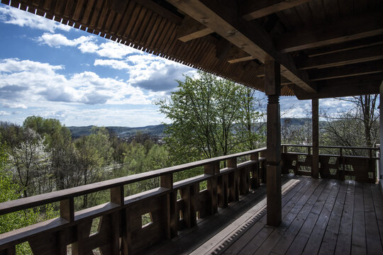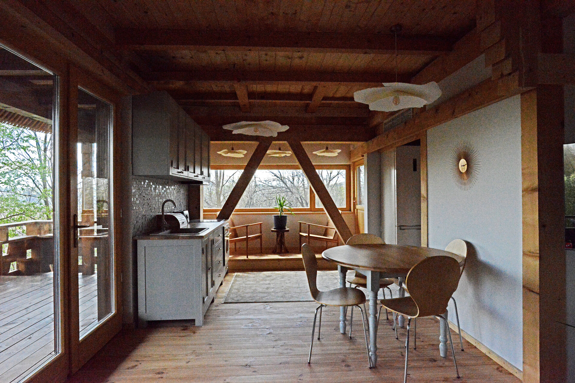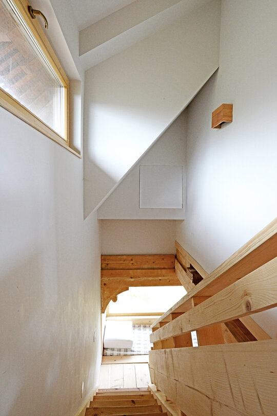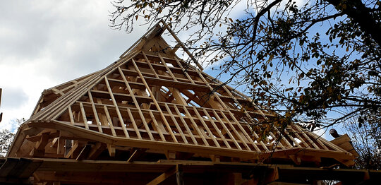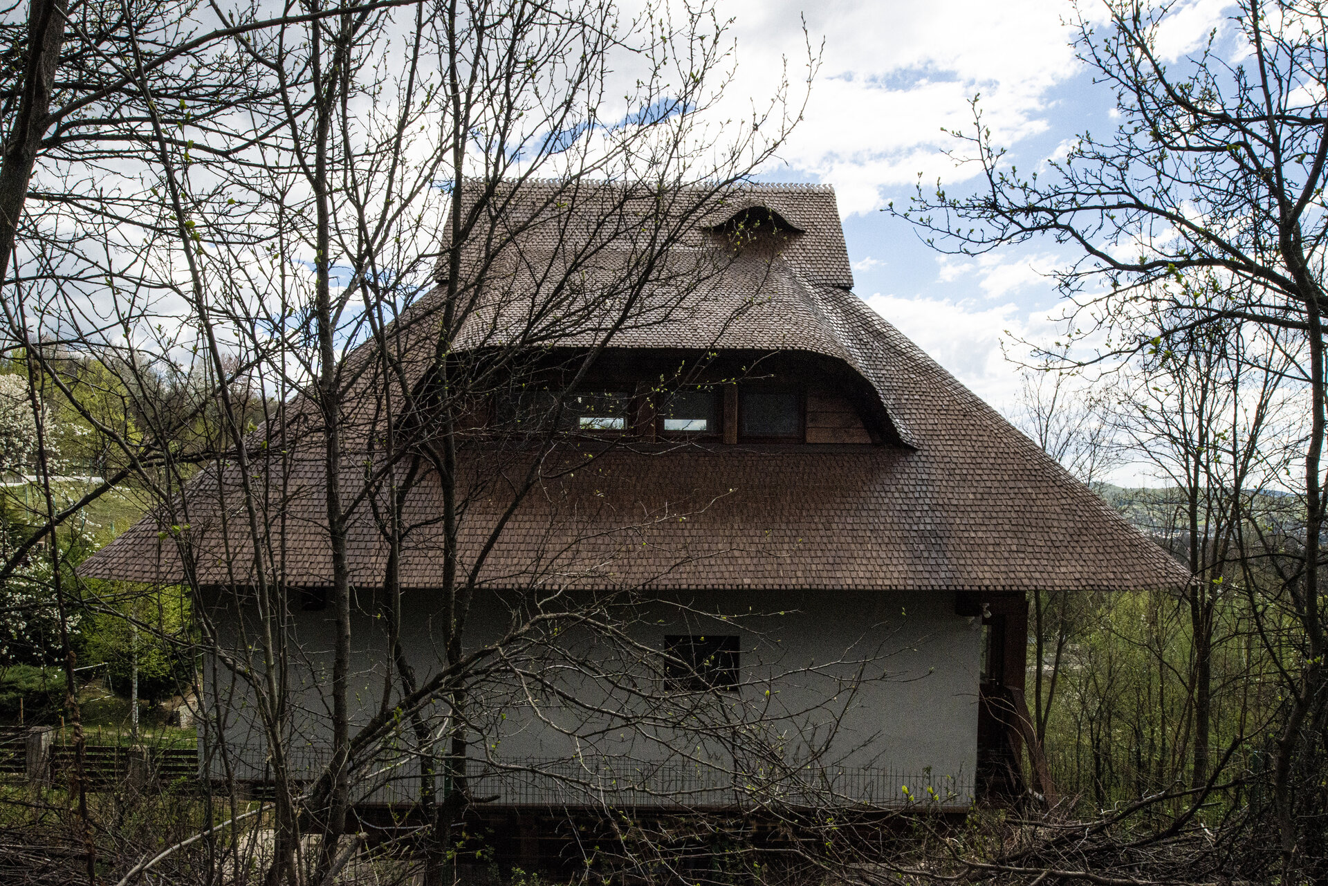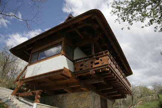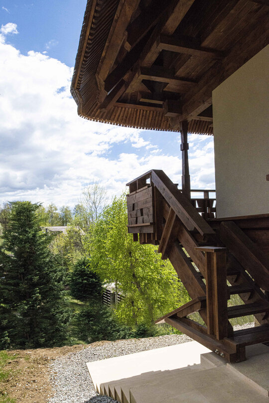 Sa revenim la arhitectura arhaica “taraneasca” cu intelepciunea si autenticitatea ei si sa punem in evidenta un concept oltenesc in care grinda logitudinala a prispei este sustinuta mai mult de grinzile masive de lemn ce vin din peretii transversali ai casei si mai putin de stalpii prispei. E cazul celor doi stalpi de larice marginali si exclude cazul stalpului central ce sustine direct grinda pentru a nu fragmenta spatiul interior. Peste acesta grinda transversala vin niste grinzi perpendiculare ce spre exterior capata sensul de gong caci peste acestea vin cele sapte dou-ri ce poarta o grinda longitudinala secundara. Rolul acestor suprapuneri structurale este si acela de a ridica cota sarpantei si a expune vizual mai pregnant grinda principala longitudinala care in multe cazuri sta in umbra cu toate ca aceasta poate avea mesaje si prelucrari artistice specifice. Sarpanta protejeaza generos peretii si prispa casei (acel spatiu engawa la Japonezi).