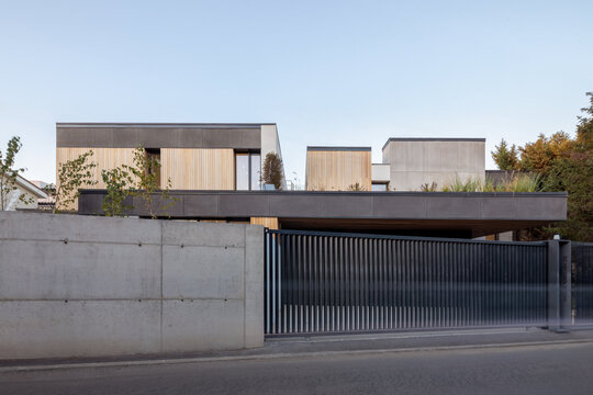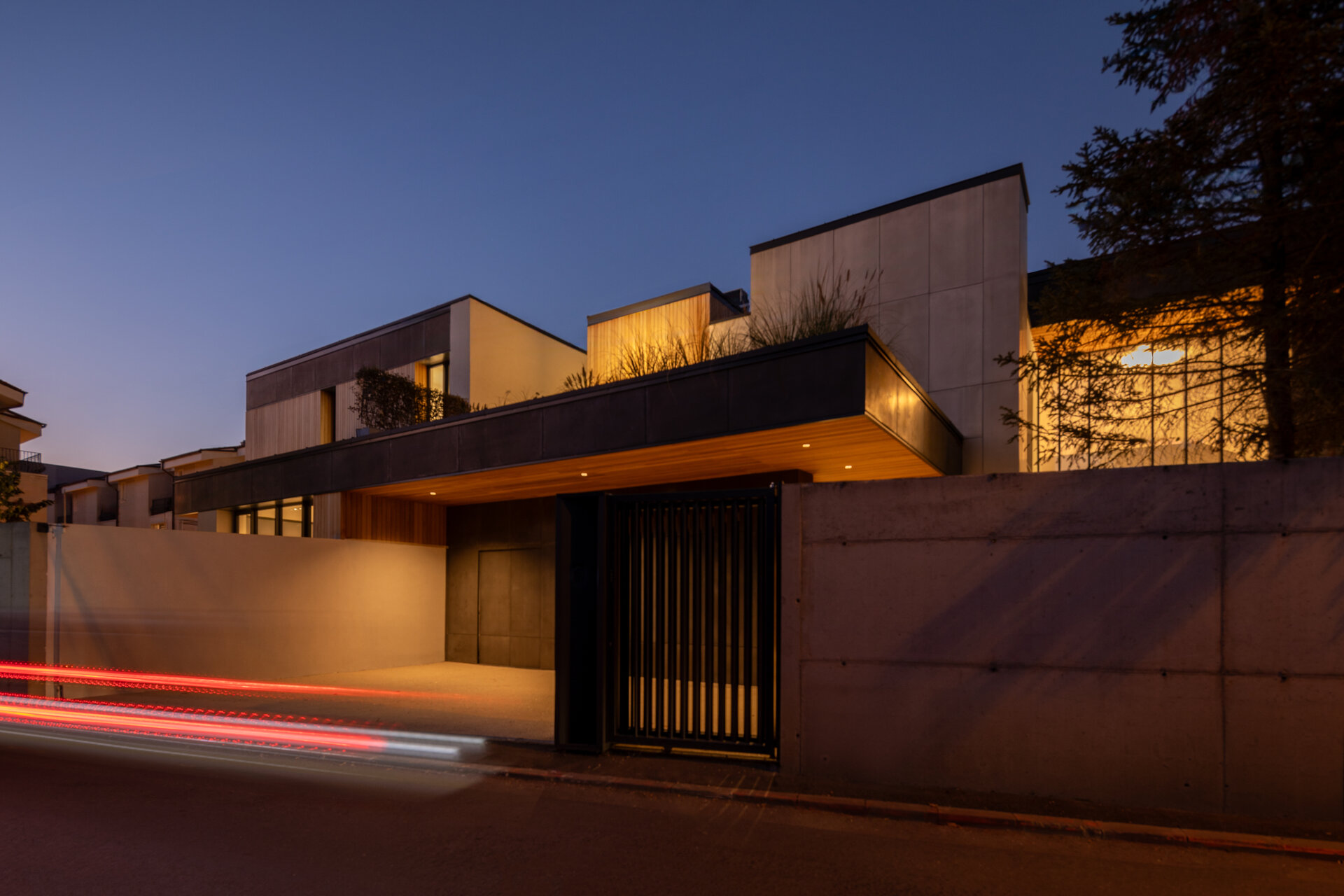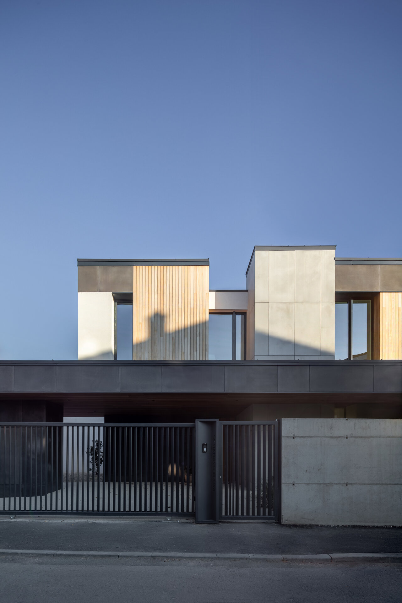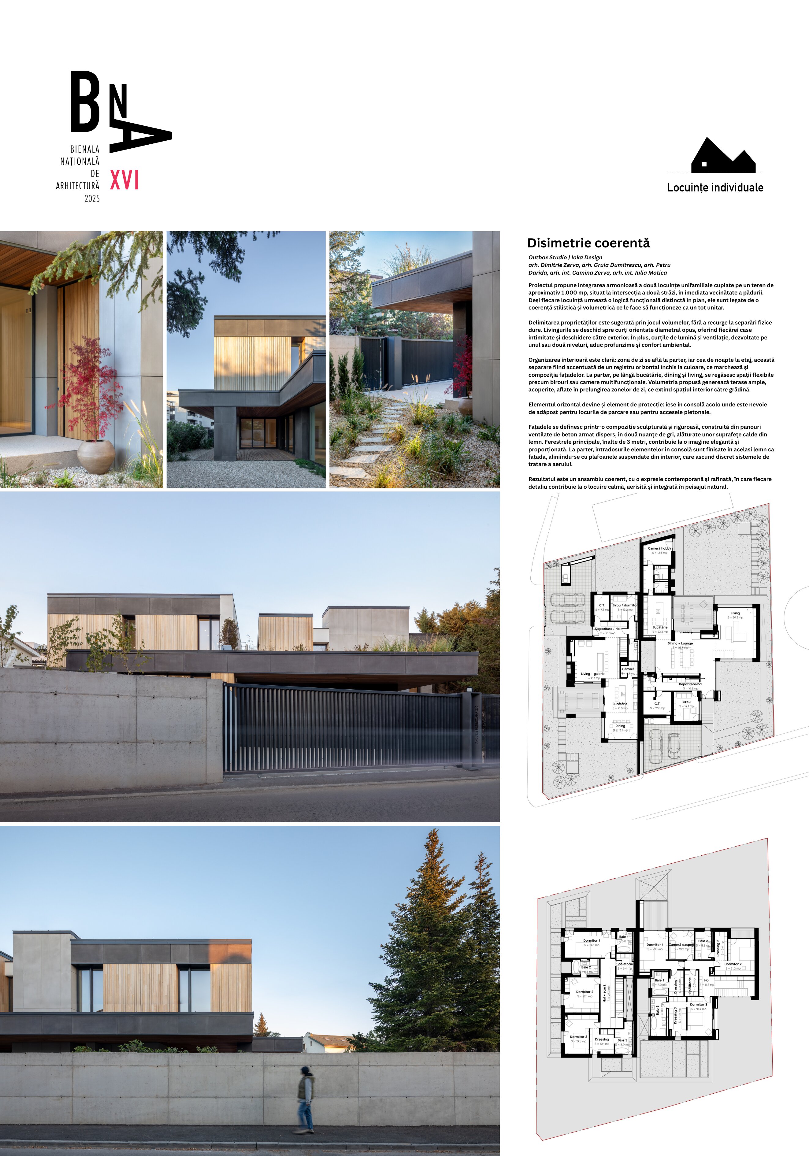 Proiectul propune integrarea armonioasă a două locuințe unifamiliale cuplate pe un teren de aproximativ 1.000 mp, situat la intersecția a două străzi, în imediata vecinătate a pădurii. Deși fiecare locuință urmează o logică funcțională distinctă în plan, ele sunt legate de o coerență stilistică și volumetrică ce le face să funcționeze ca un tot unitar.