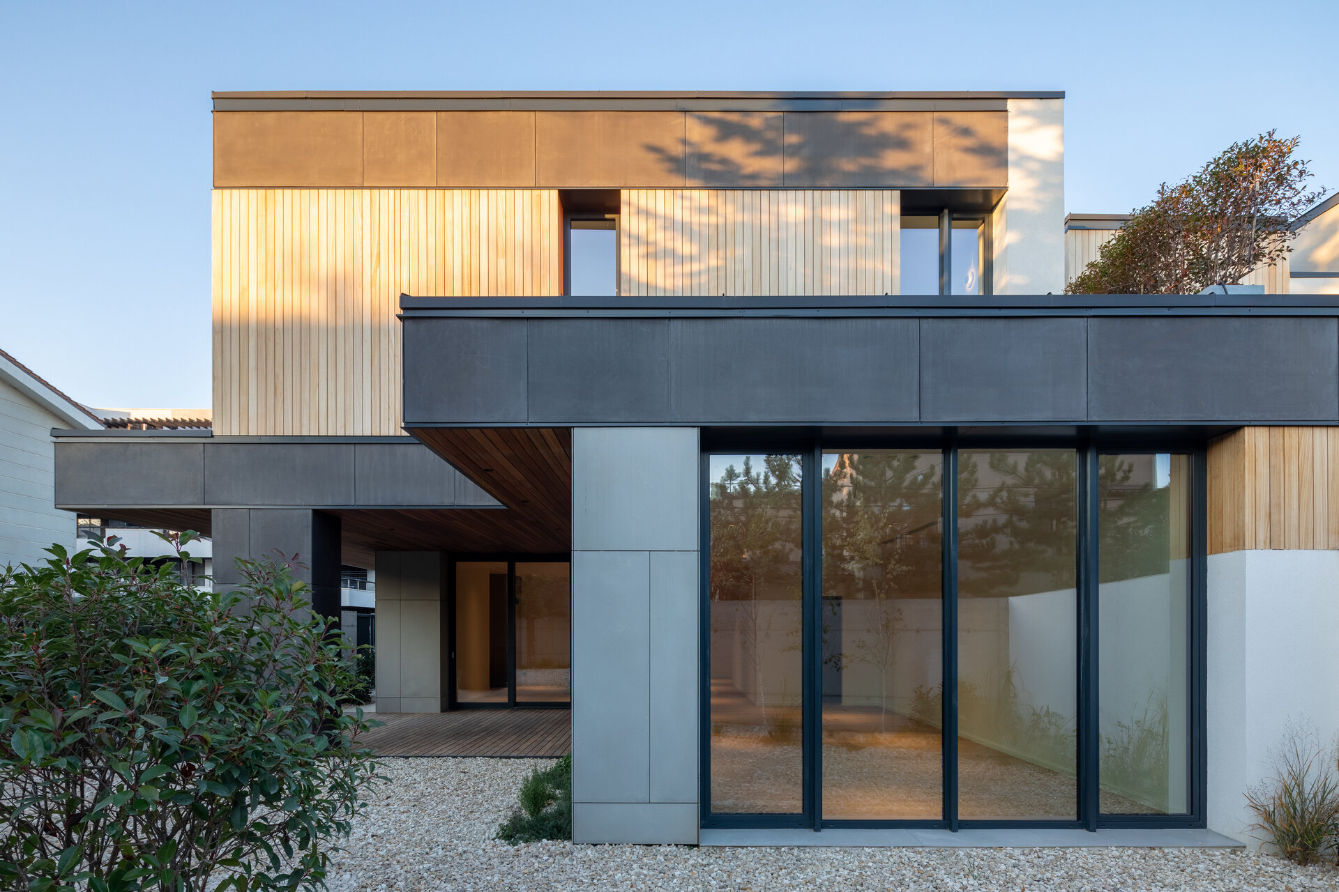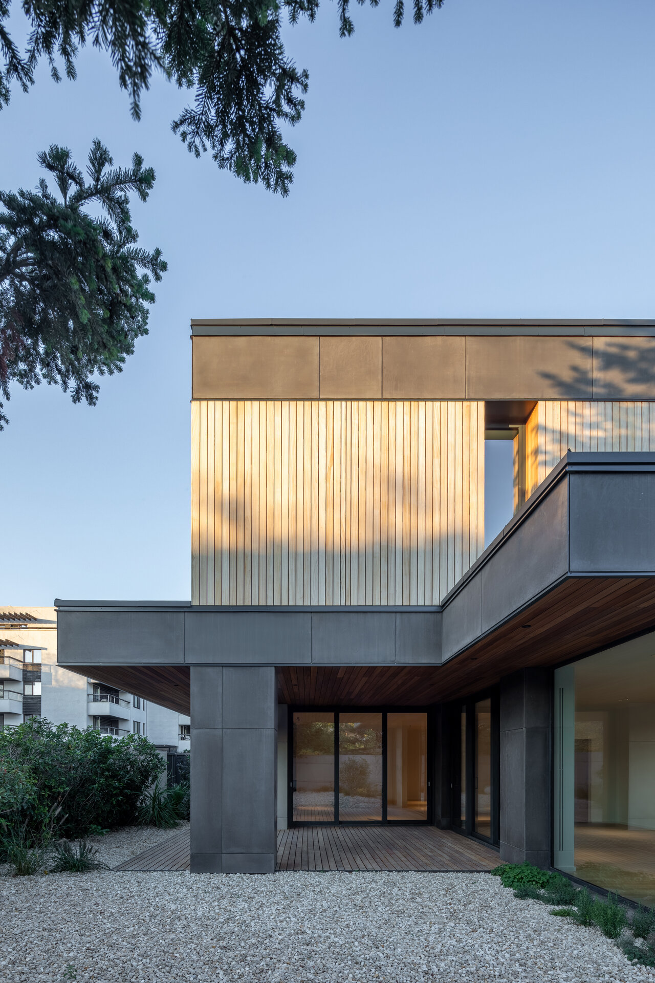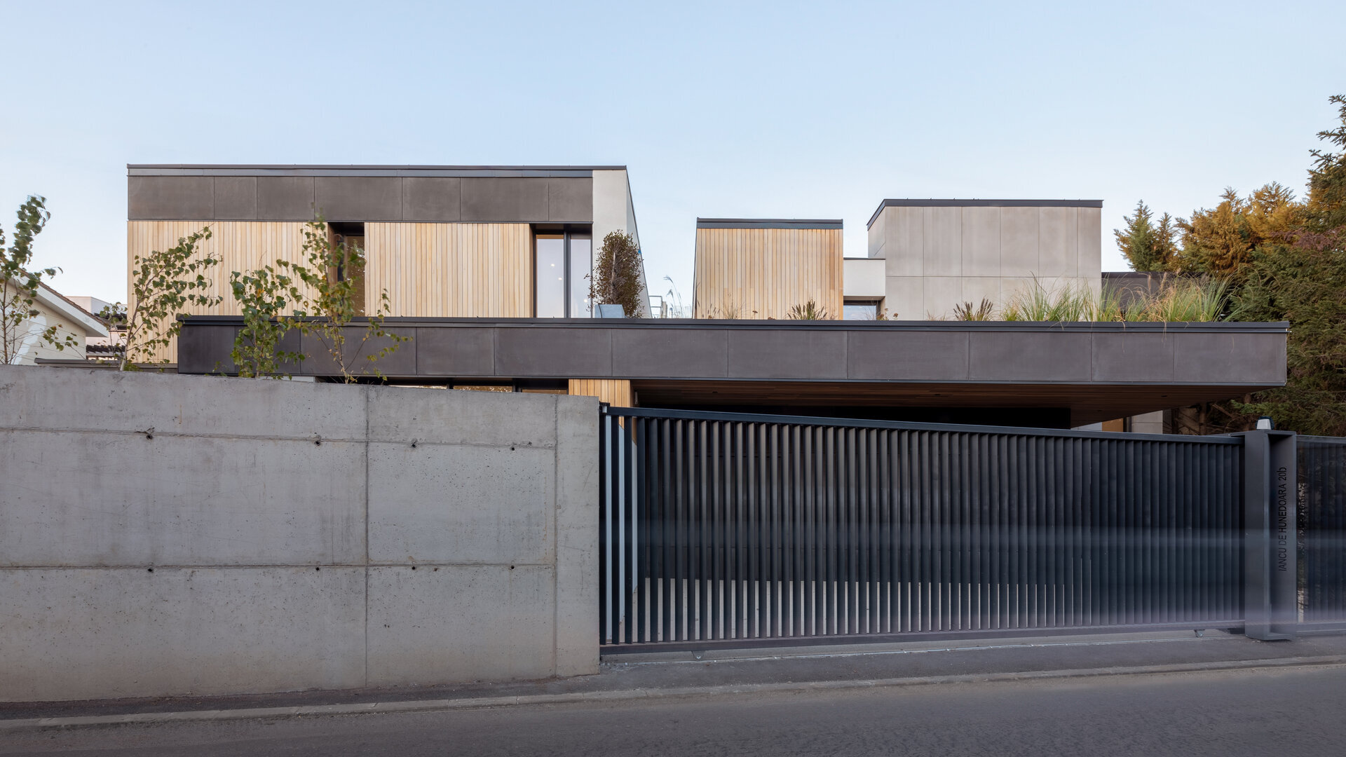 Fațadele se definesc printr-o compoziție sculpturală și riguroasă, construită din panouri ventilate de beton armat dispers, în două nuanțe de gri, alăturate unor suprafețe calde din lemn. Ferestrele principale, înalte de 3 metri, contribuie la o imagine elegantă și proporționată. La parter, intradosurile elementelor în consolă sunt finisate în același lemn ca fațada, aliniindu-se cu plafoanele suspendate din interior, care ascund discret sistemele de tratare a aerului.