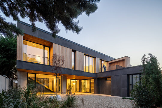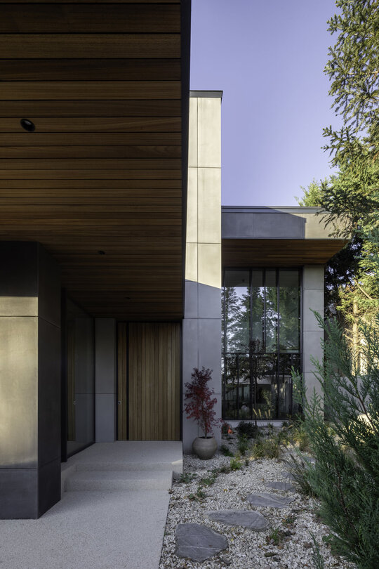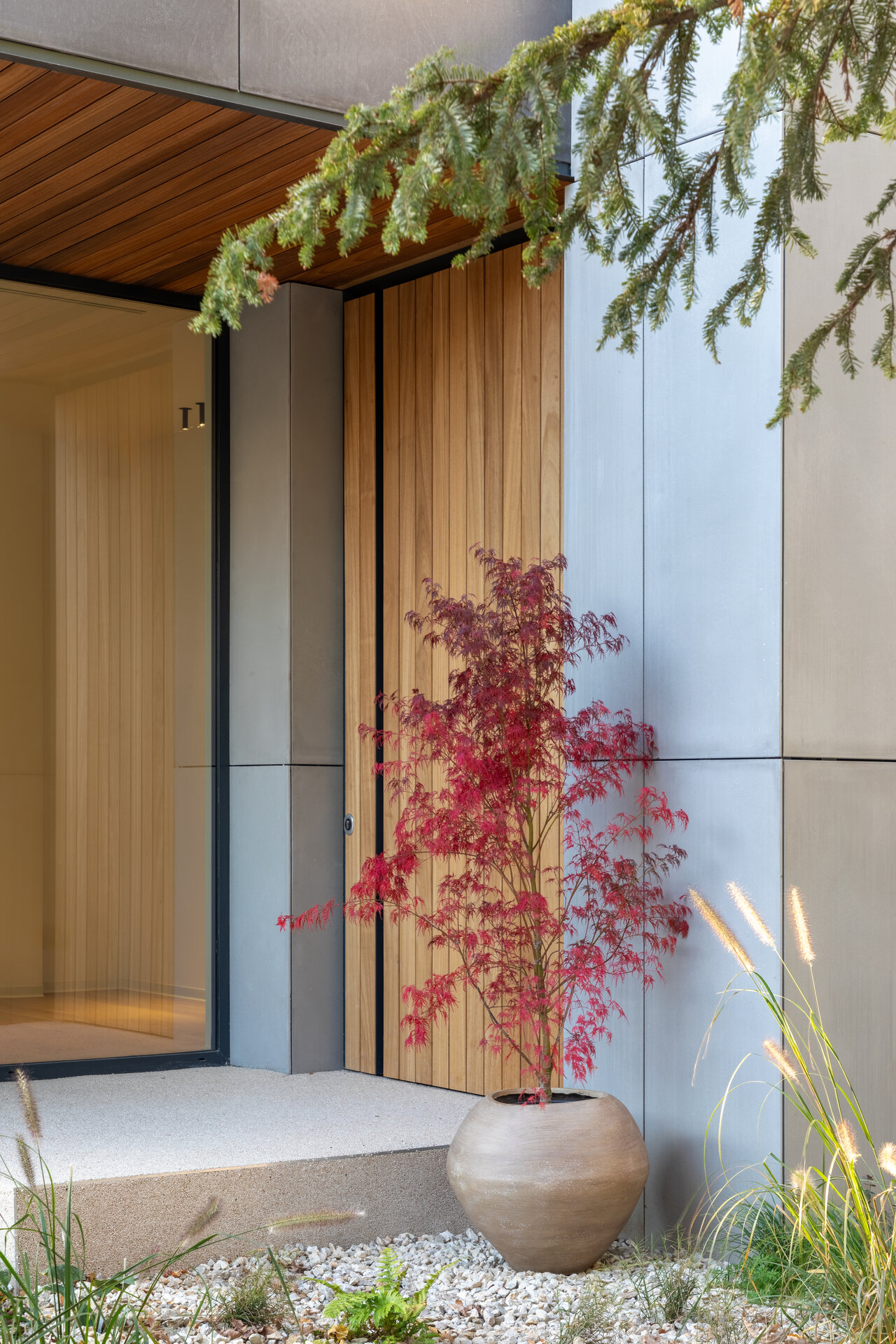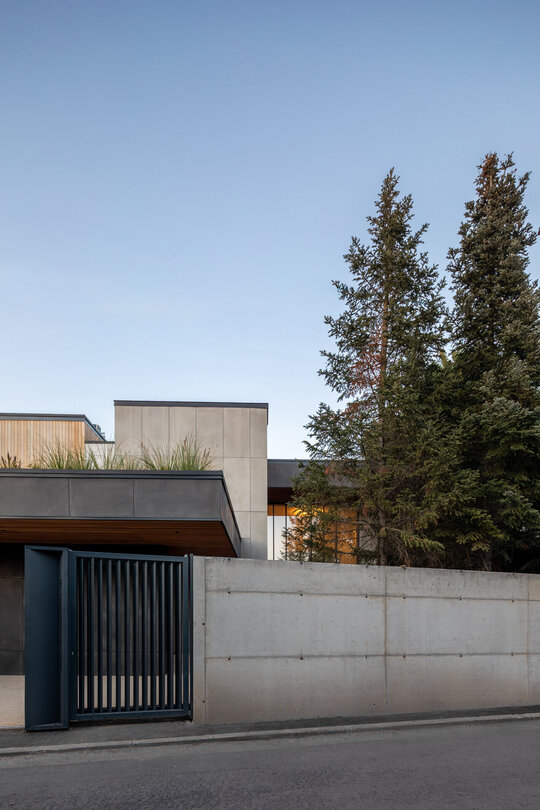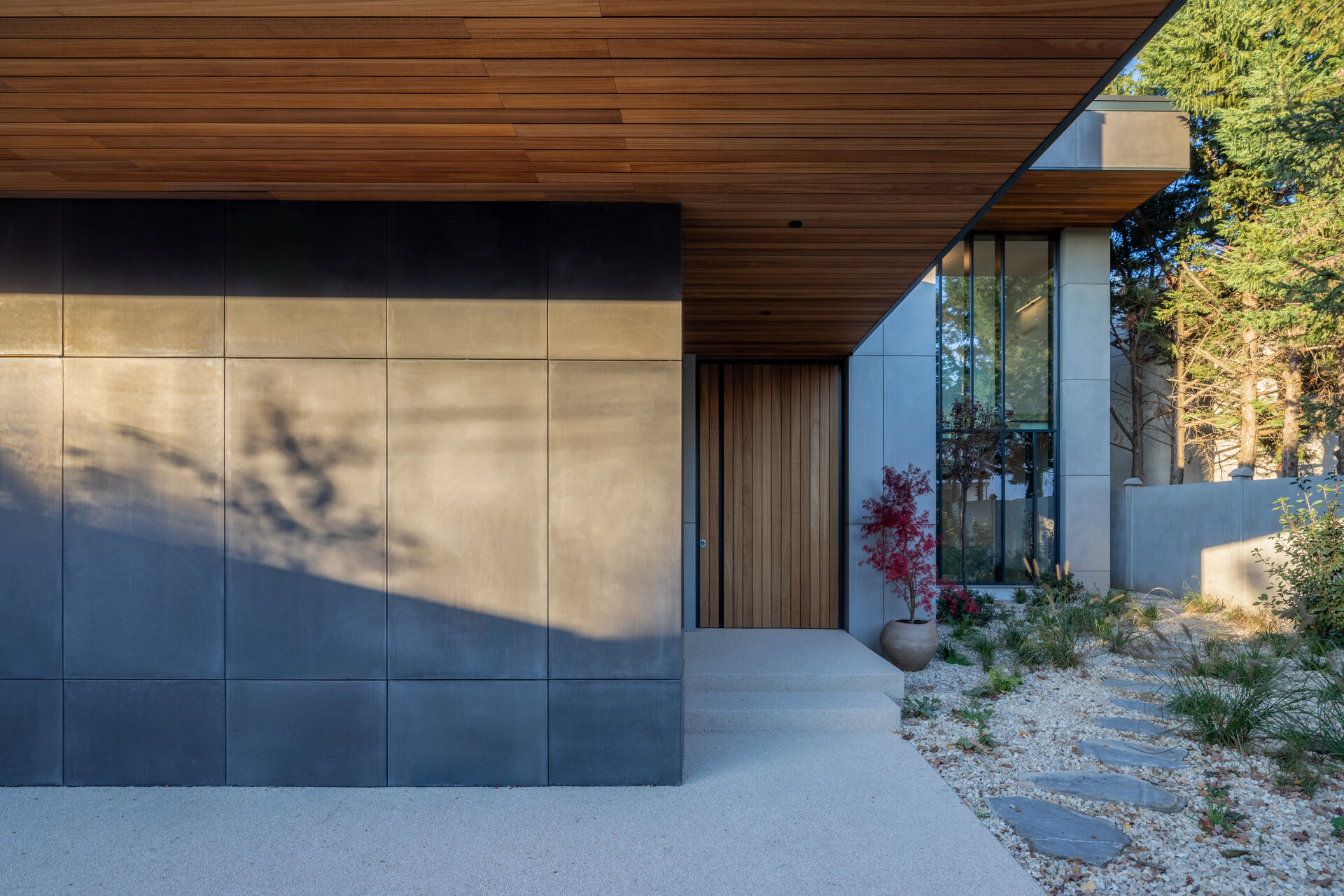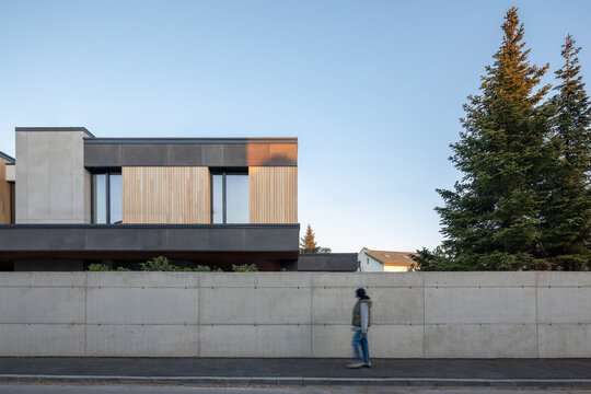 Fațadele se definesc printr-o compoziție sculpturală și riguroasă, construită din panouri ventilate de beton armat dispers, în două nuanțe de gri, alăturate unor suprafețe calde din lemn. Ferestrele principale, înalte de 3 metri, contribuie la o imagine elegantă și proporționată. La parter, intradosurile elementelor în consolă sunt finisate în același lemn ca fațada, aliniindu-se cu plafoanele suspendate din interior, care ascund discret sistemele de tratare a aerului.