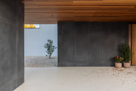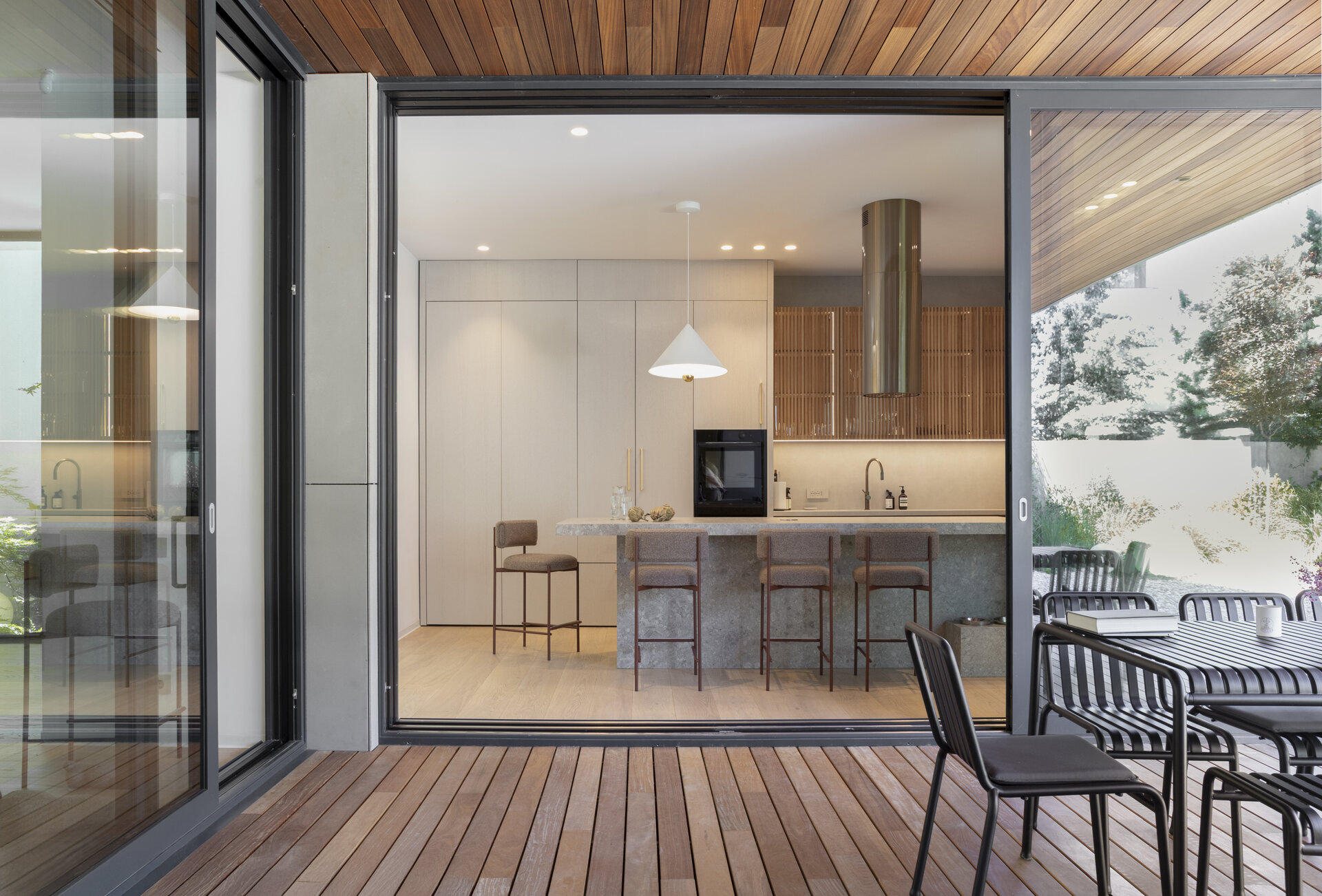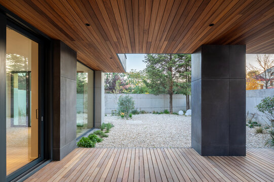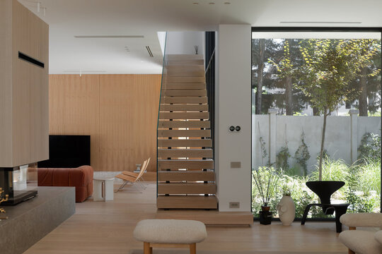 Organizarea interioară este clară: zona de zi se află la parter, iar cea de noapte la etaj, această separare fiind accentuată de un registru orizontal închis la culoare, ce marchează și compoziția fațadelor. La parter, pe lângă bucătărie, dining și living, se regăsesc spații flexibile precum birouri sau camere multifuncționale. Volumetria propusă generează terase ample, acoperite, aflate în prelungirea zonelor de zi, ce extind spațiul interior către grădină.