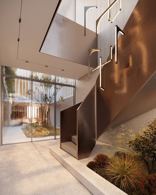 • Sistem de ventilație pasivă ce integrează circulații de aer, tuburi de răcire subterane și disipare termică la nivelul fațadei.
