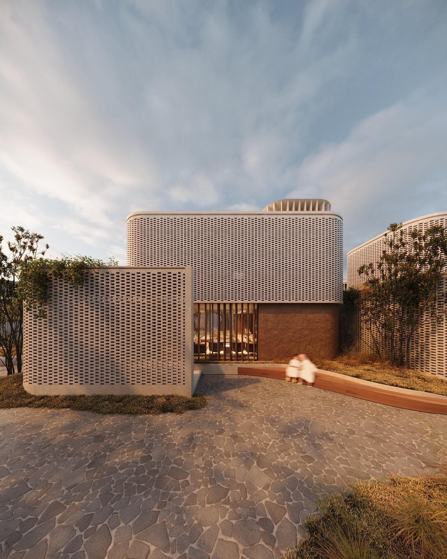 Un sistem modular de elemente ceramice configurează anvelopa permeabilă a clădirii, cu rol atât structural, cât și climatic. Împreună, forma arhitecturală și cea urbană alcătuiesc un ansamblu integrat de cartiere adaptate la microclimat, la utilizarea eficientă a materialelor și la viața cotidiană.