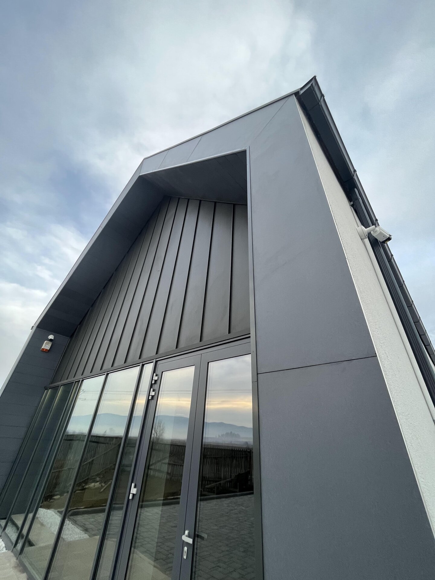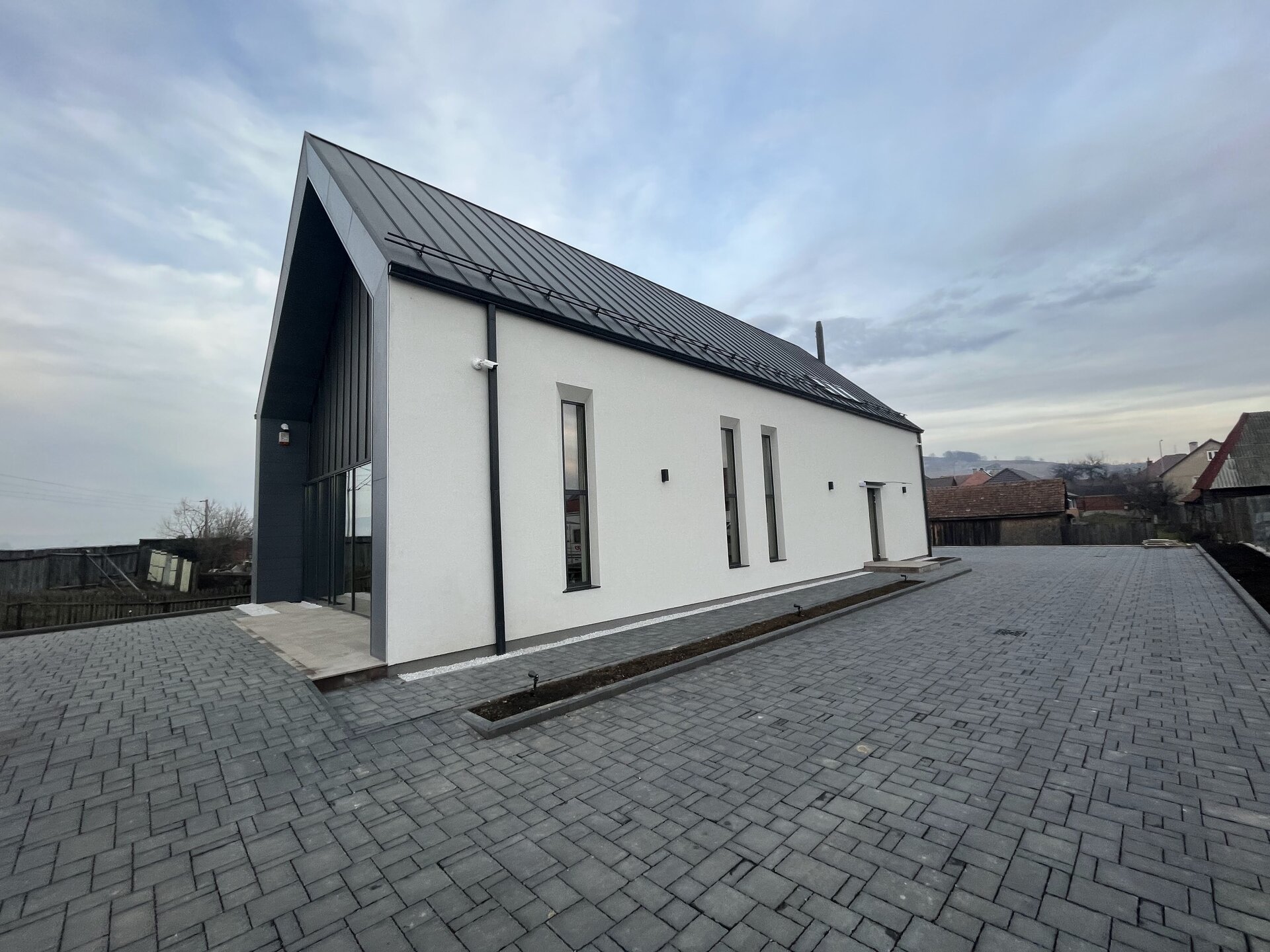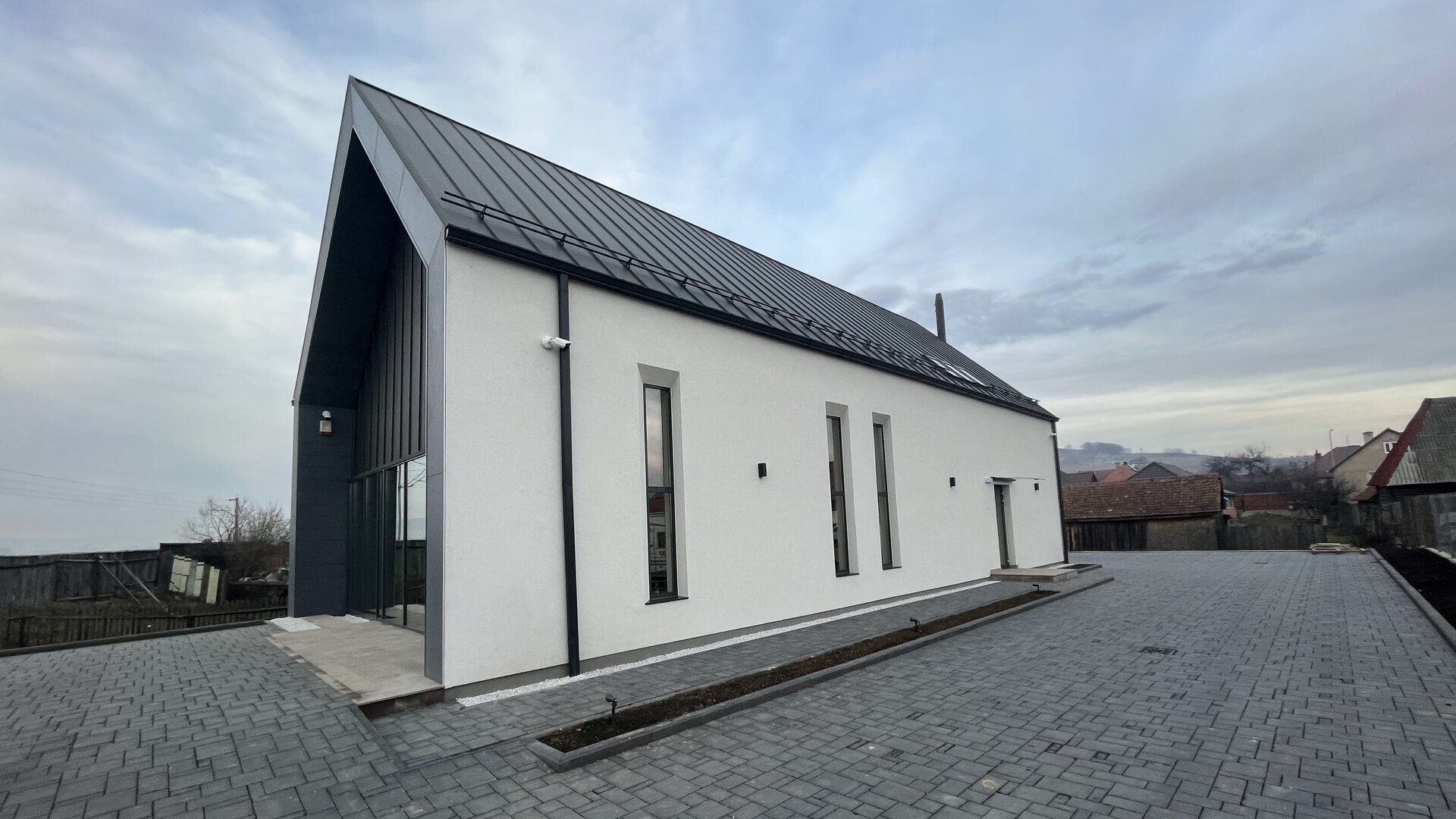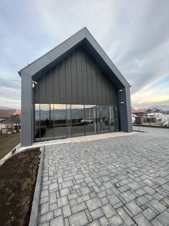 Un alt aspect remarcabil al clădirii este raportarea acesteia la context. Într-o zonă dominată de case tradiționale, cu acoperișuri abrupte și fațade simple, acest volum contemporan reinterpretează limbajul vernacular, oferind un exemplu de arhitectură care respectă tradiția fără a o copia. Este o construcție care se integrează prin formă și proporții, dar se diferențiază prin materiale și detalii moderne. Această abordare face ca imobilul să fie nu doar un spațiu comercial funcțional, ci și un reper vizual și arhitectural în comunitate. Prezența sa transmite un mesaj de înnoire, de deschidere către contemporaneitate și de respect față de estetica urbană.