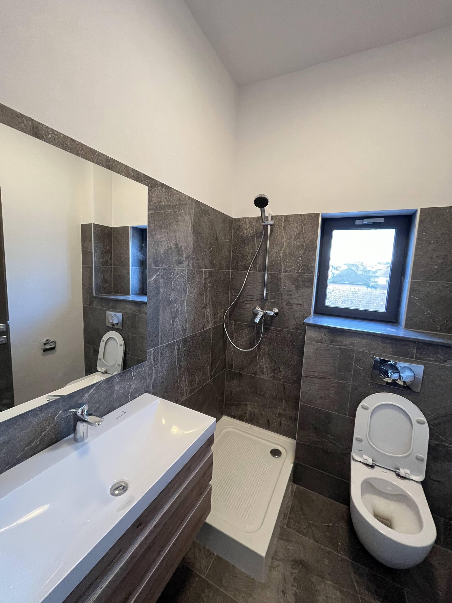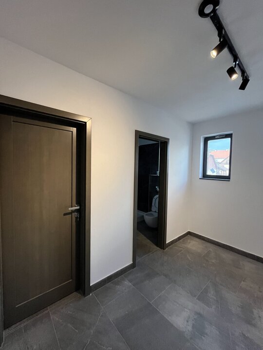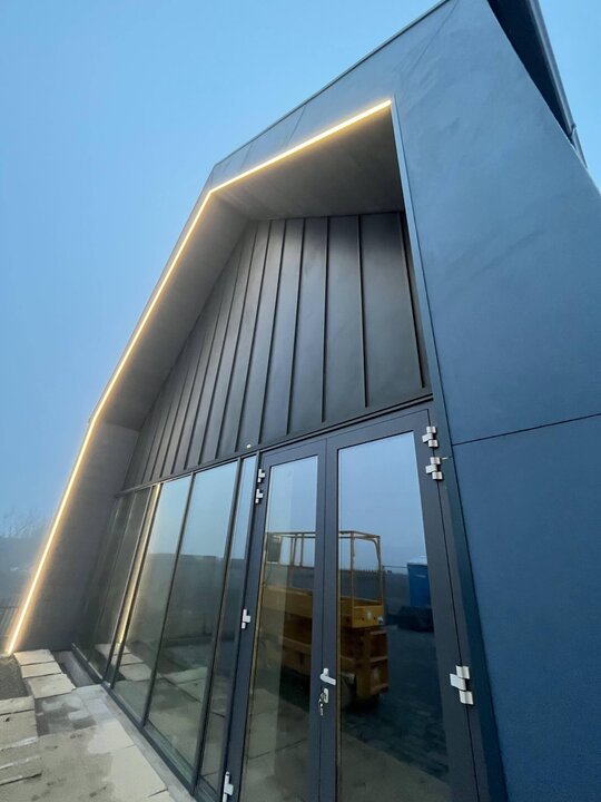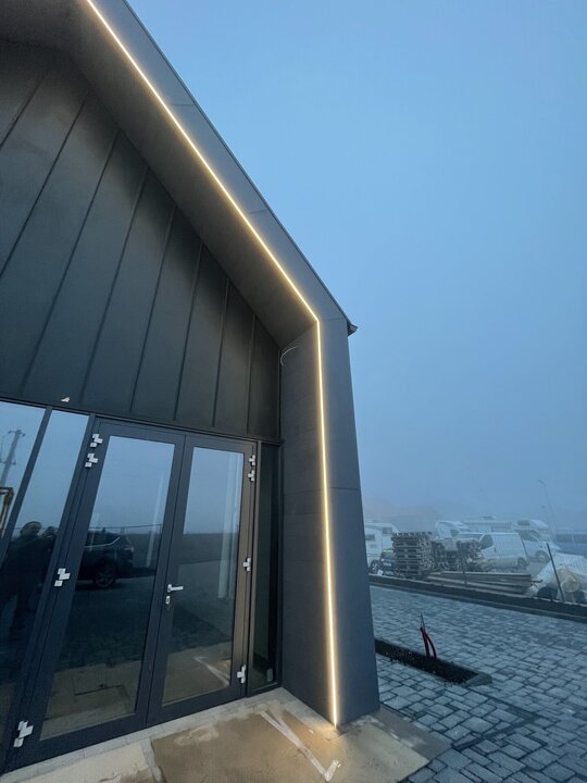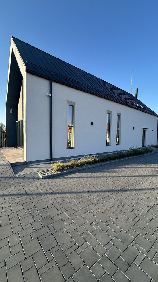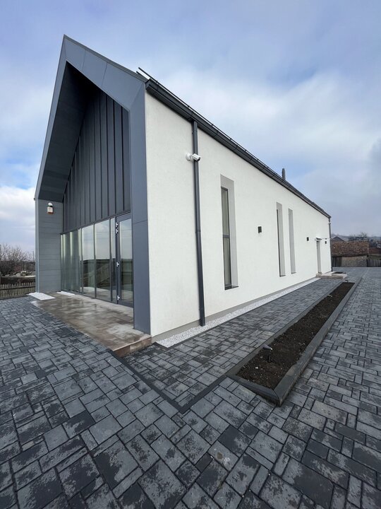 Un alt aspect remarcabil al clădirii este raportarea acesteia la context. Într-o zonă dominată de case tradiționale, cu acoperișuri abrupte și fațade simple, acest volum contemporan reinterpretează limbajul vernacular, oferind un exemplu de arhitectură care respectă tradiția fără a o copia. Este o construcție care se integrează prin formă și proporții, dar se diferențiază prin materiale și detalii moderne. Această abordare face ca imobilul să fie nu doar un spațiu comercial funcțional, ci și un reper vizual și arhitectural în comunitate. Prezența sa transmite un mesaj de înnoire, de deschidere către contemporaneitate și de respect față de estetica urbană.