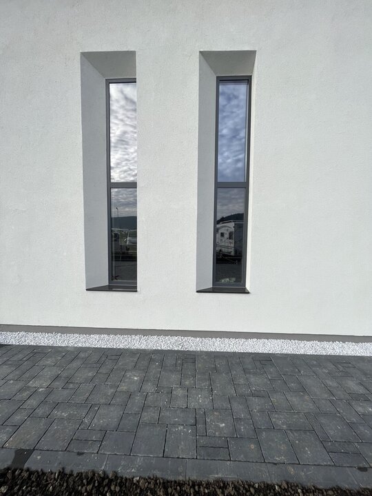 Lateral, fațada este marcată de goluri verticale înguste, ritmate, care asigură iluminarea naturală a spațiilor interioare, dar și o expresie vizuală rafinată. Aceste ferestre înalte și subțiri contribuie la crearea unei dinamici verticale, care contrastează cu orizontalitatea volumului și accentuează senzația de înălțime la interior.
