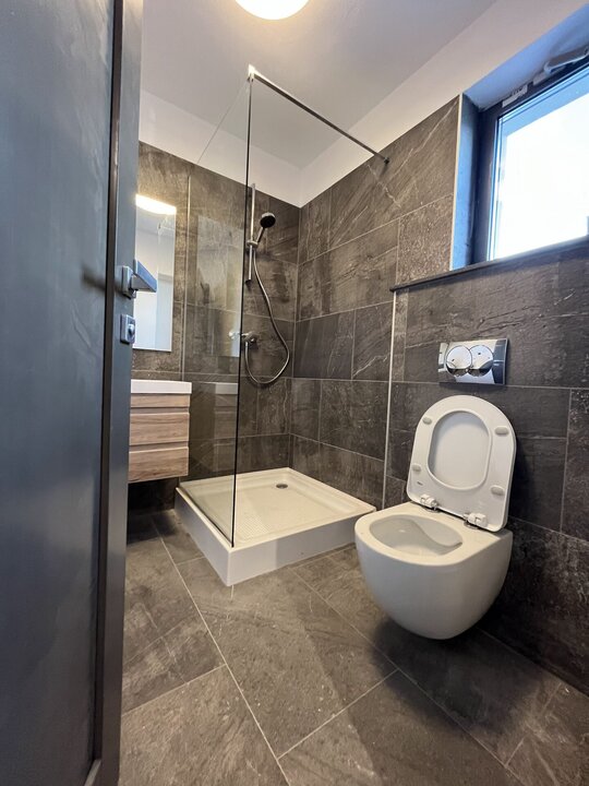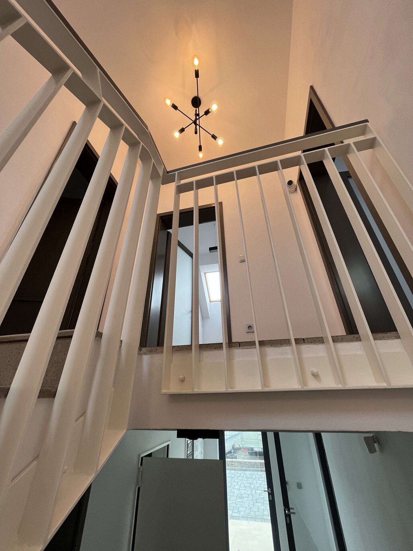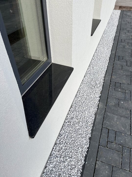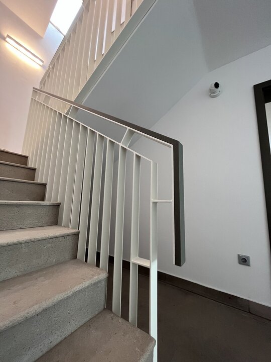 Parterul se deschide către exterior prin suprafețe vitrate generoase, creând o legătură vizuală constantă cu spațiul urban din jur. Pavarea curții cu dale moderne din beton prefabricat, aranjate într-un mod ritmic și ordonat, contribuie la imaginea contemporană a ansamblului și oferă în același timp o suprafață rezistentă și funcțională pentru circulația pietonală și accesul auto.