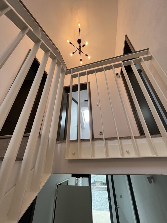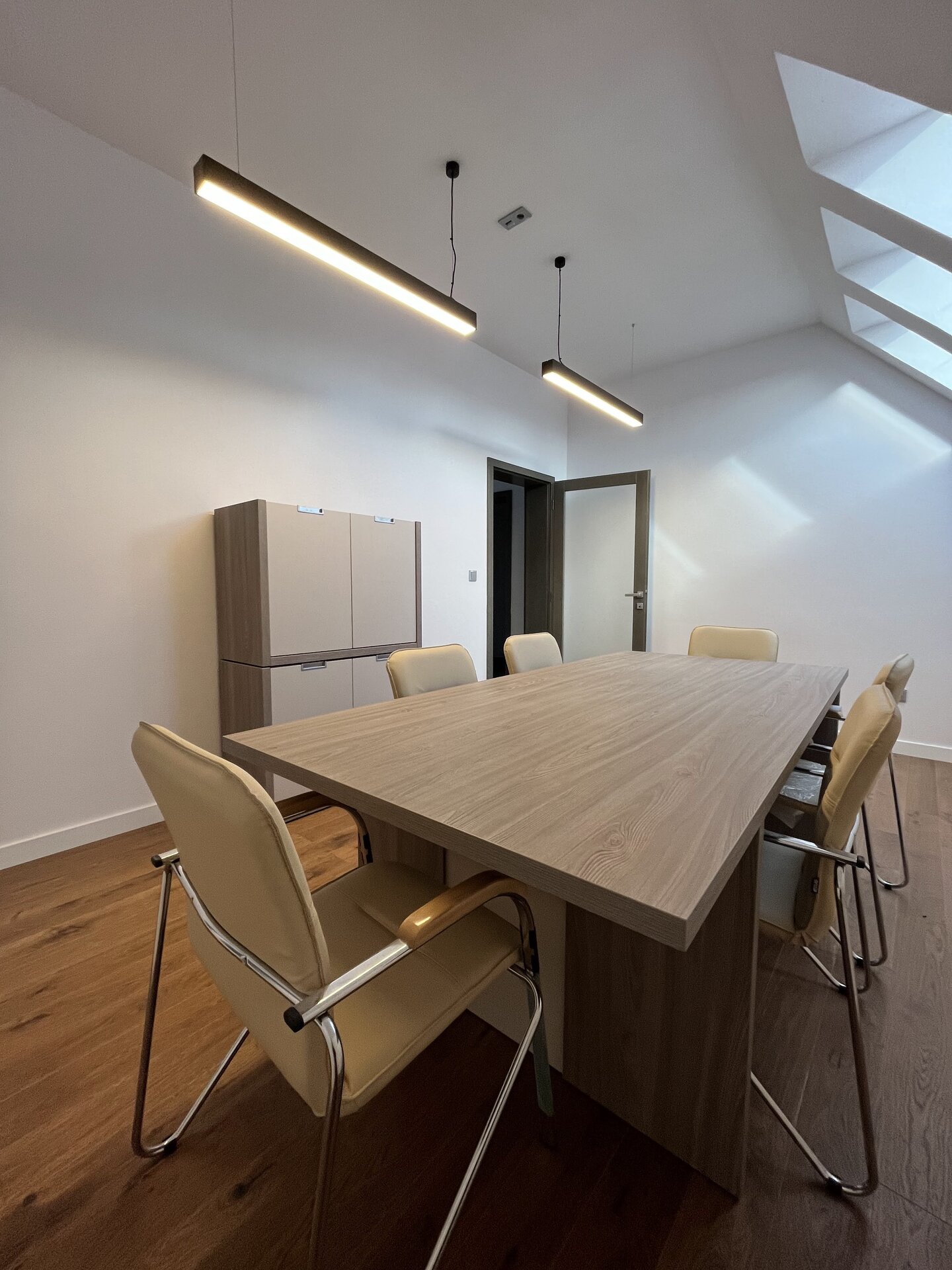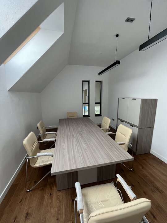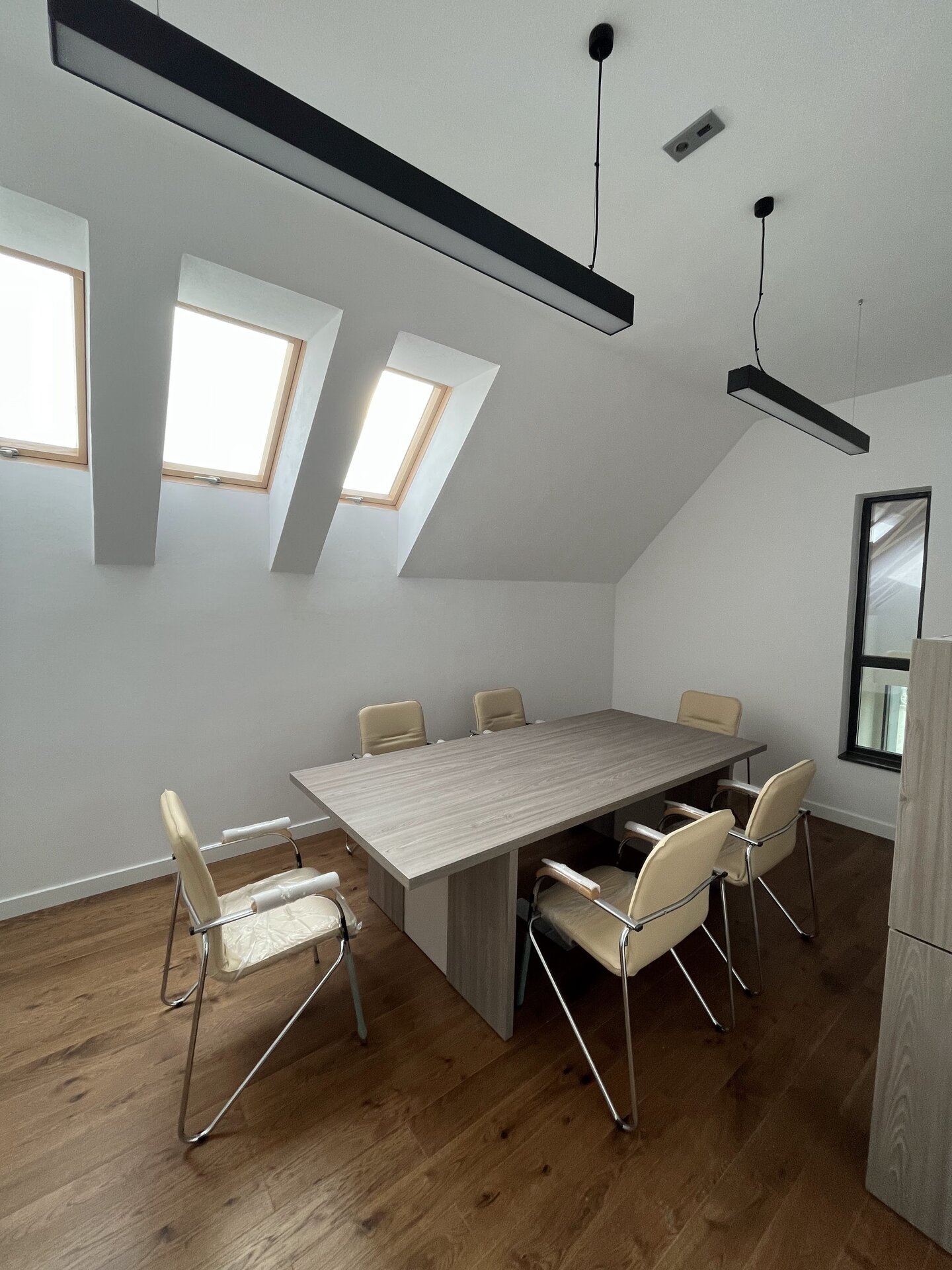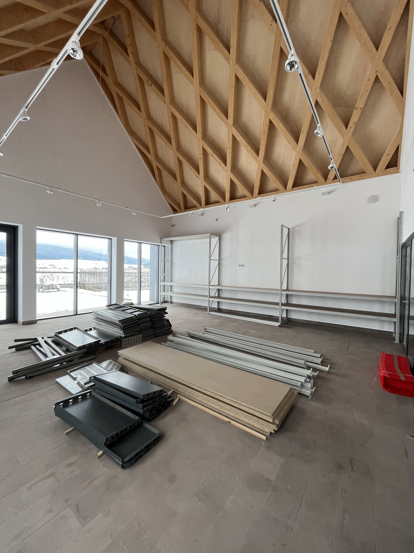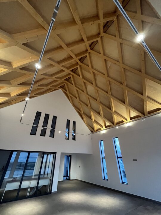 În interior, finisajele sunt menținute într-un registru minimalist, lăsând materialele naturale să vorbească de la sine. Lemnul șarpantei, tencuiala albă a pereților și pardoselile neutre creează un fundal calm și elegant, care poate fi personalizat în funcție de brandul sau identitatea viitorului utilizator. Sistemele de iluminat moderne, integrate discret pe structura acoperișului, asigură o atmosferă contemporană și un confort vizual optim.
