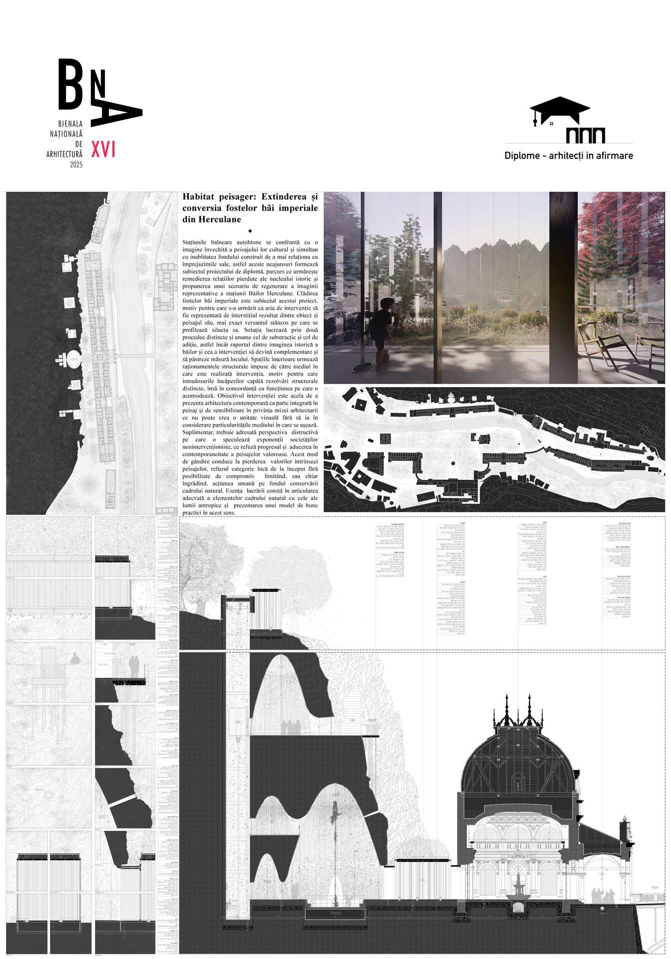 Stațiunile balneare autohtone se confruntă cu o imagine învechită a peisajului lor cultural și simultan cu inablitatea fondului construit de a mai relaționa cu împrejurimile sale, astfel aceste neajunsuri formează subiectul proiectului de diplomă, parcurs ce urmărește remedierea relațiilor pierdute ale nucleului istoric și propunerea unui scenariu de regenerare a imaginii reprezentative a stațiunii Băilor Herculane. Clădirea fostelor băi imperiale este subiectul acestui proiect, motiv pentru care s-a urmărit ca aria de intervenție să fie reprezentată de interstițiul rezultat dintre obiect și peisajul său, mai exact versantul stâncos pe care se profilează silueta sa. Soluția lucrează prin două procedee distincte și anume cel de substracție și cel de adiție, astfel încât raportul dintre imaginea istorică a băilor și cea a intervenției să devină complementare și să păstreze măsură locului. Spațiile interioare urmează raționamentele structurale impuse de către mediul în care este realizată intervenția, motiv pentru care intradosurile încăperilor capătă rezolvări structurale distincte, însă în concordanță cu funcțiunea pe care o acomodează. Obiectivul intervenției este acela de a prezenta arhitectura contemporană ca parte integrată în peisaj și de sensibilizare în privința mizei arhitecturii ce nu poate crea o unitate vizuală fără să ia în considerare particularitățile mediului în care se așează. Suplimentar, trebuie adresată perspectiva distructivă pe care o speculează exponenții societăților nonintervenționiste, ce refuză progresul și aducerea în contemporaneitate a peisajelor valoroase. Acest mod de gândire conduce la pierderea valorilor intrinseci peisajelor, refuzul categoric încă de la început fără posibilitate de compromis limitând, sau chiar îngrădind, acțiunea umană pe fondul conservării cadrului natural. Esența lucrării constă în articularea adecvată a elementelor cadrului natural cu cele ale lumii antropice și prezentarea unui model de bune practici în acest sens.