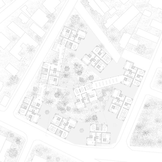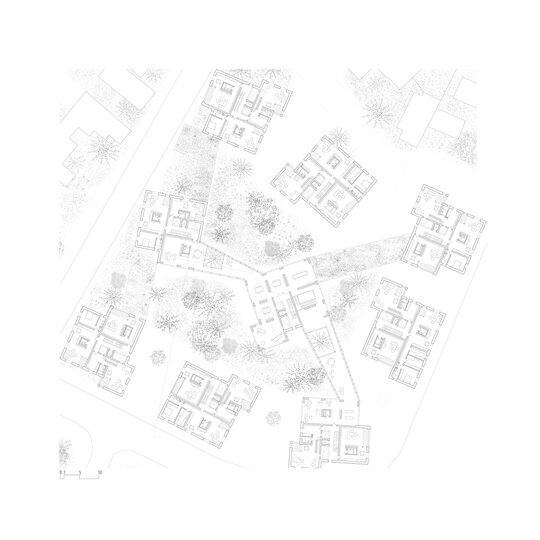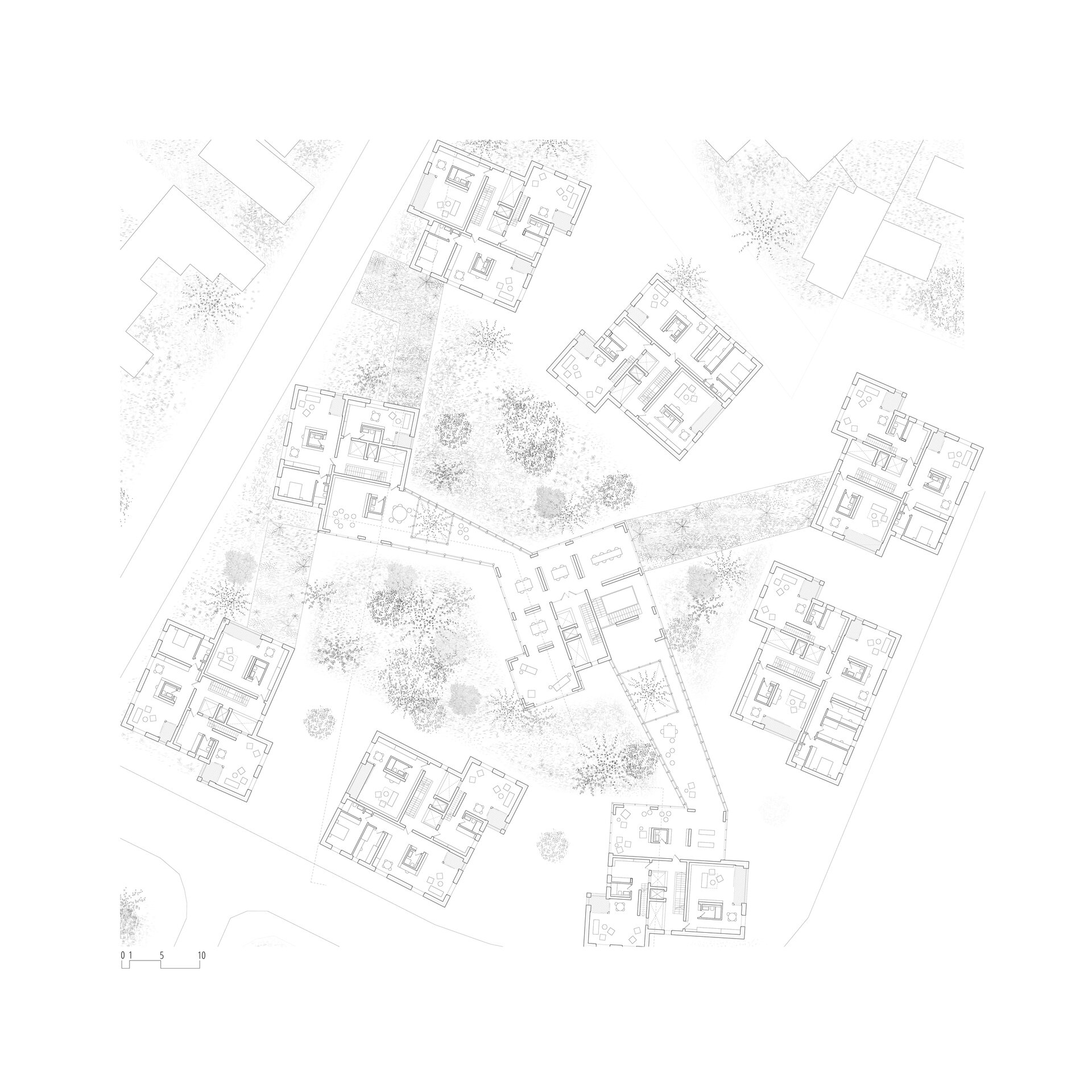 La nivel planimetric avem un volum de bază cu trei variațiuni. Parterul este integral comun, cu birouri și ateliere separate de nodul de distribuție al locatarilor. Înspre zona de case, cele două volume de la parter au funcțiune de cafenea deschisă către curtea ansamblului, iar cele conectate cu volumul din centru, atât la parter, cât și la etaj, găzduiesc o bibliotecă, făcându-l astfel obiectul special al ansamblului. Foarte important este locul de întâlnire acestor brațe, rezolvat precum o picătură de cerneală în apă, adică materialitatea lor se împrăștie în registrul orizontal pe zone înțepate, restul fiind rezolvat ca locuință, făcând vizibil din exterior unde este permis accesul și unde nu.