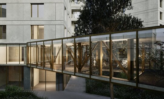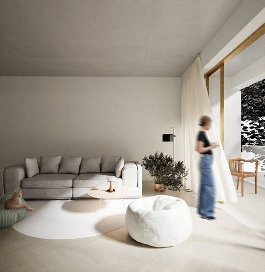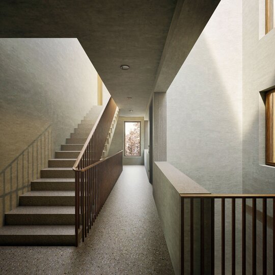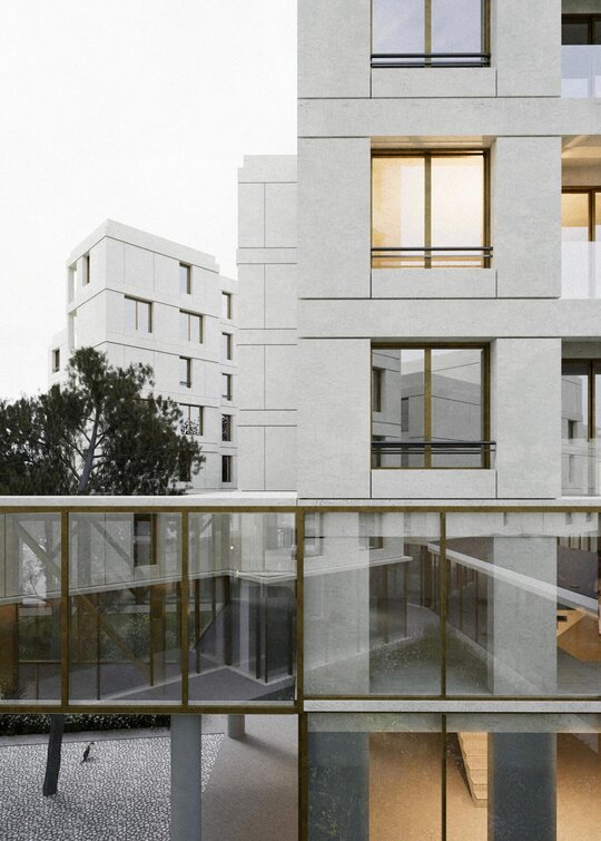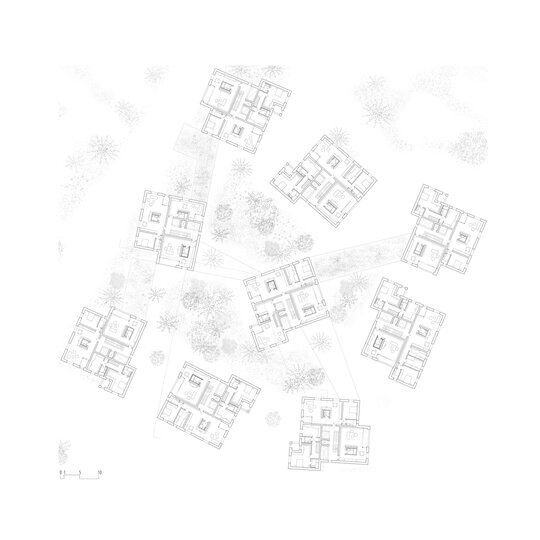 La nivel mai restrâns, ansamblul propune 4 tipuri de apartamente – studio, duplex și 2/3 camere în funcție de volum și constrângerile sale. Nodul de distribuție primește două atriumuri pe peretele lipit de duplex, cu goluri de atmosferă către interior, ca un fel de vitrină a familiei. Zonele de zi sunt separate de cele de noapte, în simplexuri traseul fiind unul circular în jurul unei încăperi singulare, de regulă baia, pentru a contribui la divizarea zonelor spațiului.
