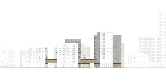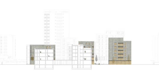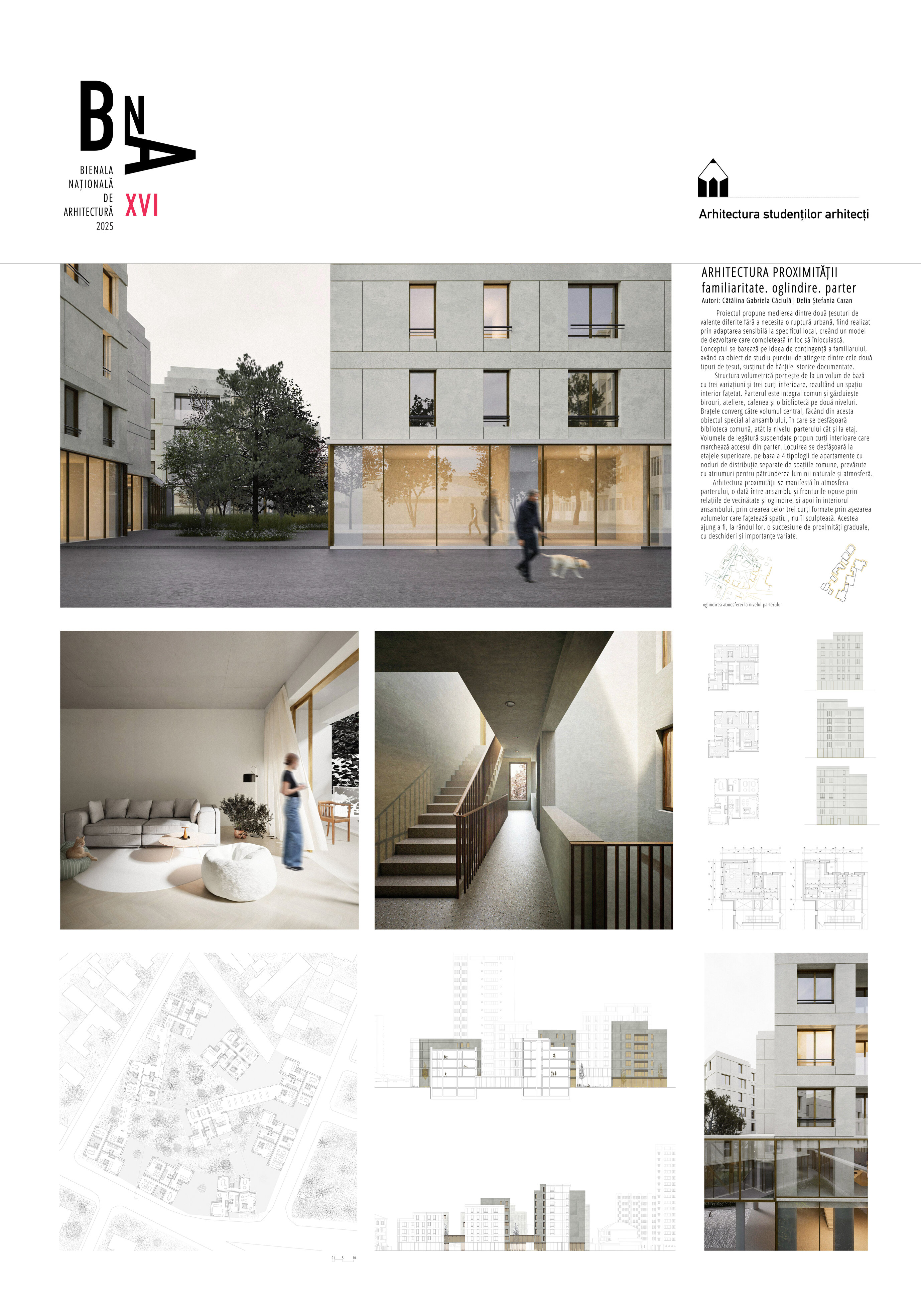 Ideea de familiaritate pe care am adus-o în discuție se întâlnește atât la limitele exterioare, cât și în interiorul ansamblului. Frontal orientat către locuințele joase este mai fragmentat, în vederea oglindirii celor două fronturi prin atmosferă, cu goluri mai familiare locuirii și curți asemănătoare celor vecine, iar către blocuri, frontul este mai riguros, lipsit de nișe și plasat la aliniament. Aceeași idee, însă detaliată în interiorul ansamblului, se regăsește o dată în cadrul unui volum în relație cu alt volum (cum se rotește unul față de altul, cu cât se înalță) și o dată în relație cu vidul pe care îl creează, și anume cele 3 curți. Vorbim de această idee de contingență la nivelul ansamblului pe perechi vizuale (3 mari zone), unde volumele își atribuie rolul de fațade interioare din care nu rezultă un spațiu sculptat, ci mai degrabă fațetat. Așa cum nici strada – punctul nostru de plecare – nu este sculptată prin dorința creării unui anumit spațiu public, ci rezultă din așezarea straturilor.
