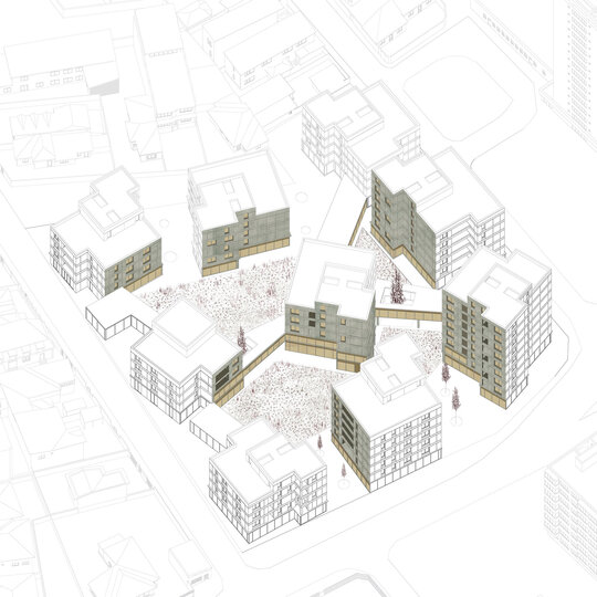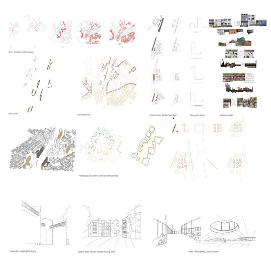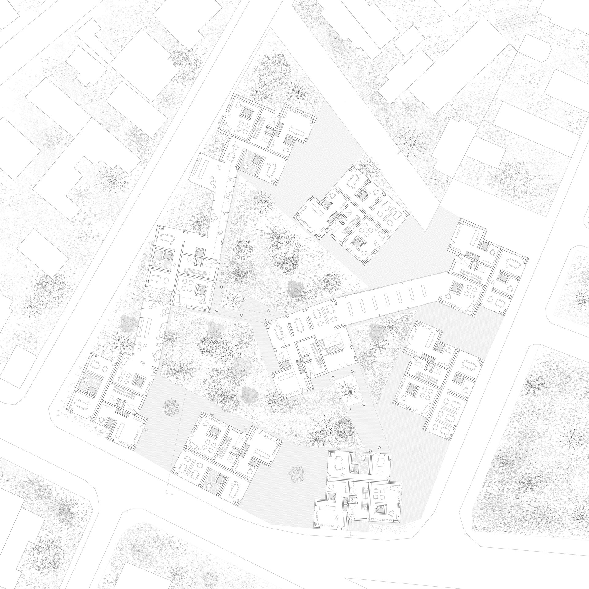 Plecând de la imaginea de ansamblu, am observat o relație de linie-punct pe care am introdus-o și în conceptul nostru. Am început cu punctele, turnurile de locuințe, pe un grid ortogonal, fiecare preluând direcții din sit pentru a media întâlnirea ansamblului cu cele patru fronturi stradale, de valența blocurilor moderniste. Liniile apar sub forma unor elemente de legătură, care preiau intenția inițială a blocurilor de a borda bulevardul și de a ordona țesutul rural pentru a aduce centrul mai aproape de periferie.