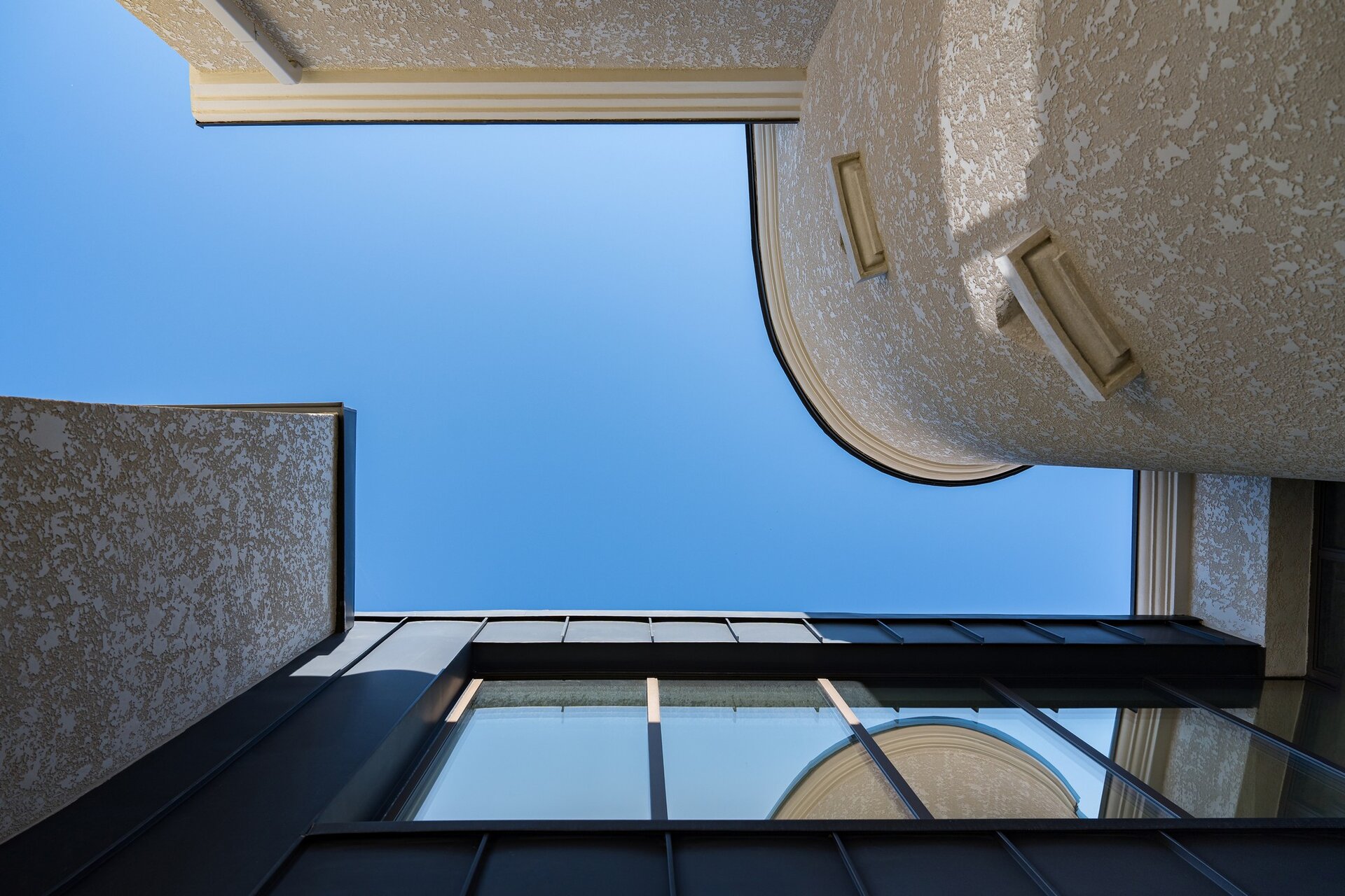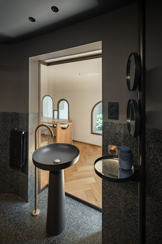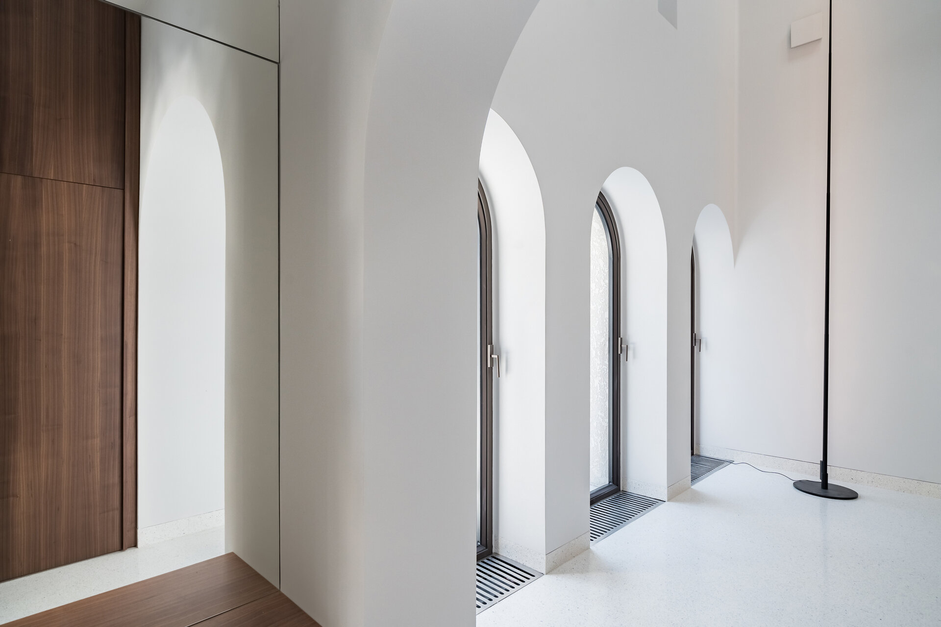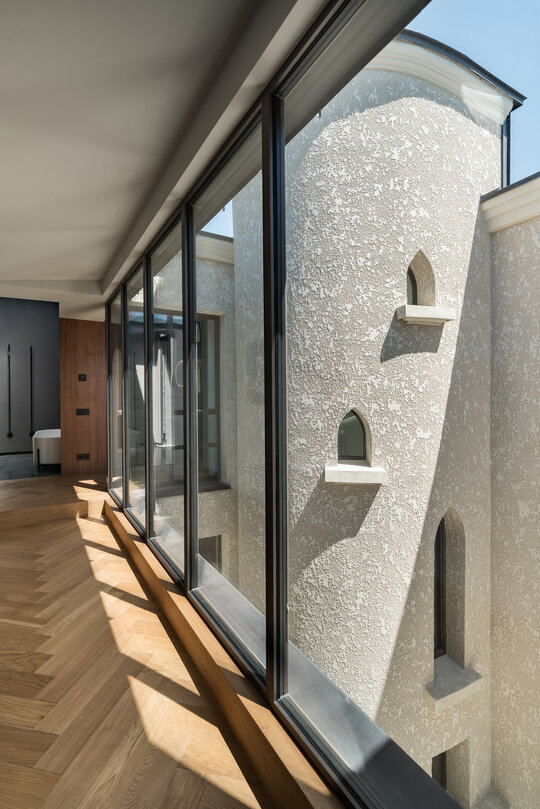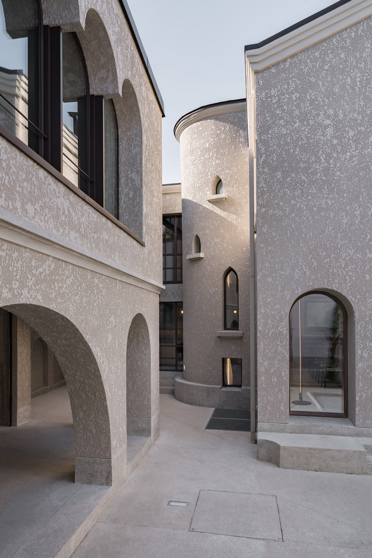 Provocarea proiectului a fost reintegrarea arhitecturii originale, cu detalii și materiale specifice, într-o clădire complet reconfigurată la interior și parțial la exterior, modernă, în care tehnologia și funcționalitatea susțin spațialitatea. Procesul a fost unul de lungă durată, proiectul debutând în 2019, și a implicat 3 autorizații de construire: 2 pentru corpul principal și una pentru extinderea foișorului și construirea pasarelei. Volumul principal a fost extins pe verticală, ferestrele cu arcade au pierdut parapetul, iar fereastra de la stradă a fost reconfigurată pentru a primi mai multă lumină de la răsărit.