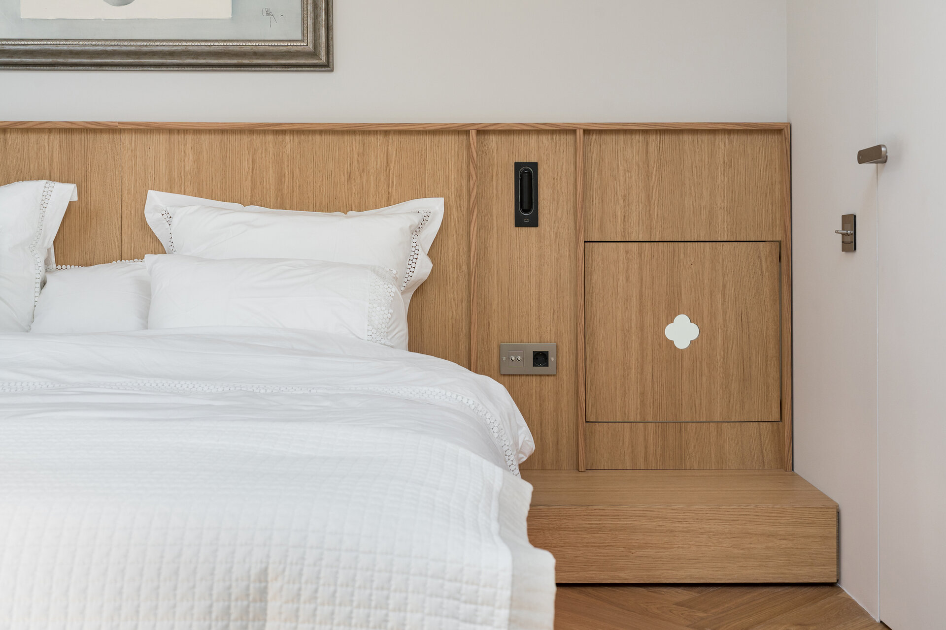 Spațiul sufrageriei este traversat de o cursivă metalică în care ajunge scara principală și care facilitează legătura între cele două dormitoare ale casei. Zona matrimonială se află în spatele casei, iar dormitorul, suprapus peste foișor, se accesează printr-o pasarelă metalică suspendată și vitrată pe o latură, între cele două corpuri de clădire. Astfel, etajul este privat, însă cu conexiune vizuală către toate spațiile de zi și către exterior. Dacă spațiile principale conțin lumina ca element central, băile sunt realizate în antiteză, cu materiale închise la culoare și lumină dozată. Lumina a fost un subiect principal al amanajarii si o cerinta aparta a beneficarului. Relatia cu lumina naturala si captarea ei in interior astfel incat si psatiile cu monoorientare sau lumina indirecta sa pot fi iluminate pe tot parcursul zilei si a anului. Iluminatul de seara cauta sa ofera mai degraba o ambianta fara sursa de lumina directa, lumina este dimabila si configurata in diverse scenarii.