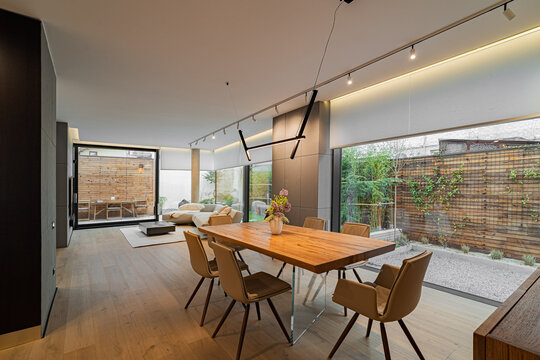 Livingul devine o extensie firească a exteriorului, datorită suprafețelor vitrate ample și a deschiderii către grădină. Paleta neutră de culori, mobilierul modern și lumina naturală definesc un cadru relaxant, ideal pentru momente de tihnă sau pentru socializarea mult râvnită în societatea actuală. Diningul este spațiul în care naturalețea întâlnește eleganța. Masa și comoda din lemn masiv, scaunele confortabile din piele naturală și conexiunea vizuală cu grădina compun un loc ideal pentru întâlniri în familie sau cine intime.