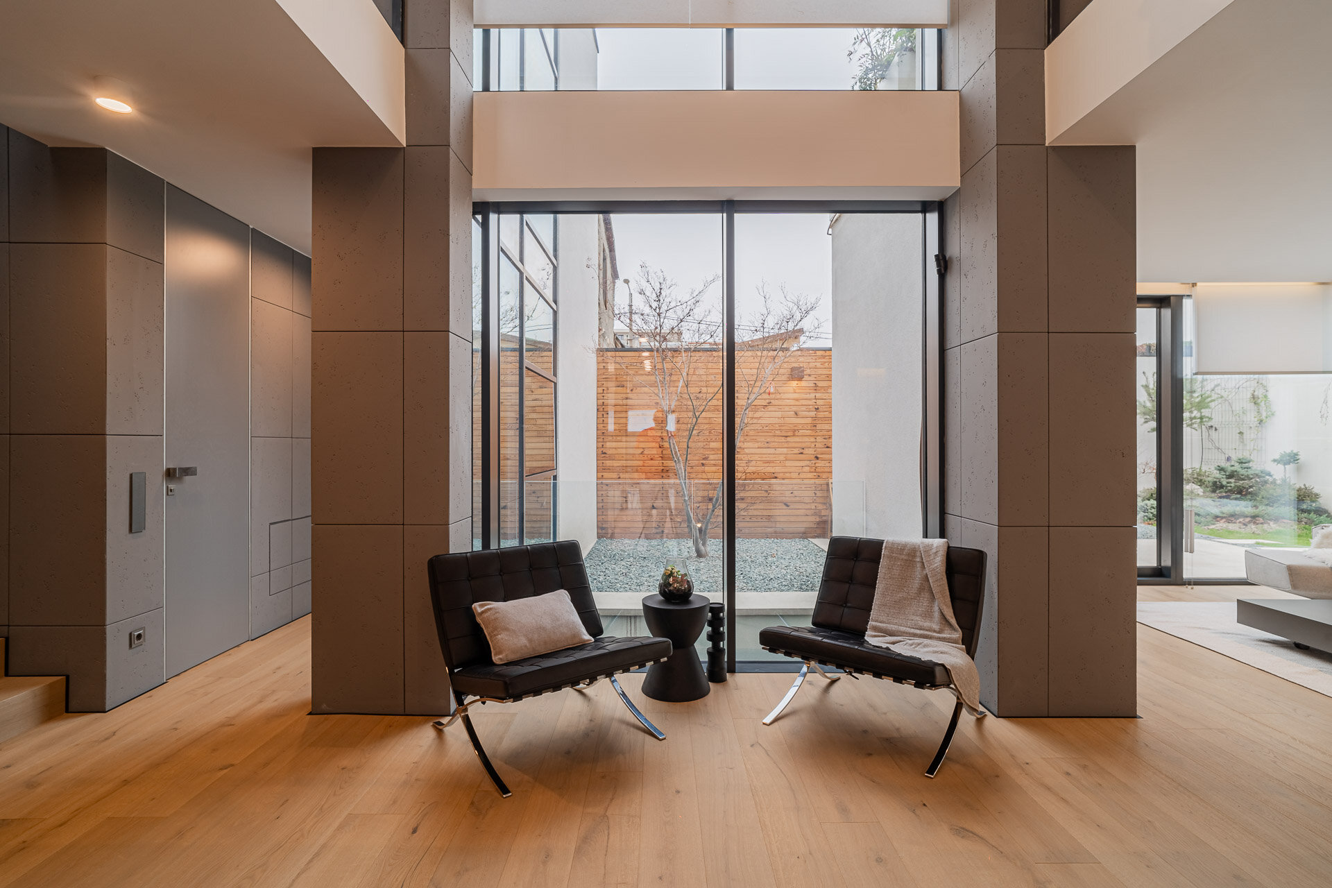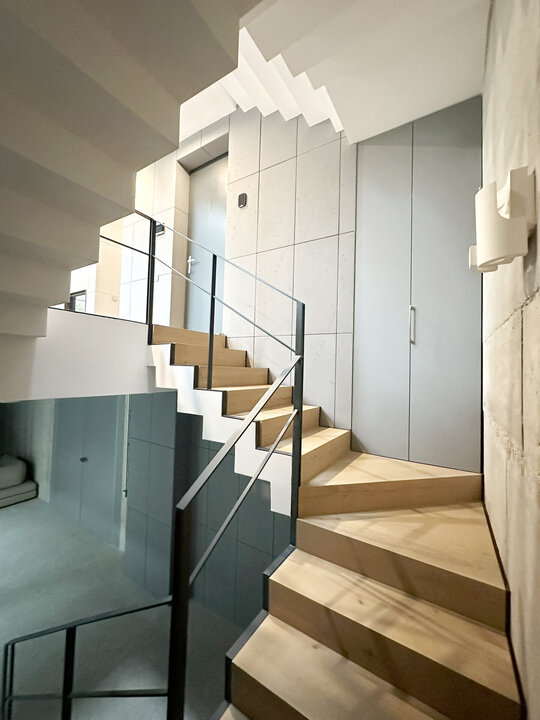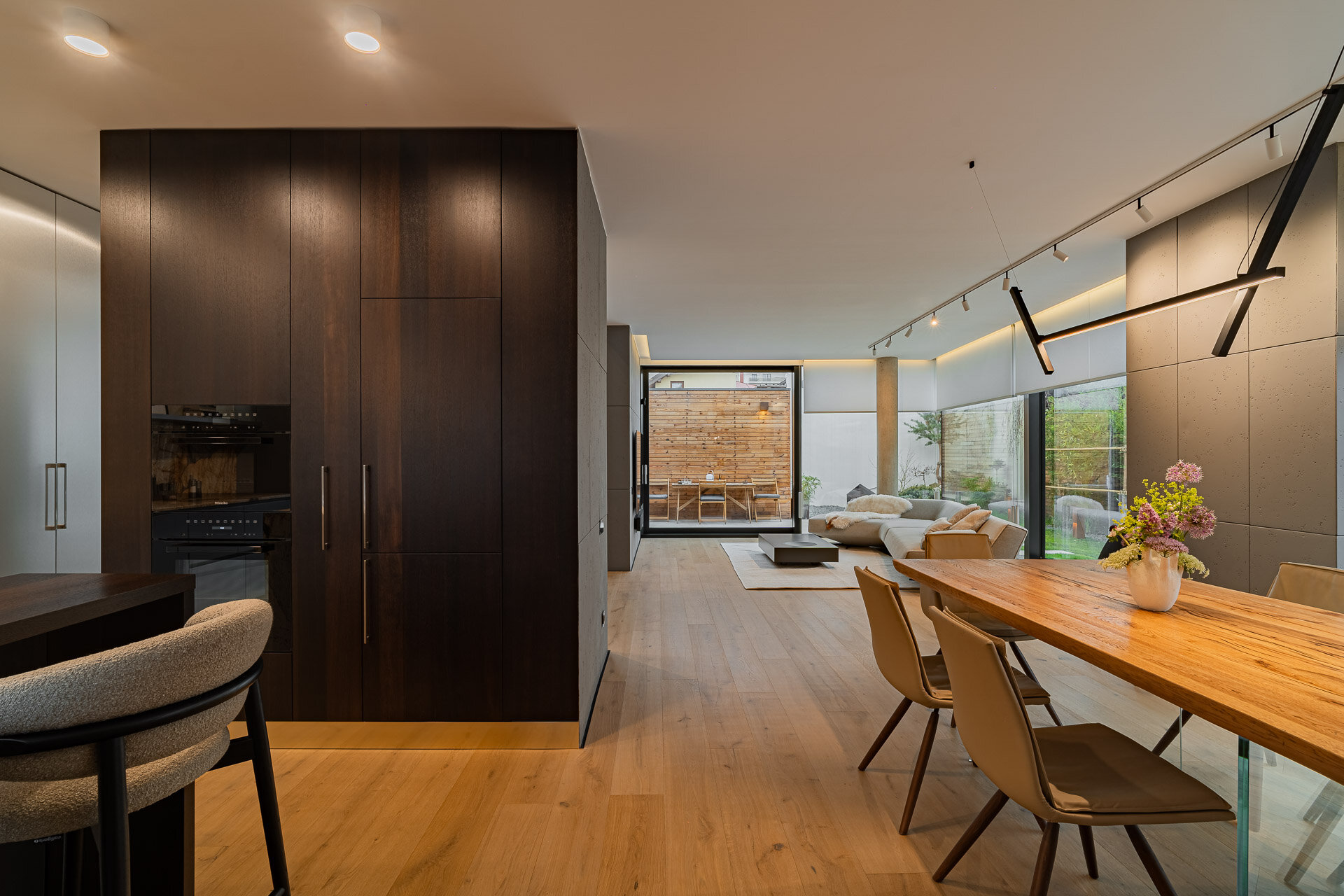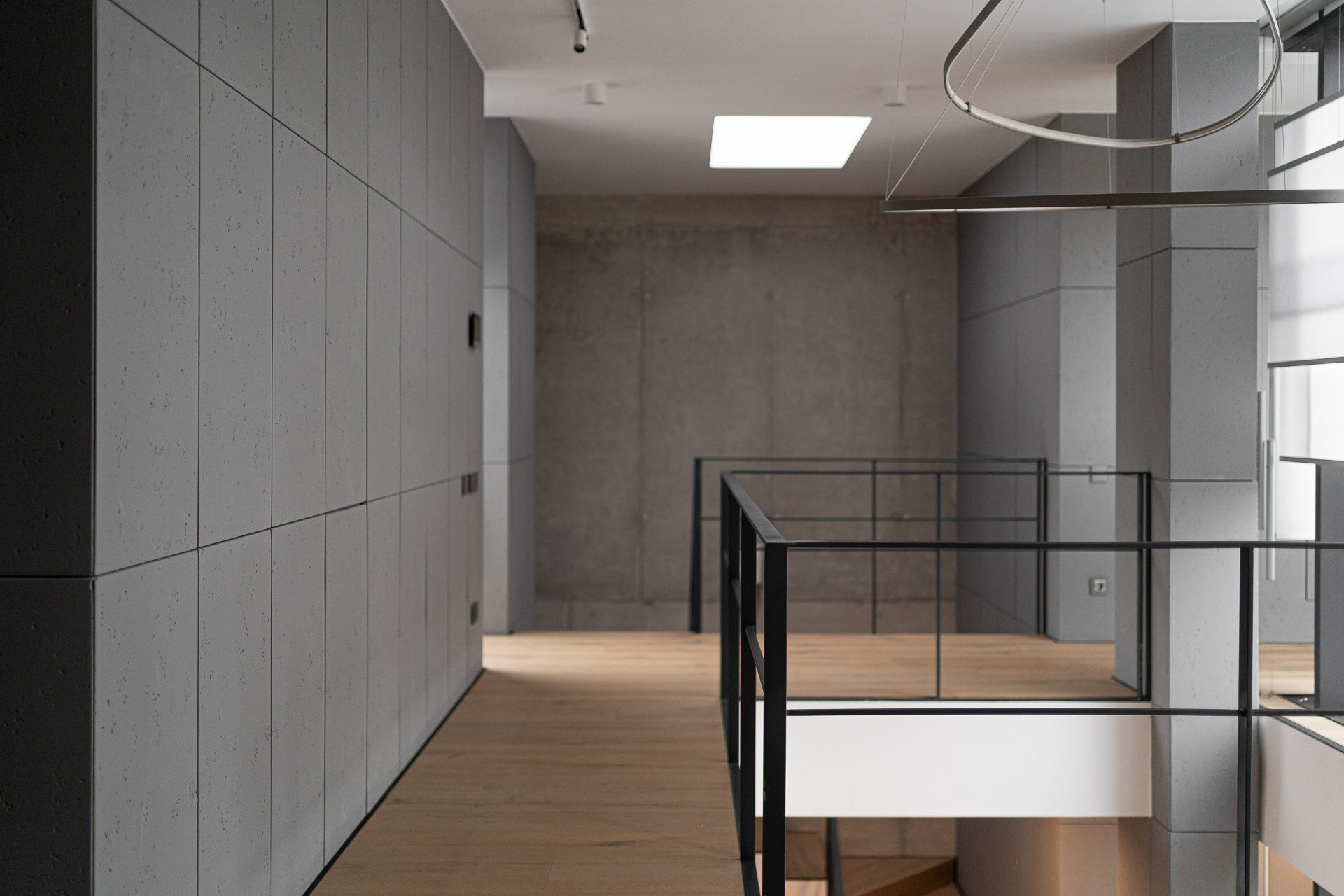Materialele sunt alese pentru capacitatea lor de a genera contrast și profunzime. Betonul aparent conferă structură și austeritate, stabilind o bază solidă pentru arhitectura interioară, în timp ce lemnul cald aduce intimitate și confort, creând echilibrul perfect între rigozitate și familiaritate. Jocul de lumină și umbră accentuează percepția ritmului interior, transformând fiecare moment al zilei într-o experiență diferită și armonioasă.