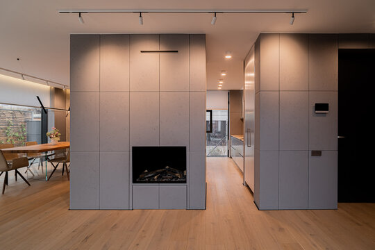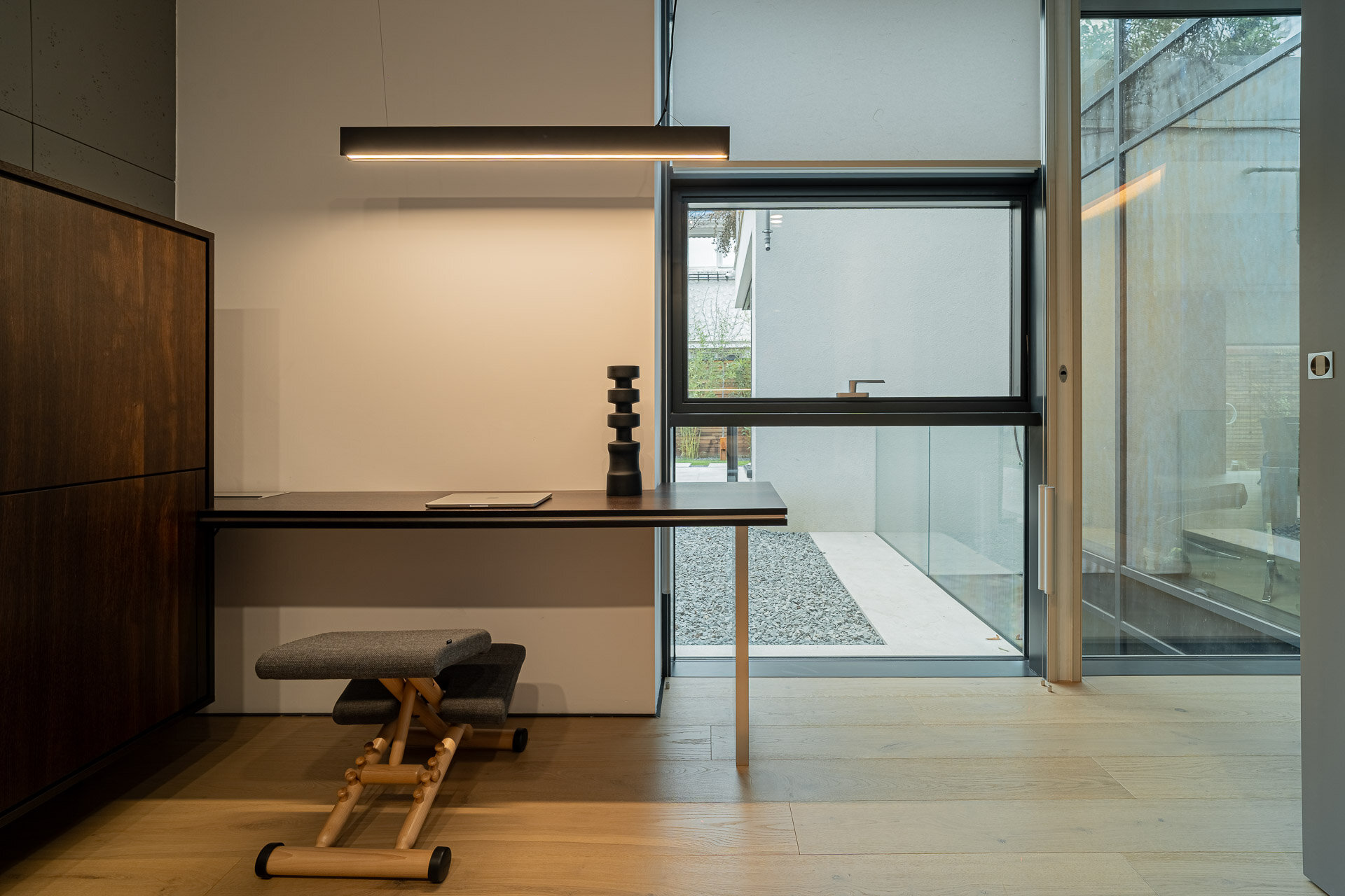Trecerile între spații sunt făcute prin uși filomuro sau în buzunar, astfel încât acestea să fie cât mai discrete. Trecerea de la un material la altul, în cazul modulului central din parter, în care mobilierul cu finisaj de furnir este încadrat între pereți structurali placați, a fost realizată foarte atent, cu îmbinări la 45 de grade, pentru a accentua continuitatea suprafețelor. De asemenea, întoarcerile placărilor de beton sunt realizate tot cu îmbinări la 45 de grade.