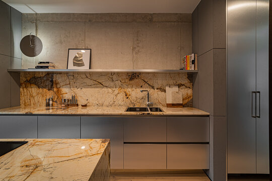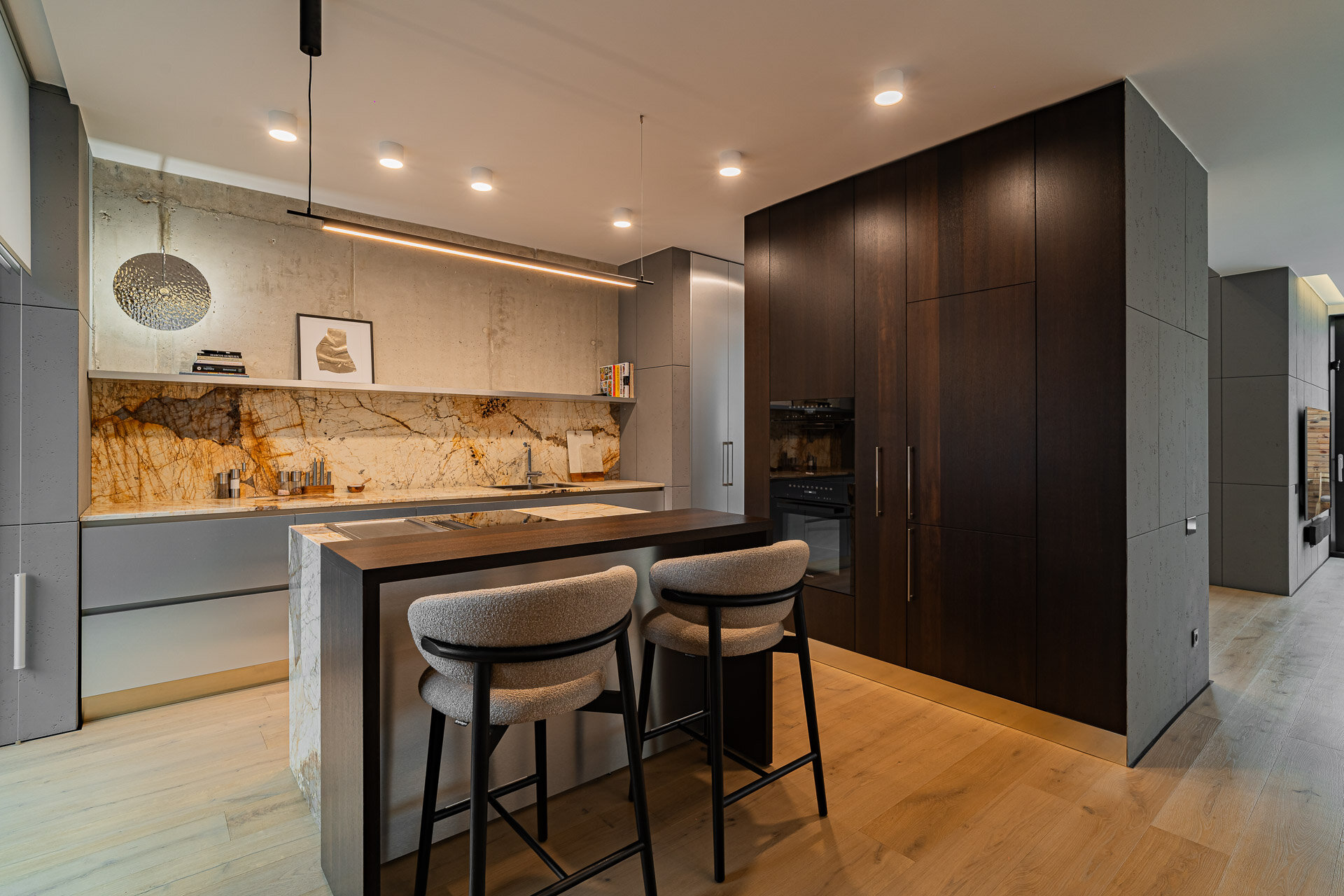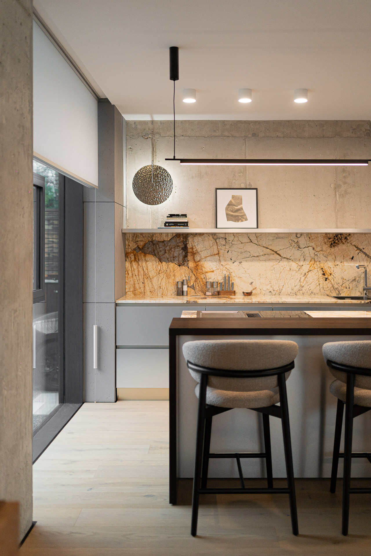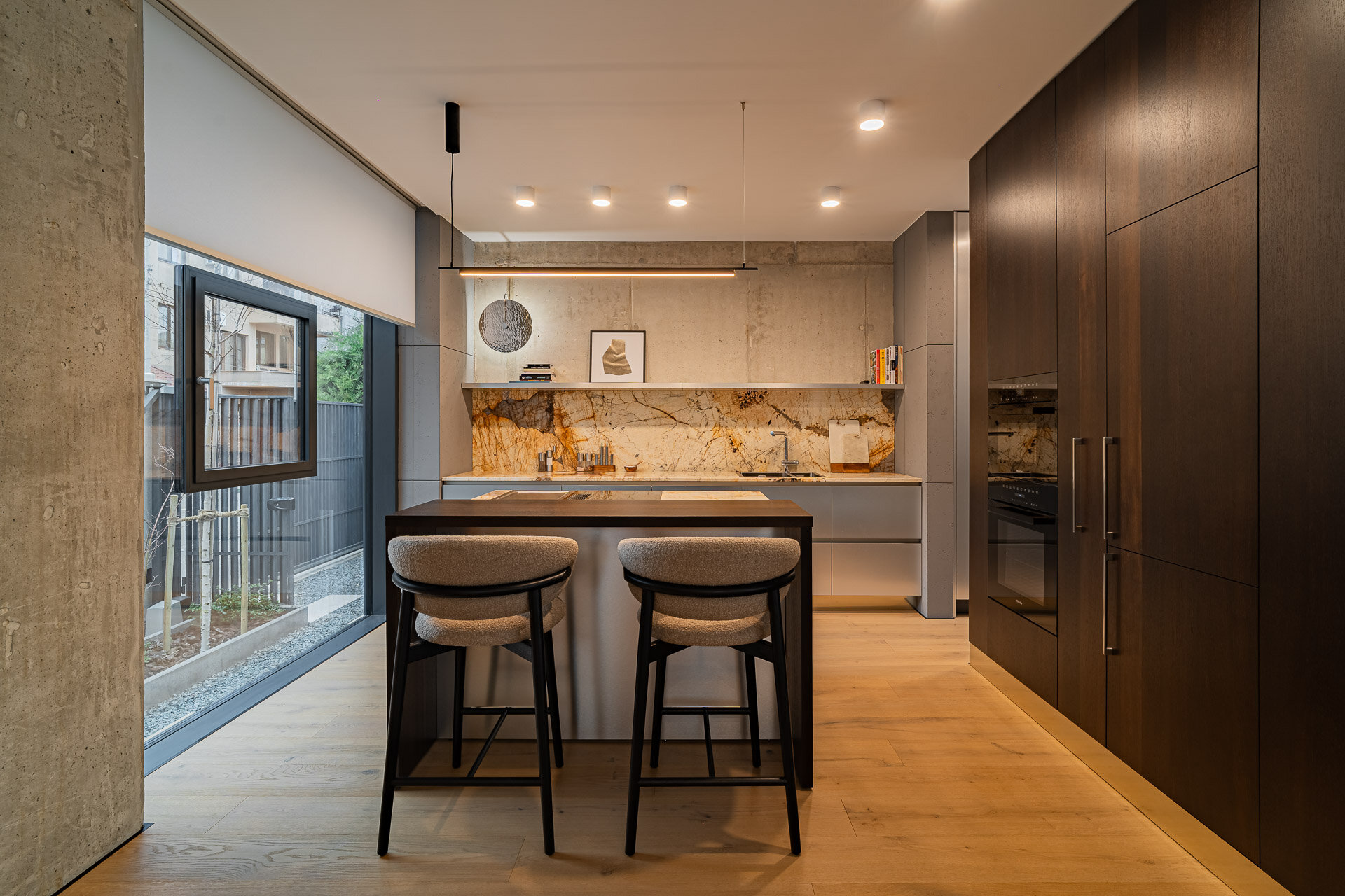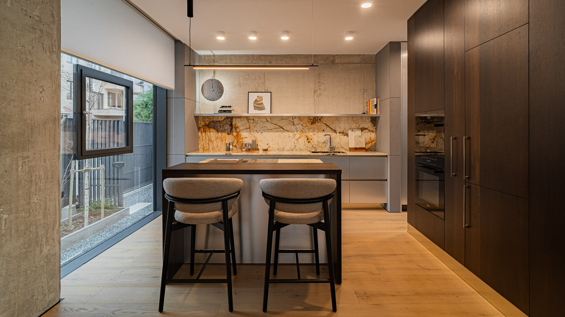 Bucătăria impresionează prin linii curate și materiale naturale care înnobilează mobilierul minimalist. Granitul spectaculos de pe blat și contrablat, furnirul natural și aluminiul se pun în evidență reciproc și creează un spectacol de texturi, atât vizual, cât și tactil. Este un spațiu gândit nu doar pentru gătit, ci pentru a fi trăit — cald, primitor, eficient.