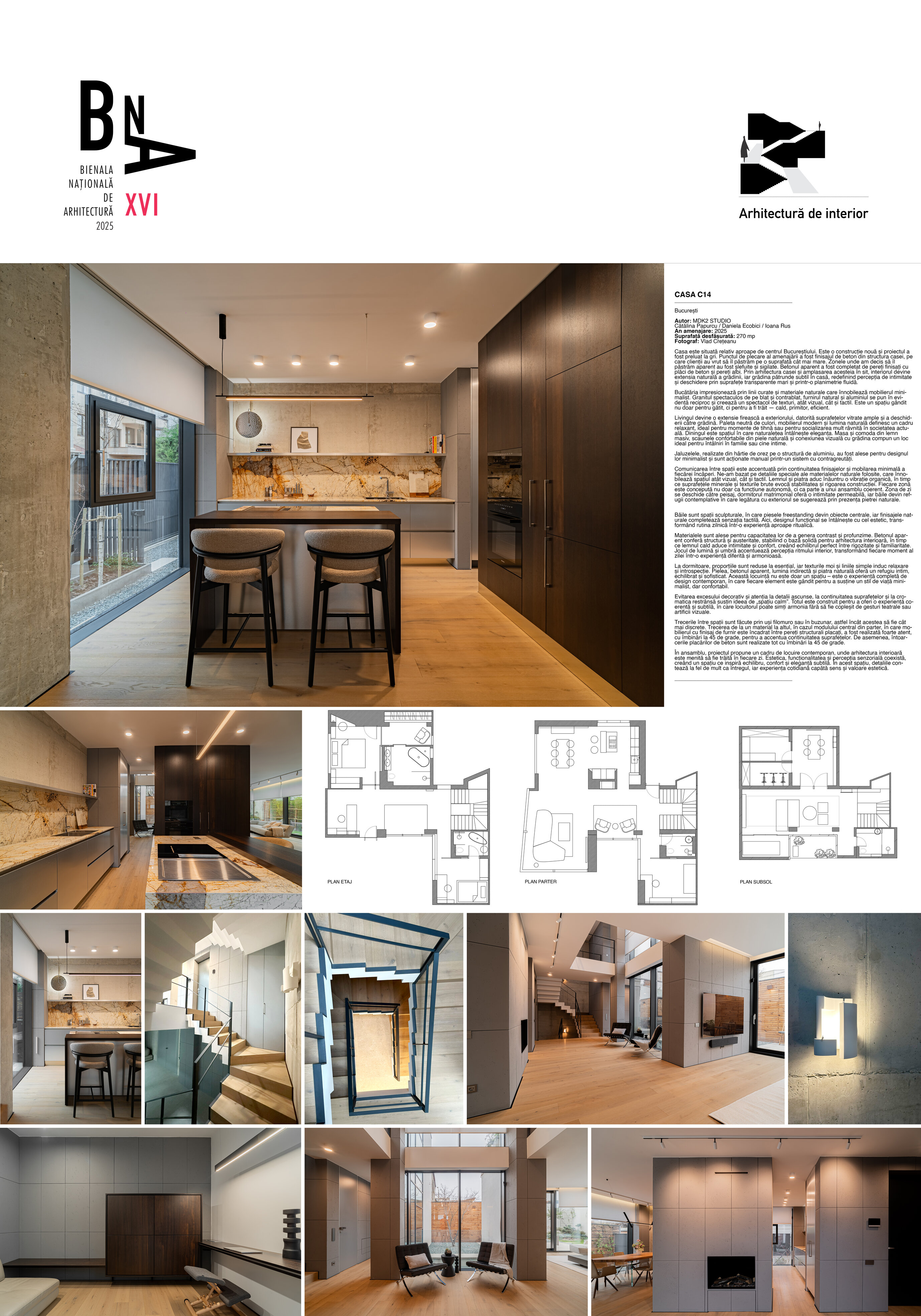 Casa este situată relativ aproape de centrul Bucureștiului. Este o construcție nouă și proiectul a fost preluat la gri. Punctul de plecare al amenajării a fost finisajul de beton din structura casei, pe care clienții au vrut să îl păstrăm pe o suprafață cât mai mare. Zonele unde am decis să îl păstrăm aparent au fost șlefuite și sigilate. Betonul aparent a fost completat de pereți finisați cu plăci de beton și pereți albi. Prin arhitectura casei și amplasarea acesteia în sit, interiorul devine extensia naturală a grădinii, iar grădina pătrunde subtil în casă, redefinind percepția de intimitate și deschidere prin suprafețe transparente mari și printr-o planimetrie fluidă.