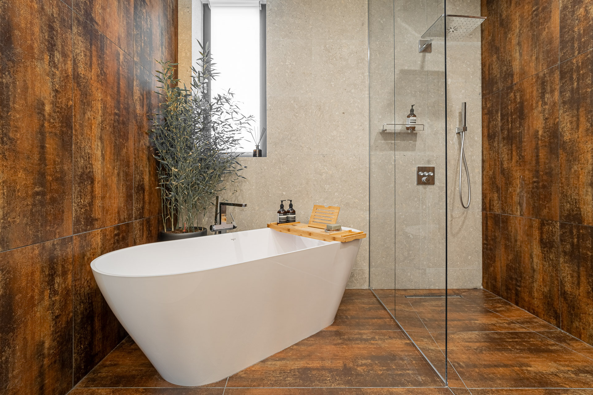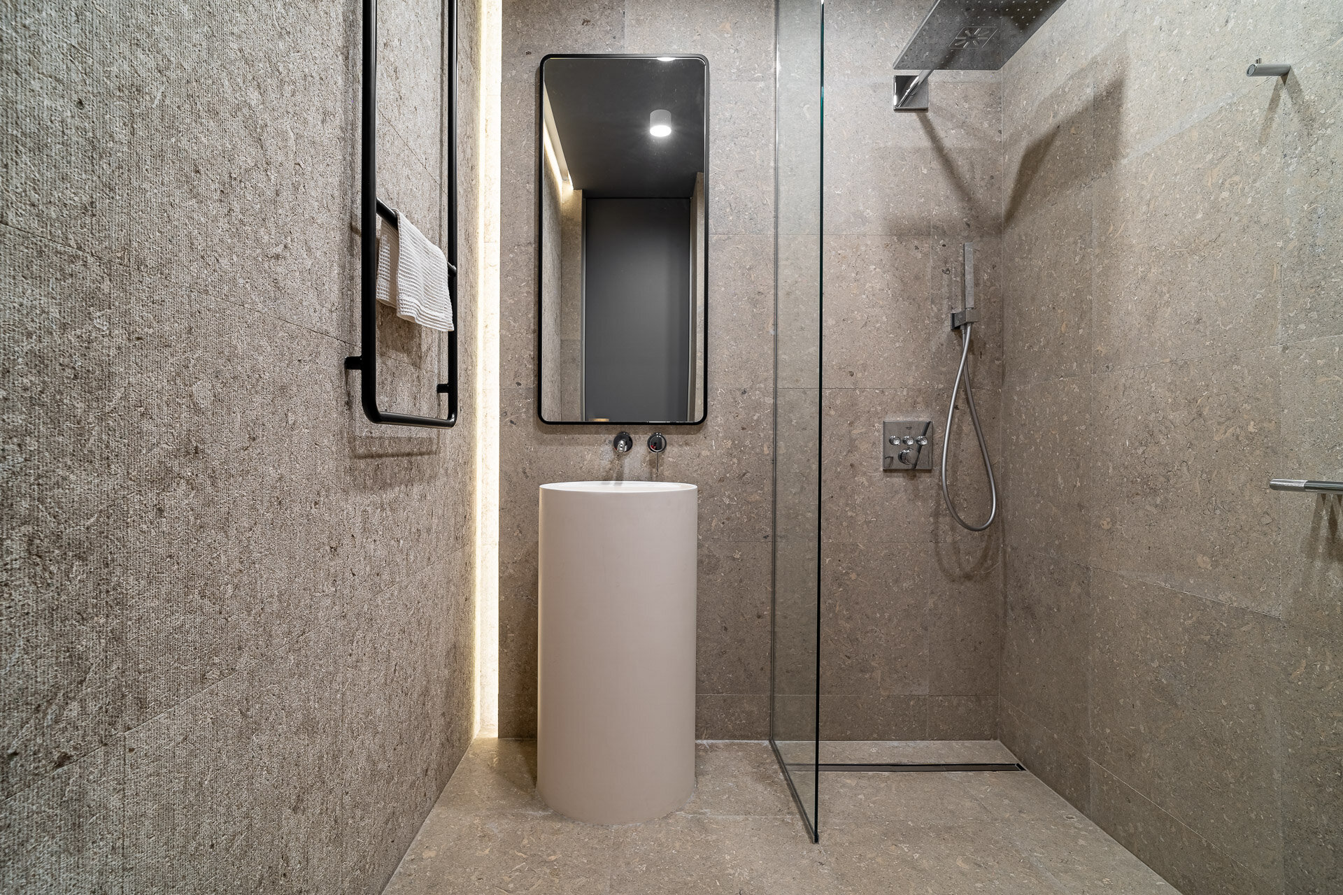 Băile sunt spații sculpturale, în care piesele freestanding devin obiecte centrale, iar finisajele naturale completează senzația tactilă. Aici, designul funcțional se întâlnește cu cel estetic, transformând rutina zilnică într-o experiență aproape ritualică.