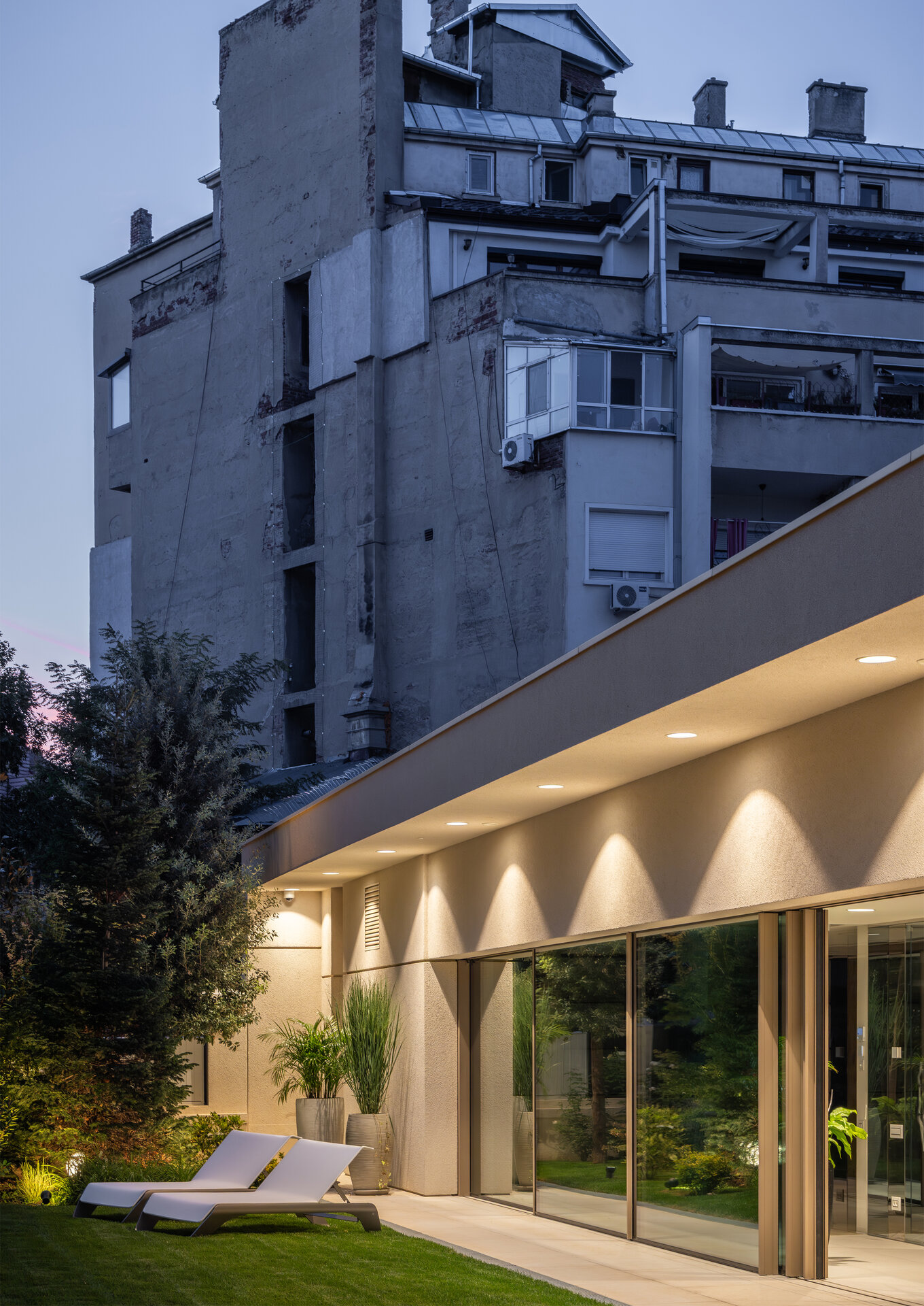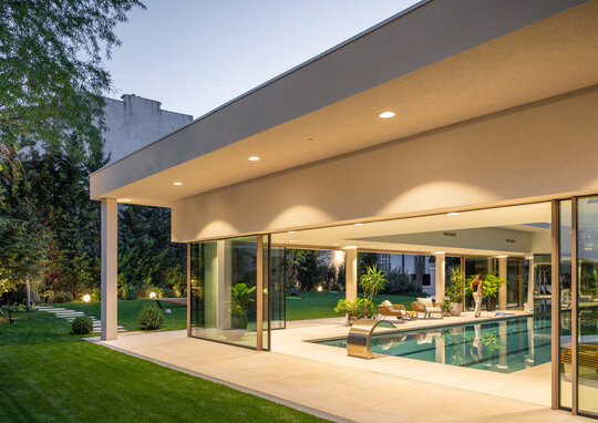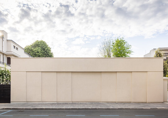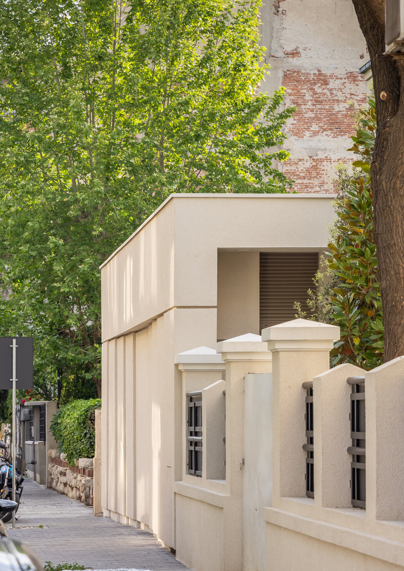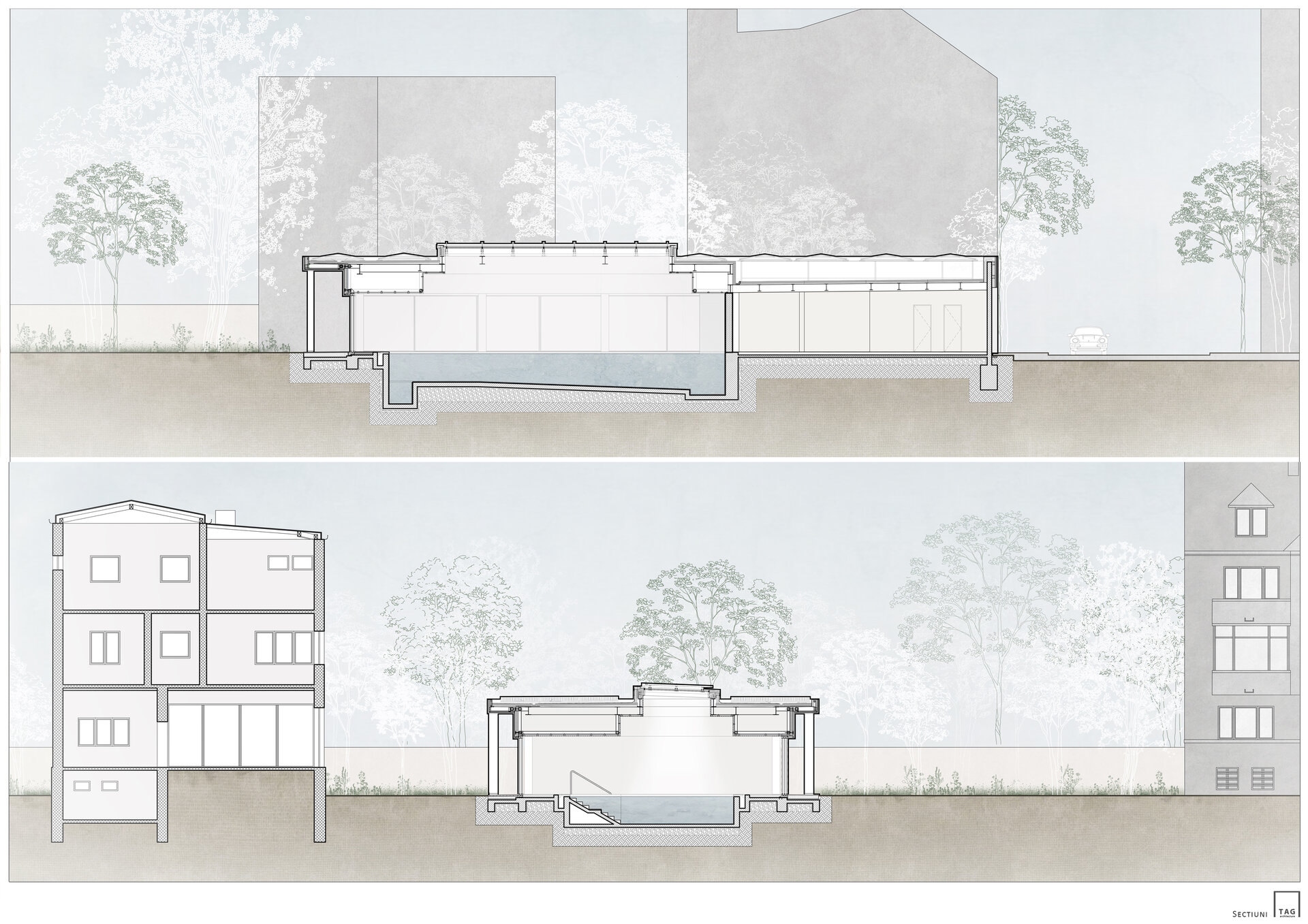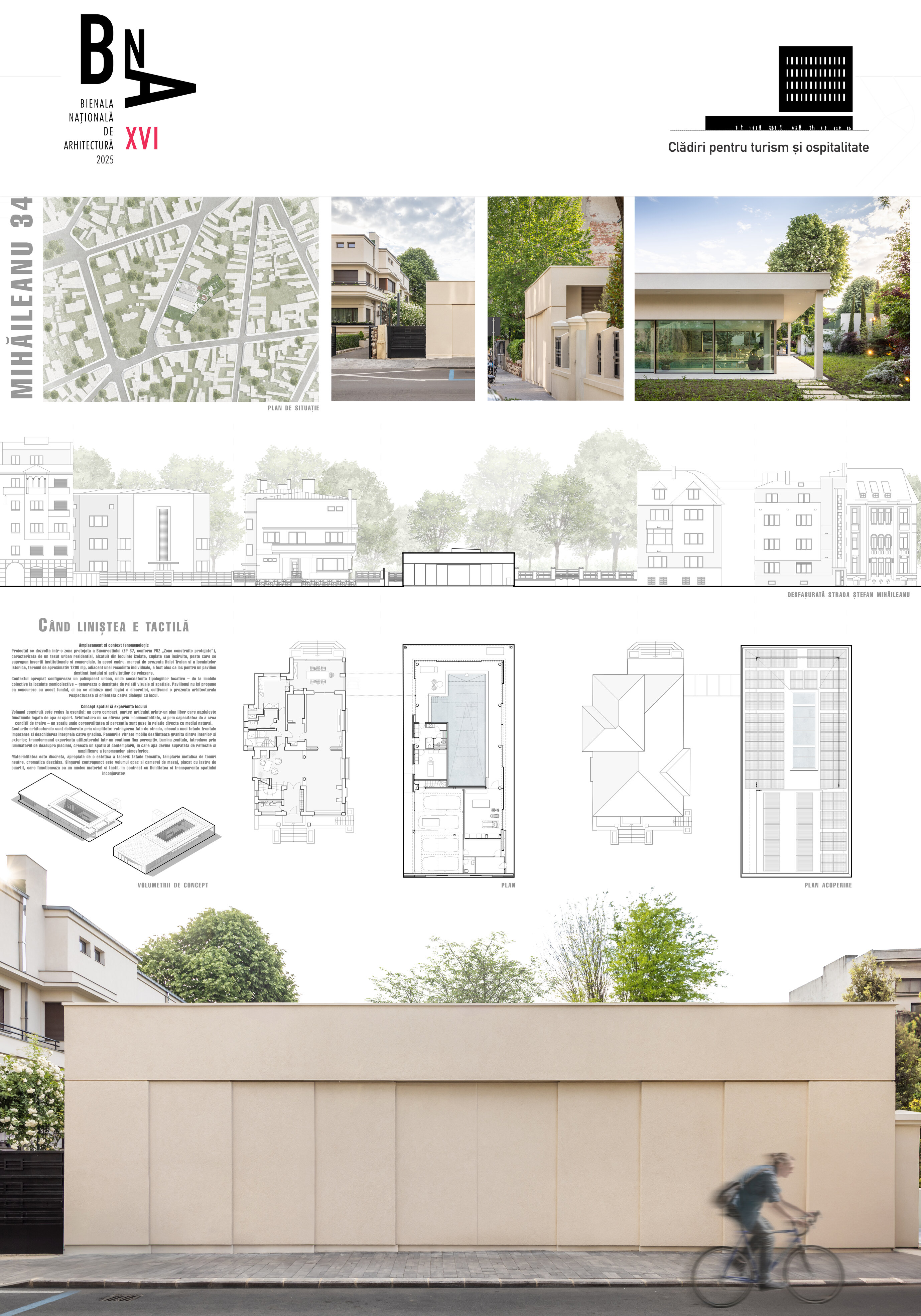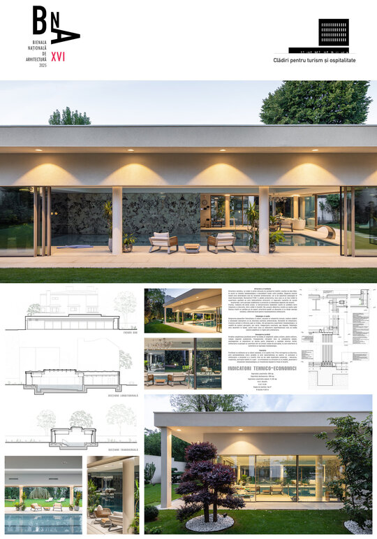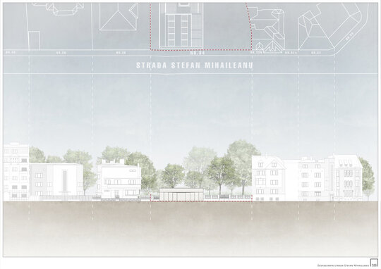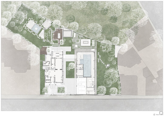 Pentru comunicarea directă cu imobilul valoros patrimoniului arhitectural alăturat, a cărui rigoare și echilibru compozițional le preia prin liniile volumului clare și simple, gesturile arhitecturale ale volumului nostru sunt mai degrabă nepretențioase, însă respectuoase cu contextul construit. Astfel, se retrage de la stradă, prin închiderea fațadei de pe aliniament, accesul auto în garaj fiind preluat prin interiorul proprietății; către grădină întregul spațiu este deschis: pereții exteriori sunt panouri ample mobile de sticlă, planșeul peste piscină este înlocuit cu un luminator.