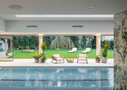Terenul pe care a fost construit acest mic pavilion pentru înot și sport are o suprafață de cca 1200 mp și deservește locuința individuală a clientului nostru, adiacentă lotului.