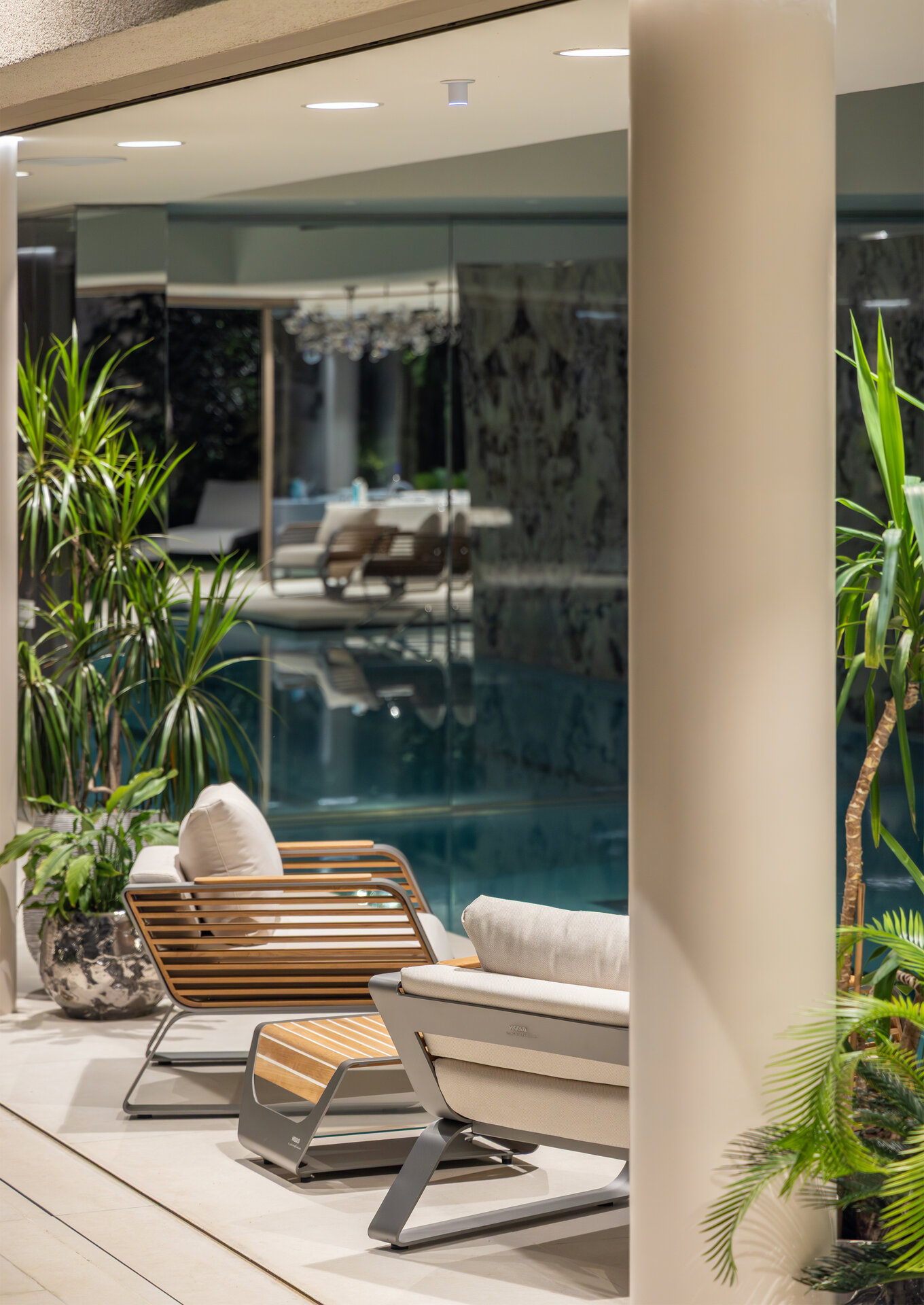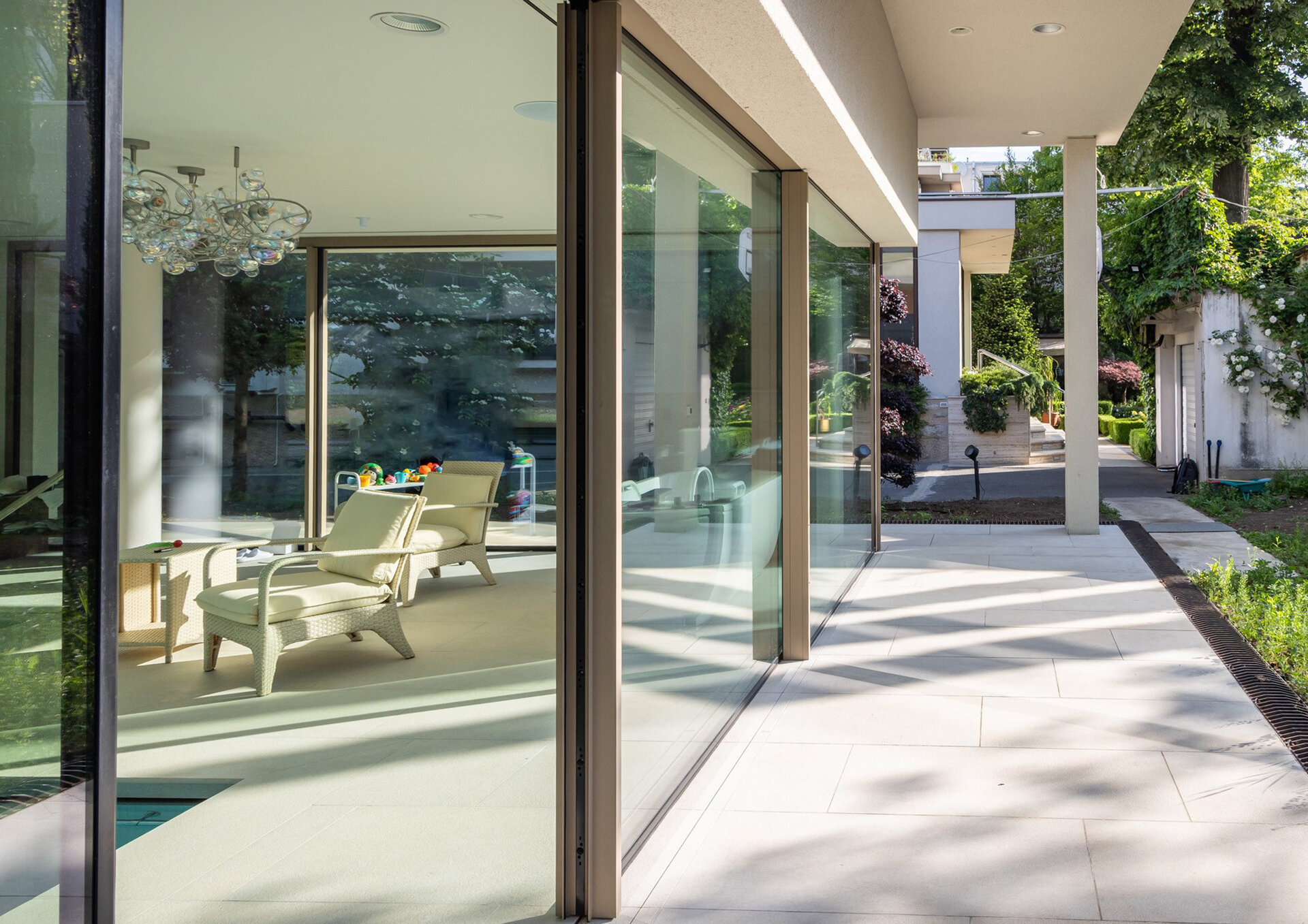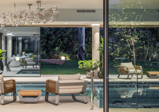 Tâmplăria este din aluminiu culoare bronz auriu, sticlă tripan, cu deschidere amplă, astfel încât întregul interior să fie deschis grădinii.