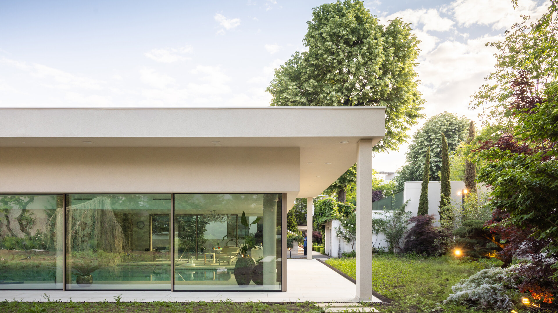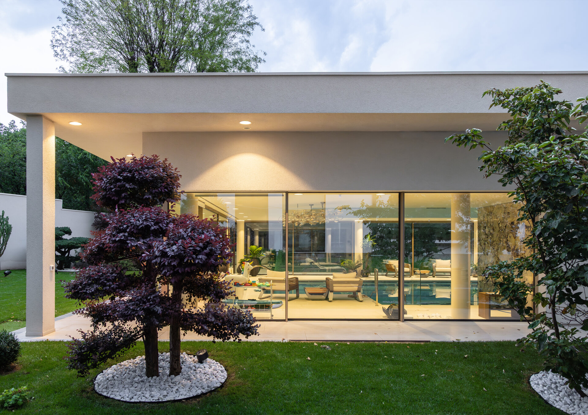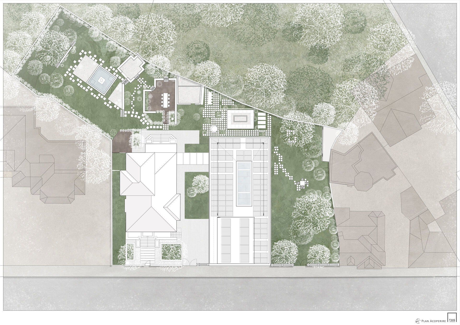 Amenajarea peisagistică este complementară celei de pe proprietatea locuinței individuale, cu peluze extinse și plante solitare, volume sculpturale.