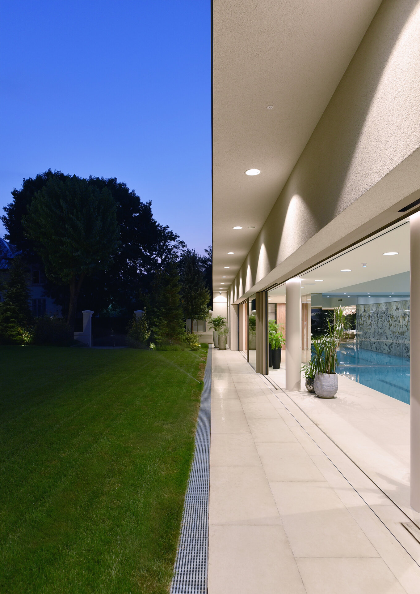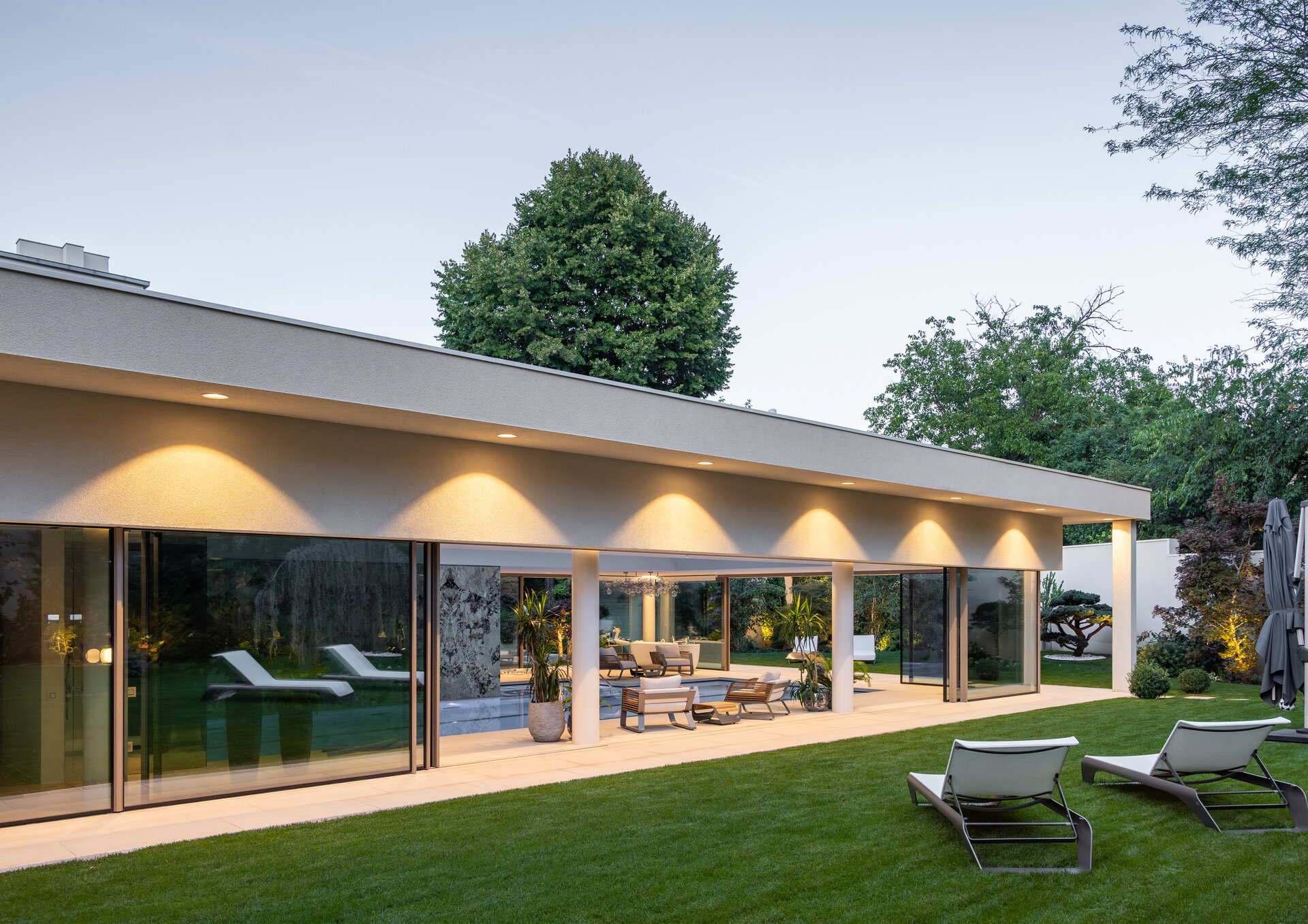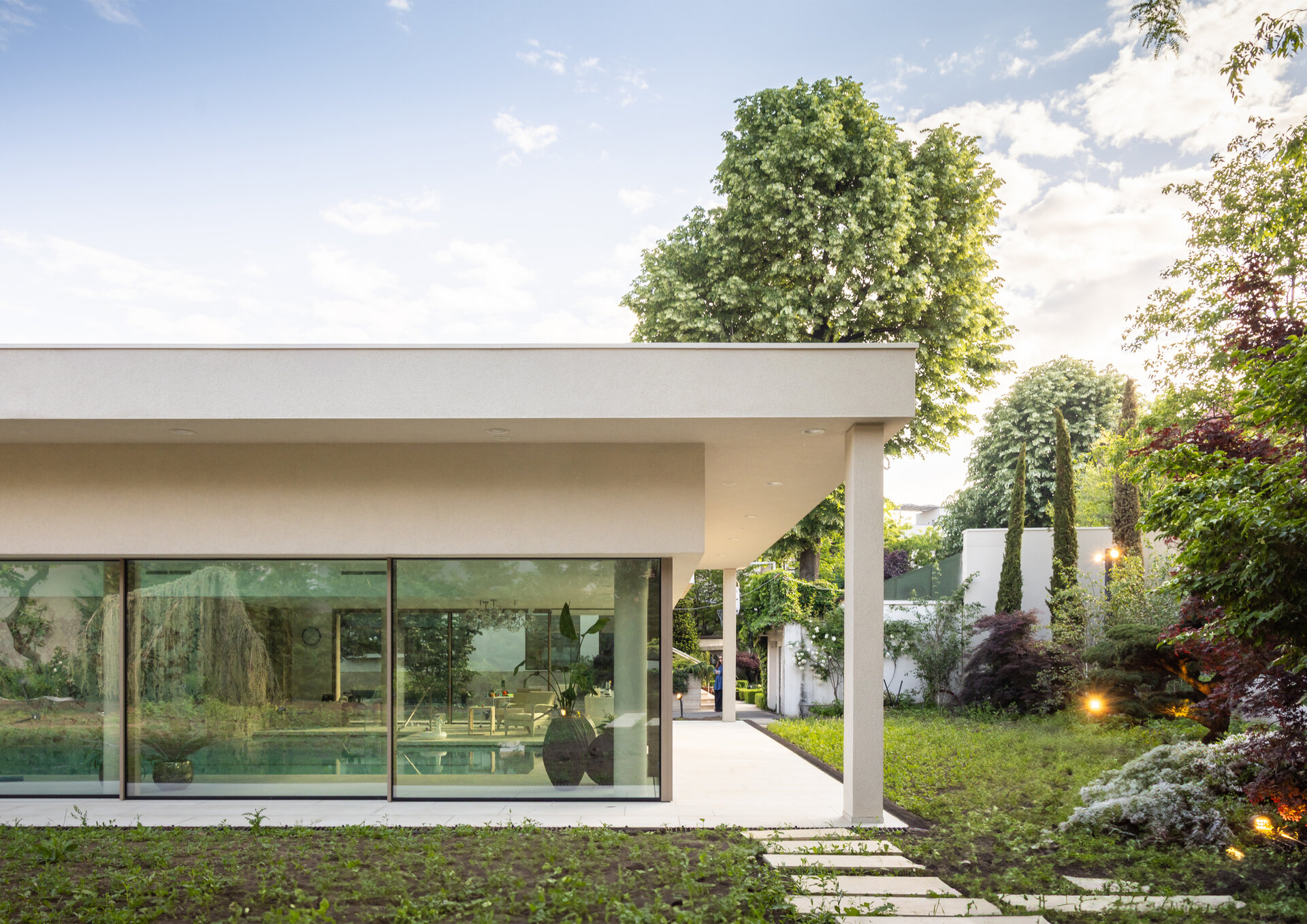 Amenajarea peisagistică este complementară celei de pe proprietatea locuinței individuale, cu peluze extinse și plante solitare, volume sculpturale.