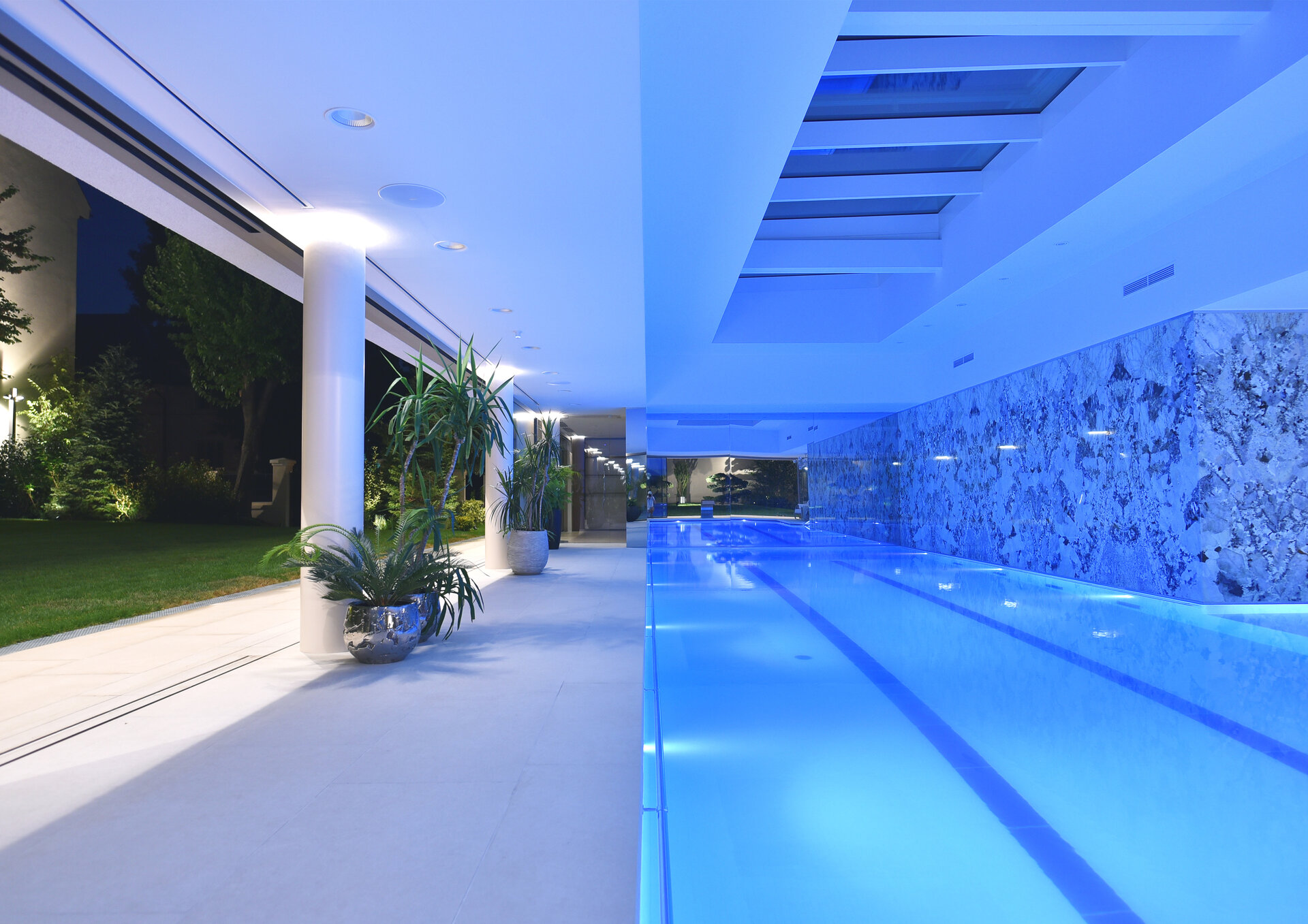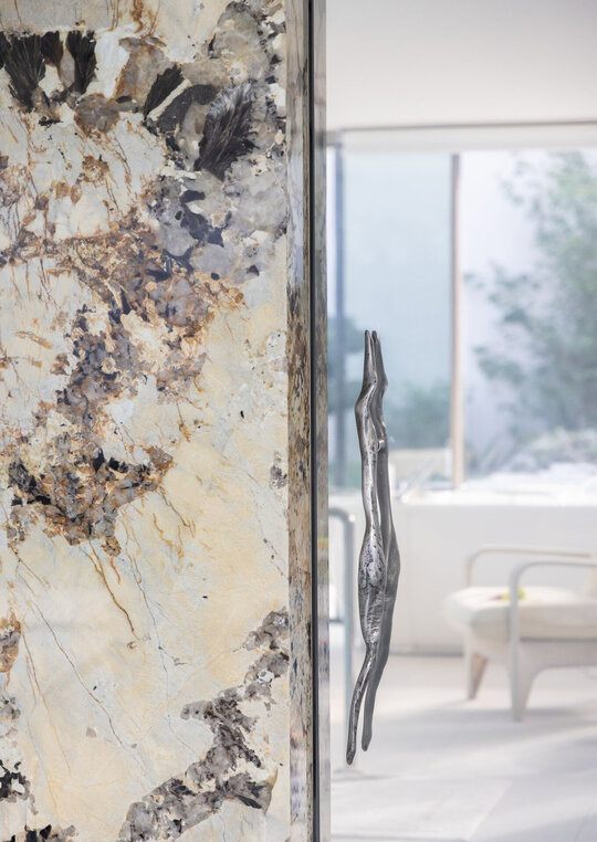 Finisajele interioare sunt alese într-o cromatică deschisă, fără accente de culoare sau volum. Elementul care așază camera mare este spațiul opac al camerei de masaj, acoperit cu plăci corpul de lastre de cuarțit.