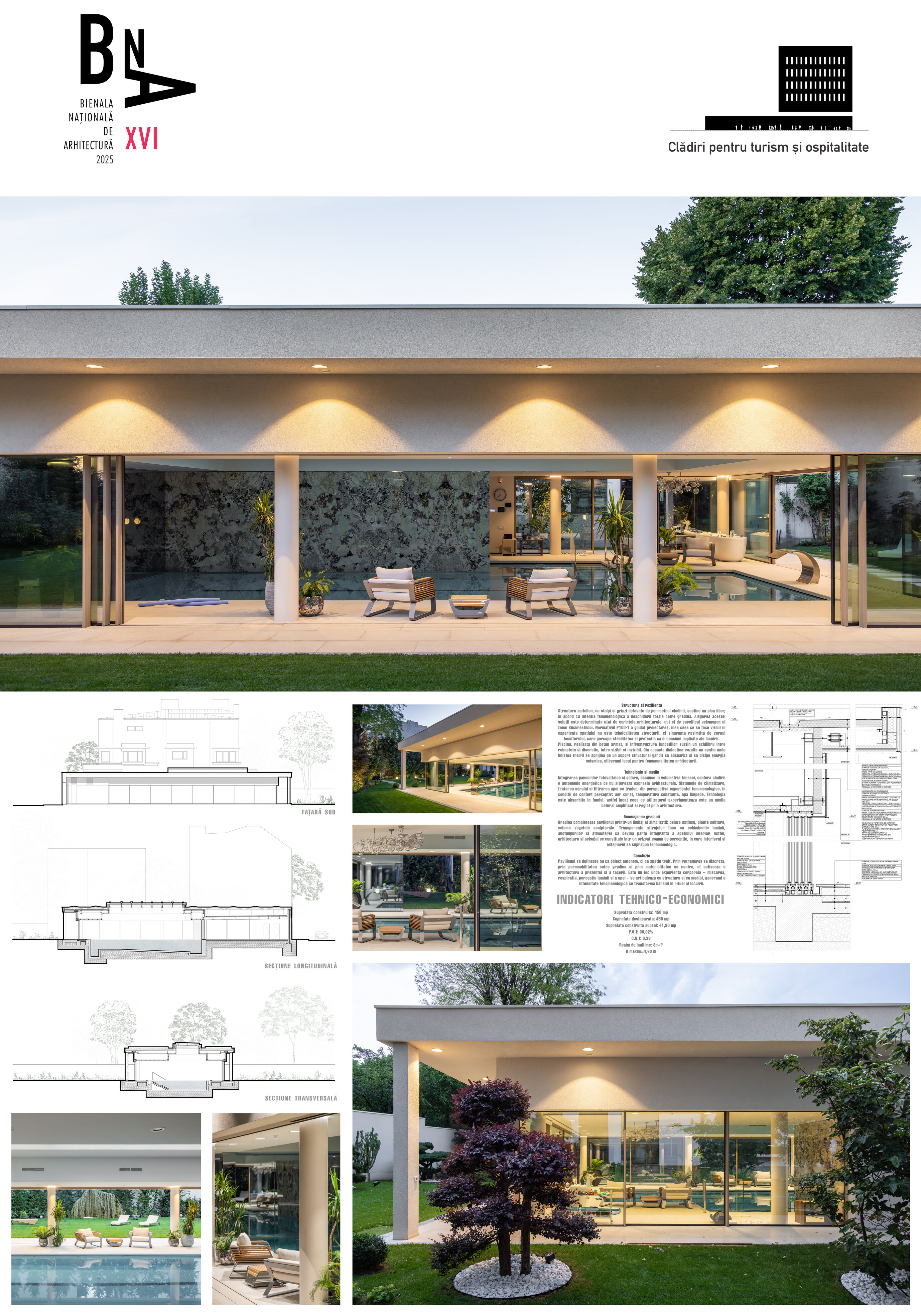 Învelitoarea terasei este circulabilă și susține sistemele de panouri fotovoltaice și solare, ascunse în volumetria pavilionului.