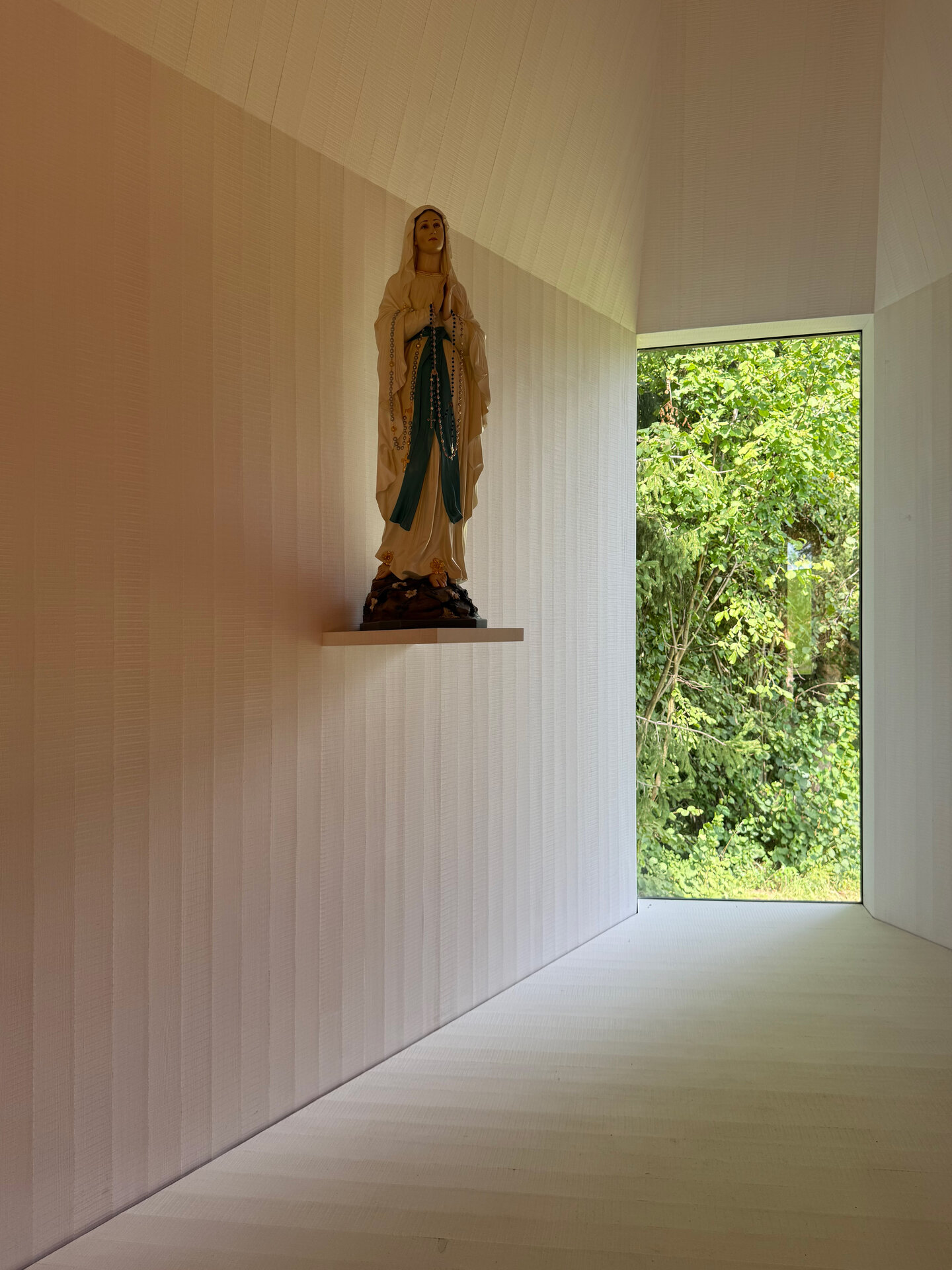 Esențializată — cu minimul necesar pentru definirea sacrului — capela, cu liniștea sa profundă, invocă prezența divină și susține întâlnirea dintre pământ și cer, dintre om și Divin, în sensul tetradei la care face referire Heidegger. Arhitectura se retrage, iar omul și relația cu Divinul rămân în centru.