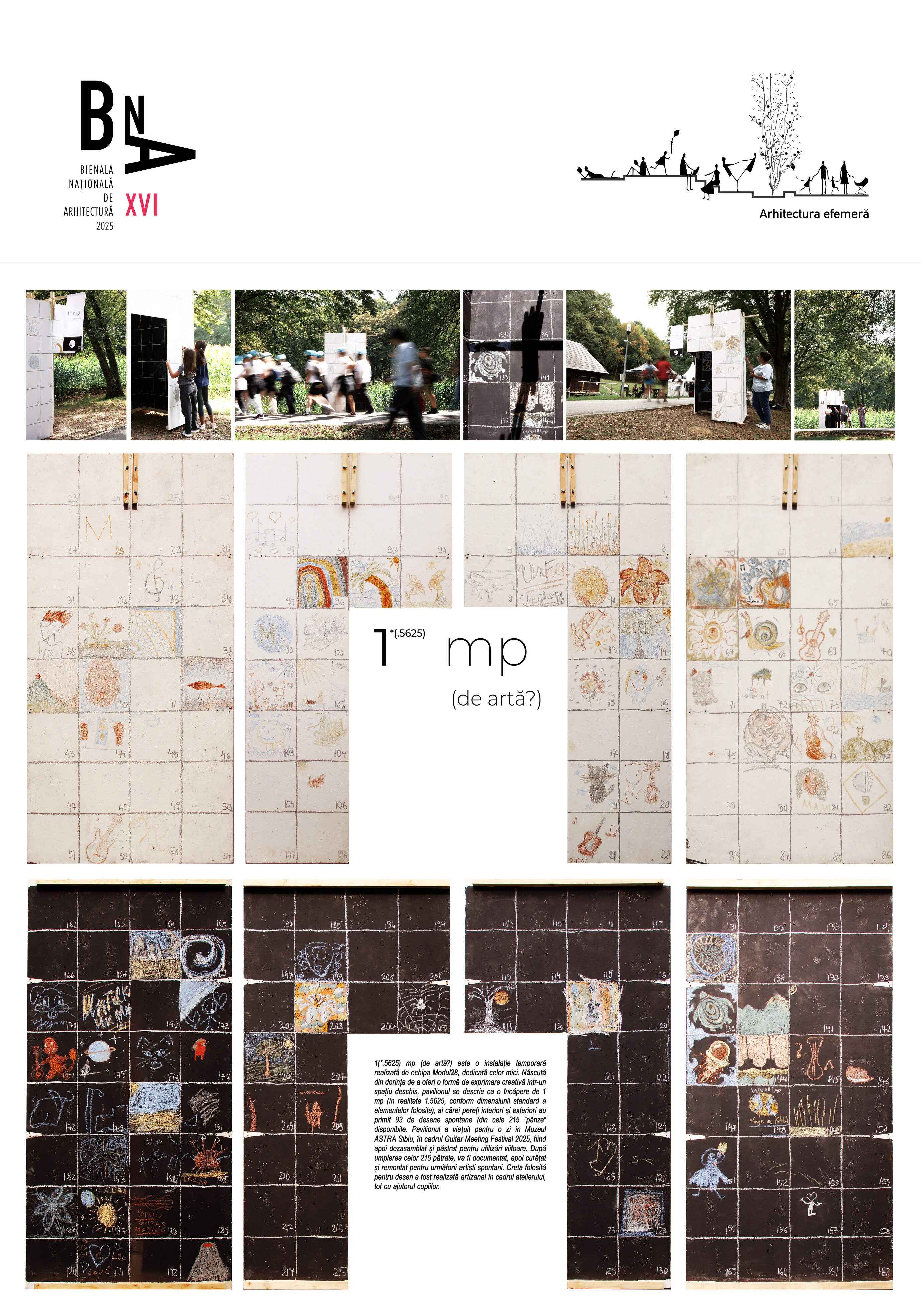 1(*.5625) mp (de artă?) este o instalație temporară realizată de echipa Modul28, dedicată celor mici. Născută din dorința de a oferi o formă de exprimare creativă într-un spațiu deschis, pavilionul se descrie ca o încăpere de 1 mp (în realitate 1.5625, conform dimensiunii standard a elementelor folosite), ai cărei pereți interiori și exteriori au primit 93 de desene spontane (din cele 215 "pânze" disponibile. Pavilionul a viețuit pentru o zi în Muzeul ASTRA Sibiu, în cadrul Guitar Meeting Festival 2025, fiind apoi dezasamblat și păstrat pentru utilizări viitoare. După umplerea celor 215 pătrate, va fi documentat, apoi curățat și remontat pentru următorii artiști spontani. Creta folosită pentru desen a fost realizată artizanal în cadrul atelierului, tot cu ajutorul copiilor.