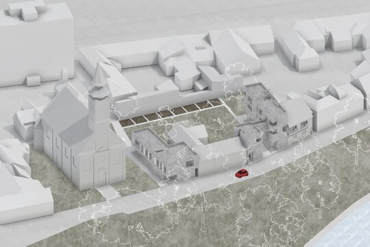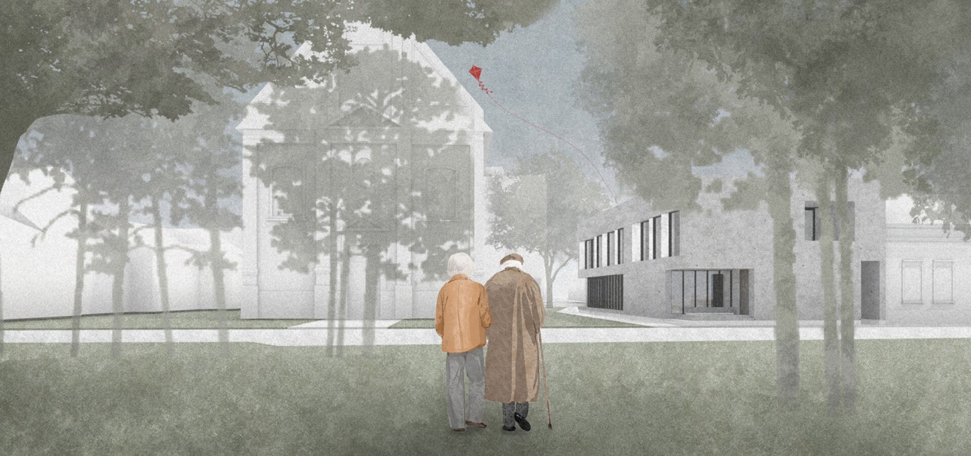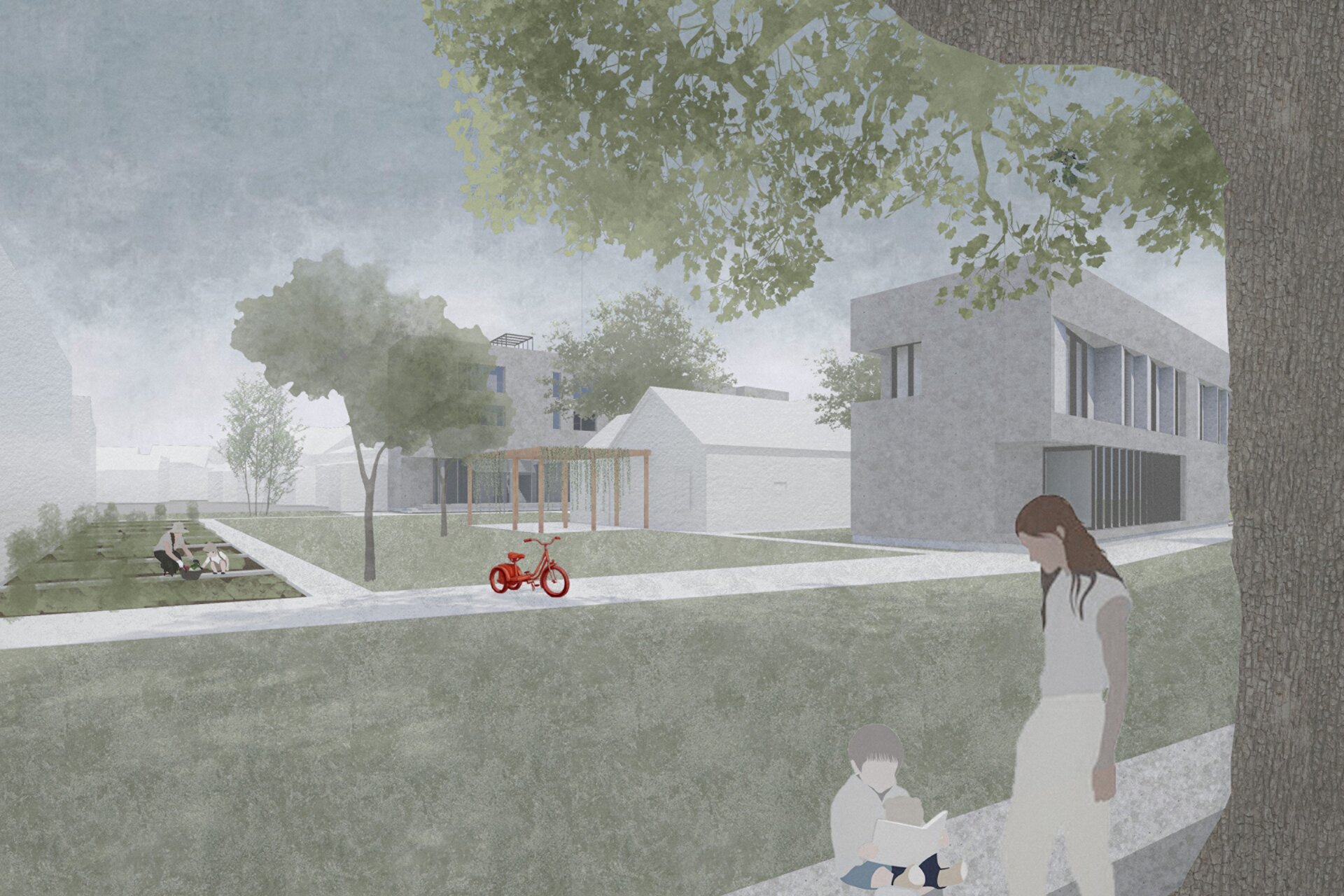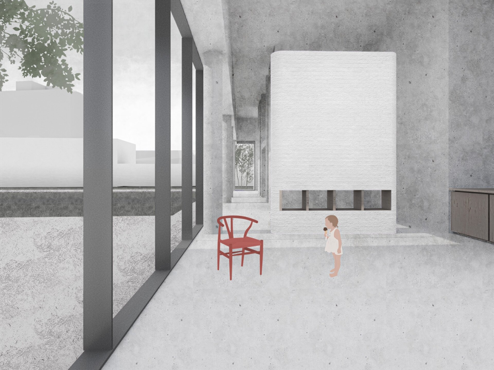 La parterul clădirii aflate în vecinătatea bisericii Olosig, am introdus un spațiu flexibil - o zonă deschisă concepută pentru a găzdui o gamă largă de utilizări, de la expoziții și ateliere la întâlniri informale și evenimente spontane. Punctul său forte constă în adaptabilitatea sa, permițându-i să răspundă nevoilor în continuă evoluție ale comunității și să sprijine diverse forme de exprimare, învățare și interacțiune. Situat la nivelul strazii, spațiul asigură accesibilitate și vizibilitate, acționând ca un prag discret între domeniul public și viața interioară mai privată a ansamblului. În acest fel, devine un catalizator pentru dialog și conexiune- un spațiu suspendat între rutină și spontan, între intimitate și experiență colectivă. Am integrat funcții publice, private și colective într-o compoziție coerentă, cu scopul de a încuraja interacțiunea, colaborarea și, de asemenea, retragerea liniștită. În partea din spate a amplasamentului se află o grădină versatila, concepută ca o extensie emoțională a locuirii- unde locuitorii temporari pot planta, îngriji și recolta, lăsându-si în urmă amprenta nu doar prin prezență fizică, ci și prin gesturi zilnice mici și semnificative.