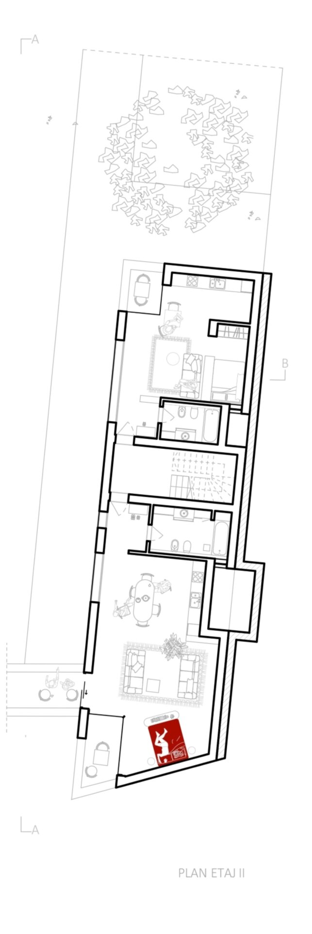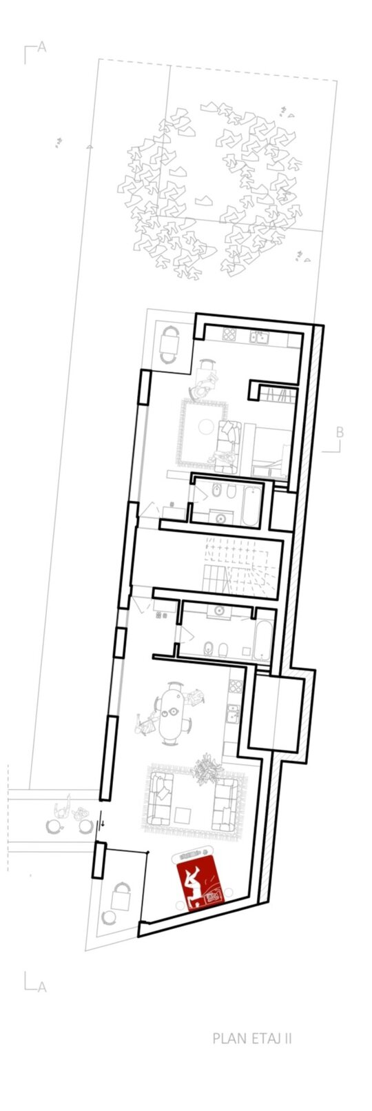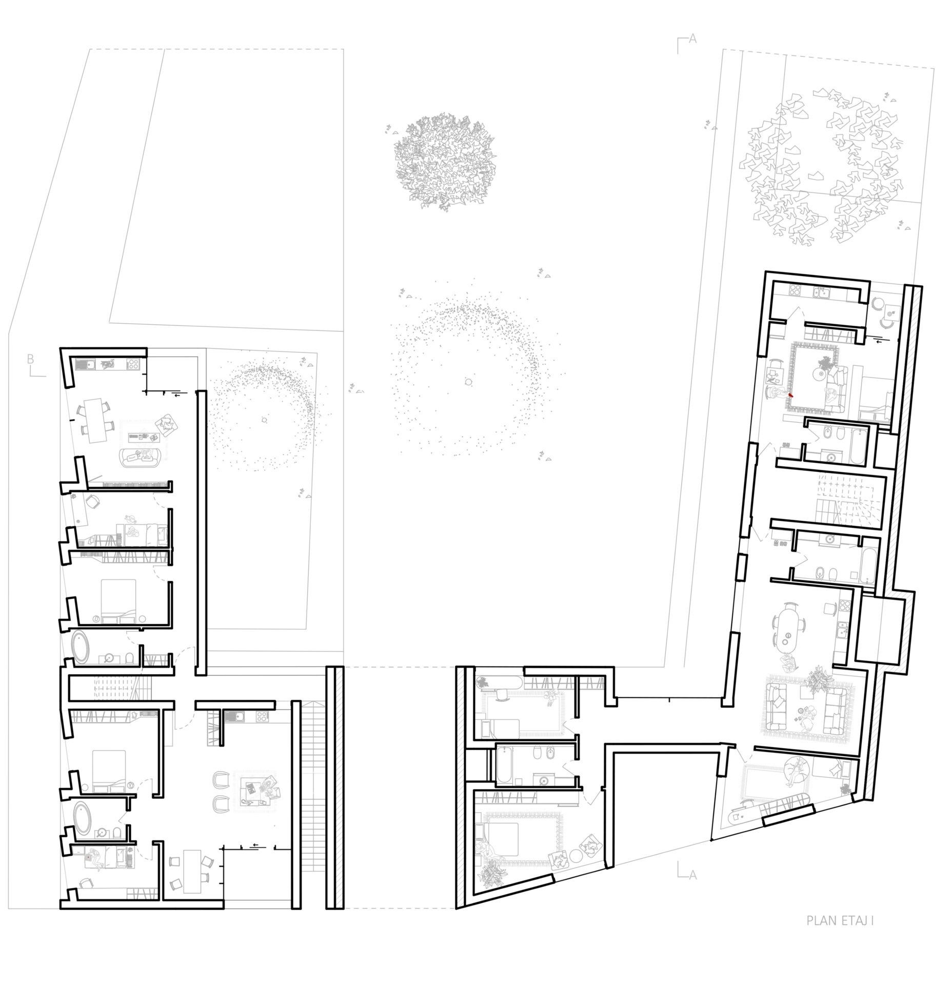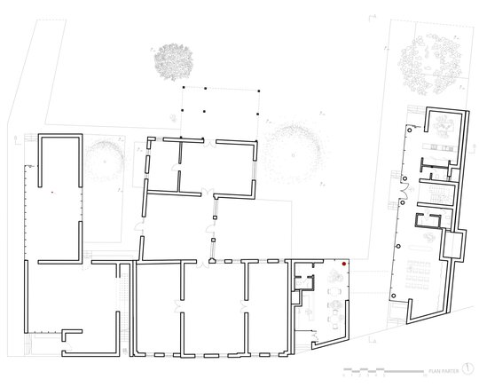 Cele trei volume noi se aliniază cu țesătura urbană existentă sprijinindu-se pe calcane, completând discret fațada străzii. Am imaginat aceste clădiri ca niște blocuri monolitice de beton expus, sculptate pentru a crea loggii și deschideri care permit luminii să pătrundă generos în interior, menținând în același timp o anumită reținere față de stradă. Spațiile private se deschid larg spre curtea interioară, unde vegetația formează un mediu de viață, traversat ocazional de alei.