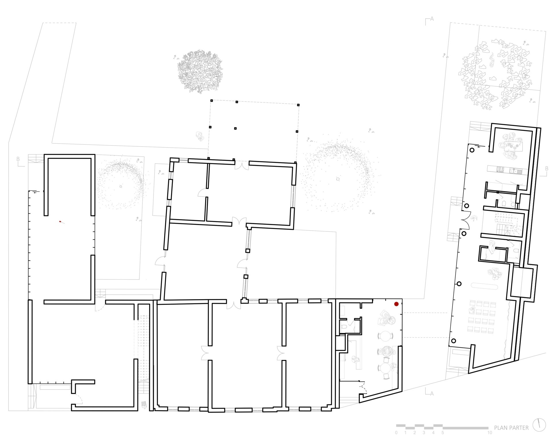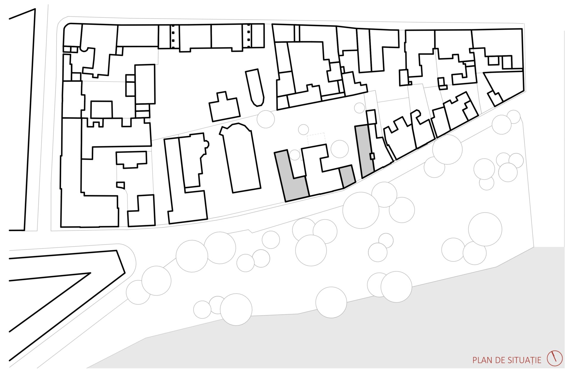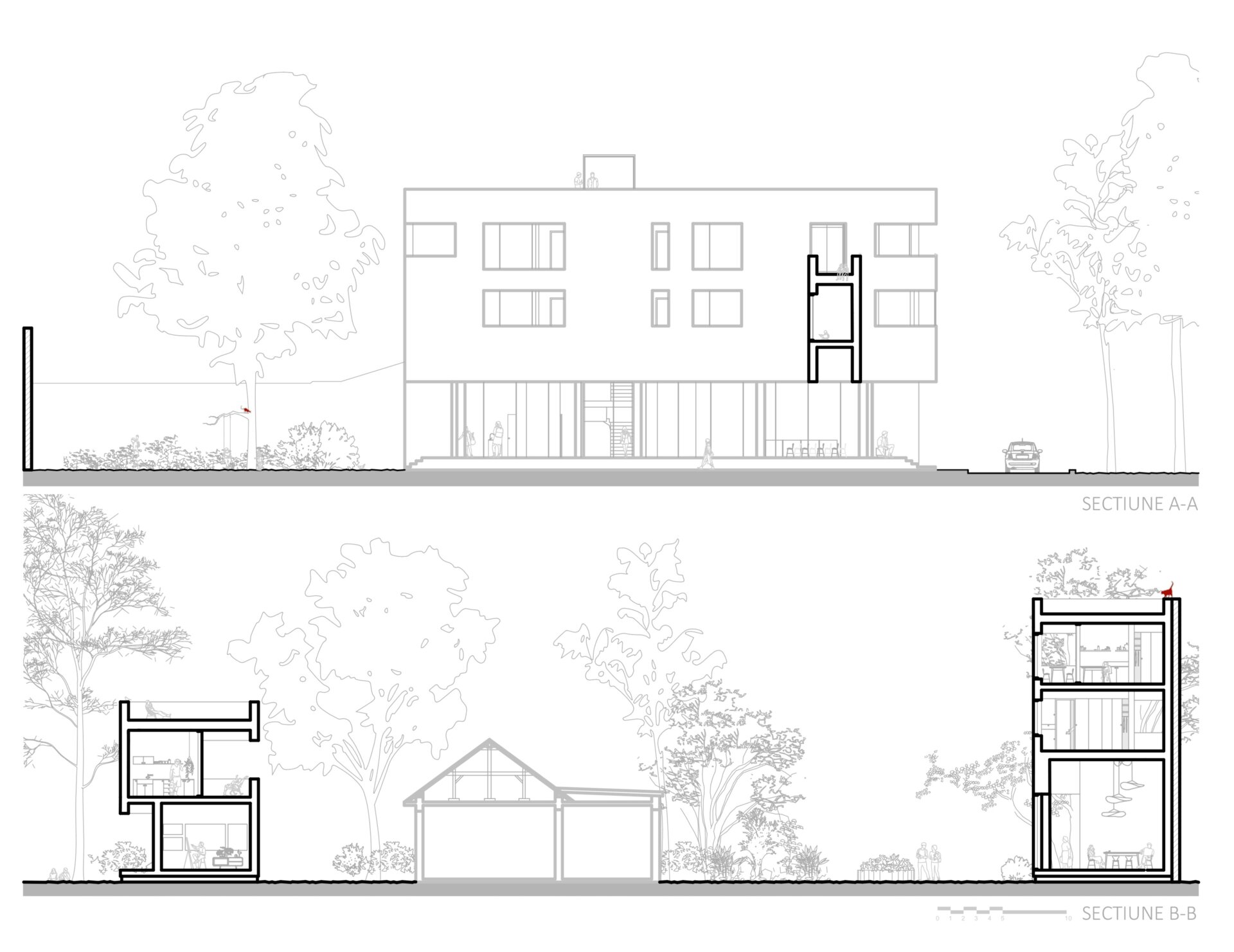 Cele trei volume noi se aliniază cu țesătura urbană existentă sprijinindu-se pe calcane, completând discret fațada străzii. Am imaginat aceste clădiri ca niște blocuri monolitice de beton expus, sculptate pentru a crea loggii și deschideri care permit luminii să pătrundă generos în interior, menținând în același timp o anumită reținere față de stradă. Spațiile private se deschid larg spre curtea interioară, unde vegetația formează un mediu de viață, traversat ocazional de alei.